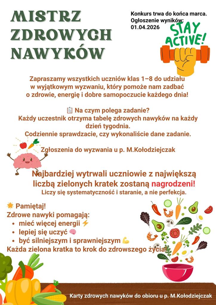 Zapraszamy wszystkie dzieci klas 1- 8 do udziału w naszym wyjątkowym wyzwaniu! Każdego dnia będziemy wspólnie wykonywać proste zadania, które pomogą nam dbać o zdrowie – np. zjeść porcję warzyw, wypić odpowiednią ilość wody czy spędzić czas aktywnie na świeżym powietrzu.