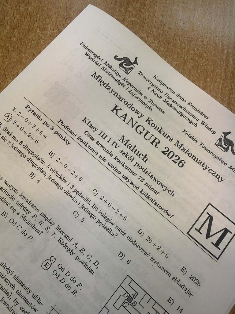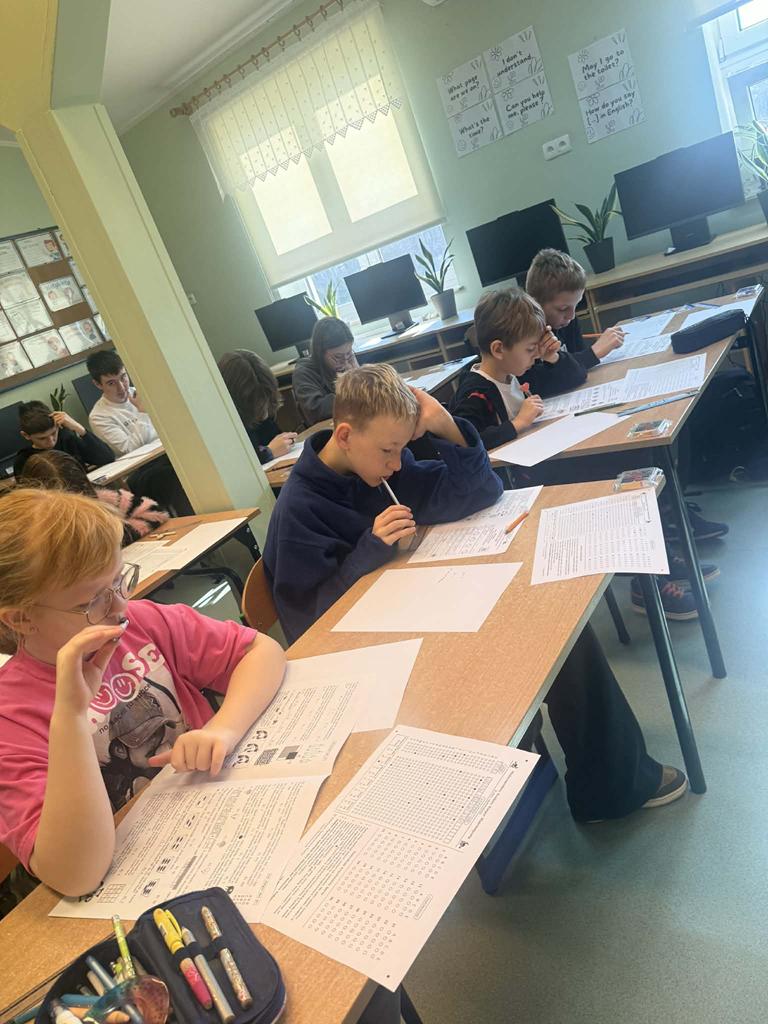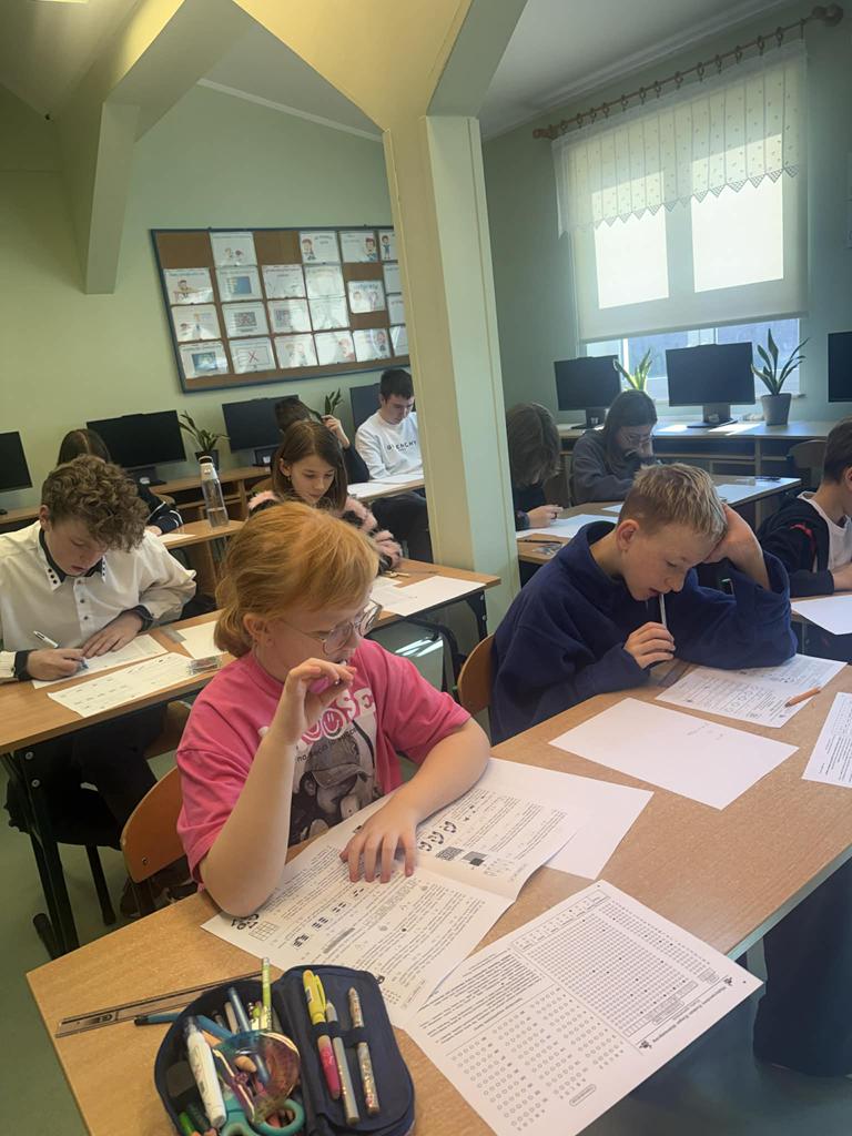 W dniu 19 marca 2026r. wybrani uczniowie klas II-VIII wzięli udział w Międzynarodowym Konkursie Matematycznym „Kangur”. Uczestnicy pisali testy w różnych kategoriach wiekowych, mierząc się z ciekawymi i wymagającymi zadaniami, które rozwijają logiczne myślenie oraz umiejętności matematyczne. Każdy z uczestników otrzymał drobny upominek – pokręconą układankę, będącą pamiątką udziału w konkursie.