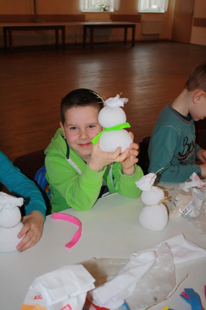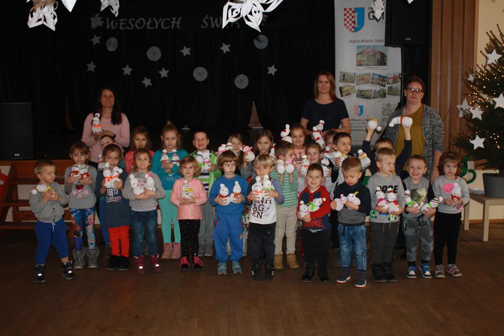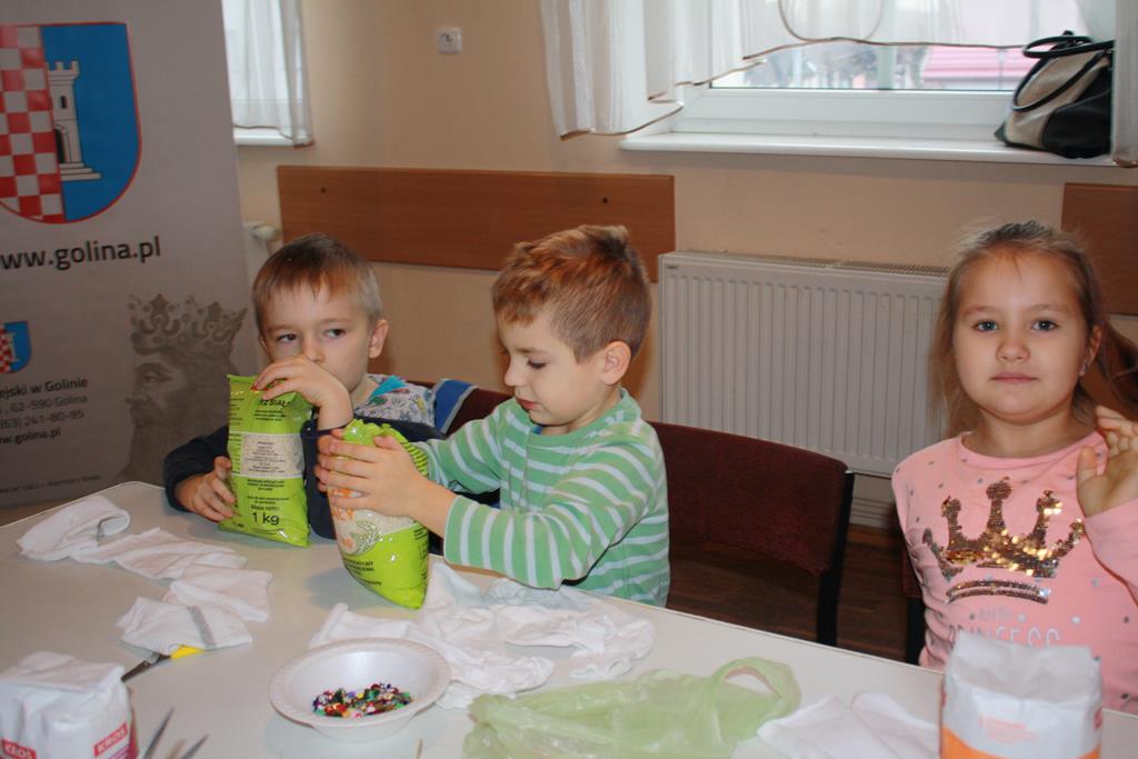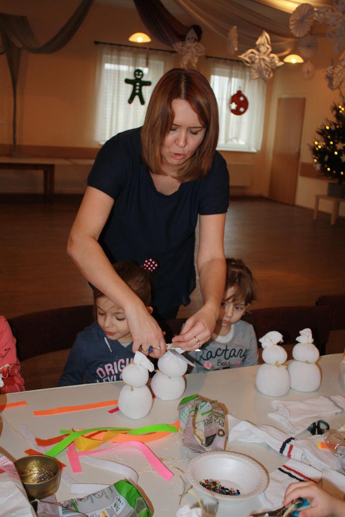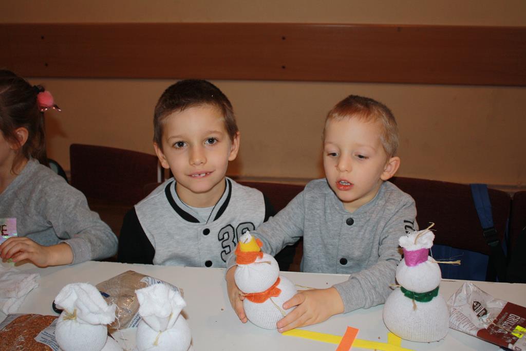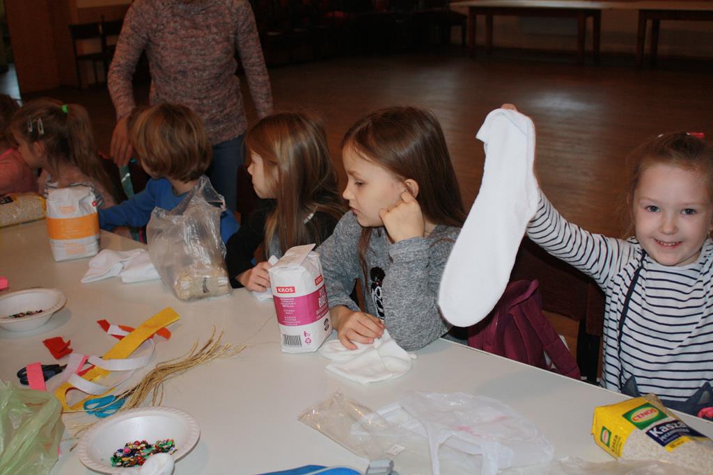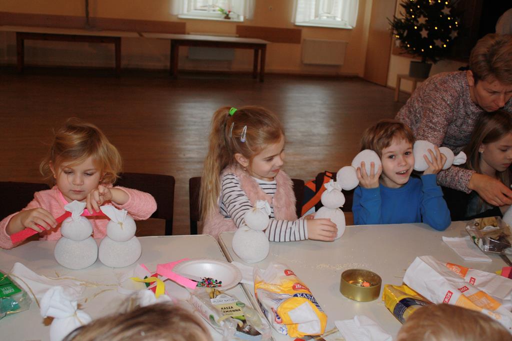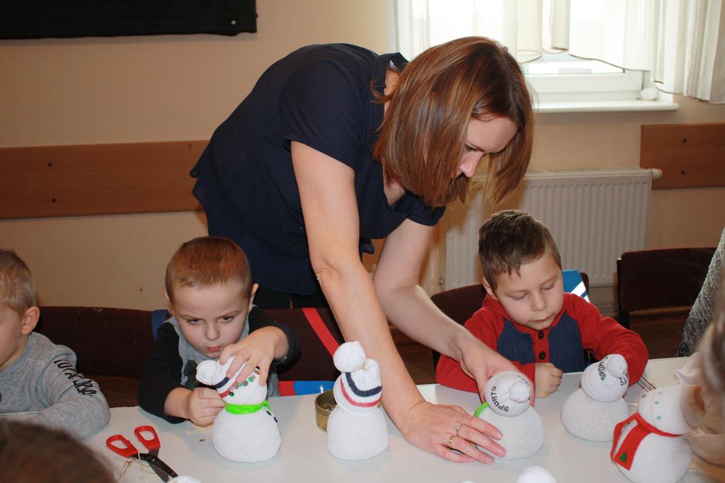 12 grudnia 2018 roku dzieci z oddziałów przedszkolnych wzięły udział w świątecznych warsztatach artystycznych, które odbyły się w Domu Kultury w Golinie. Przedszkolaki pod czułym okiem pani Edyty Jachnik wykonały śliczne bałwanki ze skarpet wypełnionych kaszą bądź ryżem. Do dekoracji użyły koralików, cekinów, szpilek oraz filcu. Poprzez działanie rozwijały swoją kreatywność, usprawniały sprawność manualną oraz uczyły się cierpliwości. Dzieci z zapałem i pomysłowością wykonały piękne bałwanki, które sprezentują swoim rodzicom z okazji Świąt Bożego Narodzenia.