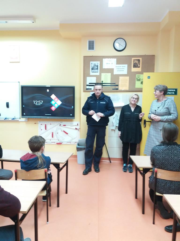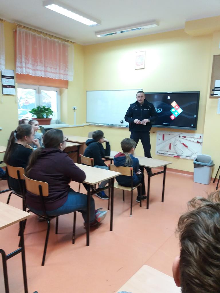 Pan dzielnicowy Marcin Nowak uświadamiał uczniom także przykre skutki zabaw w niedozwolonych miejscach oraz zachowaniu ostrożności w pobliżu jezdni. Dzieci utrwaliły sobie wszystkie informacje, zadawały naszemu gościowi mnóstwo pytań aktywnie biorąc udział w rozmowie. Mamy nadzieję, że po zimowym odpoczynku wrócą całe i zdrowe, z energią do dalszej nauki.