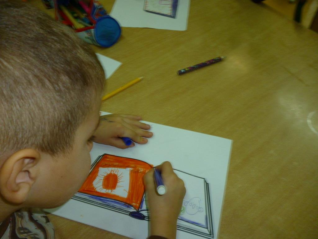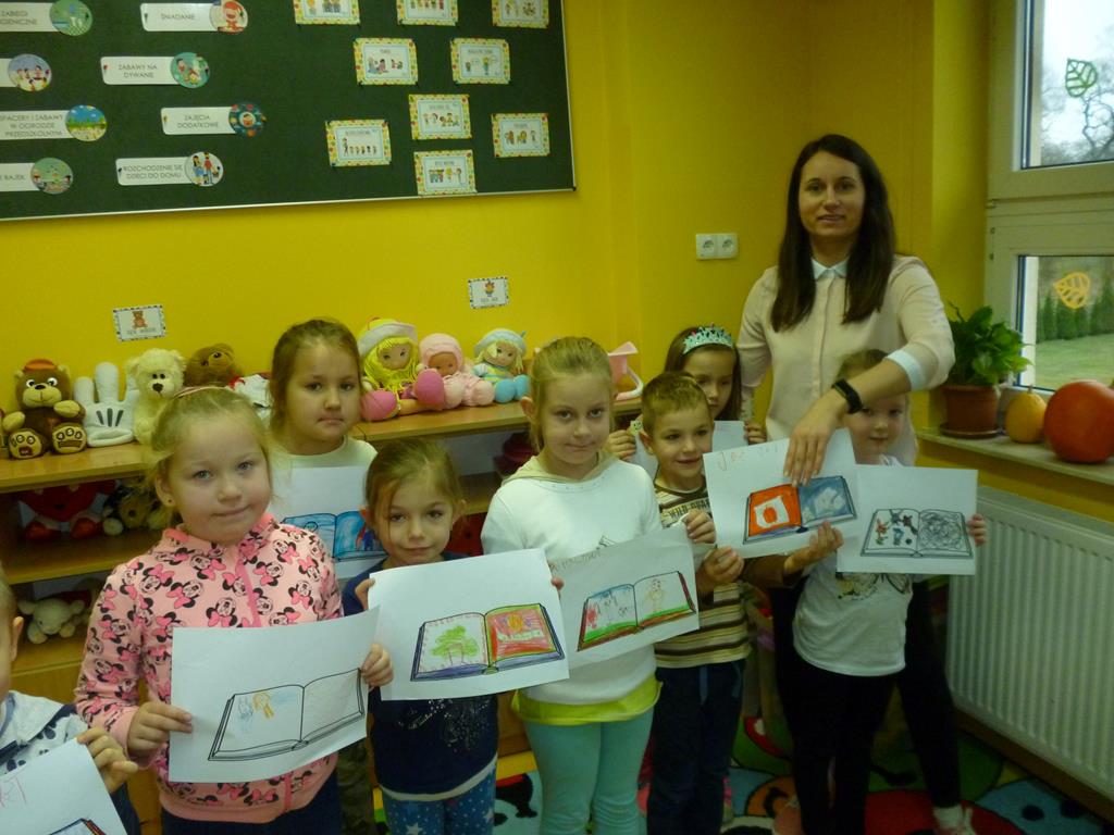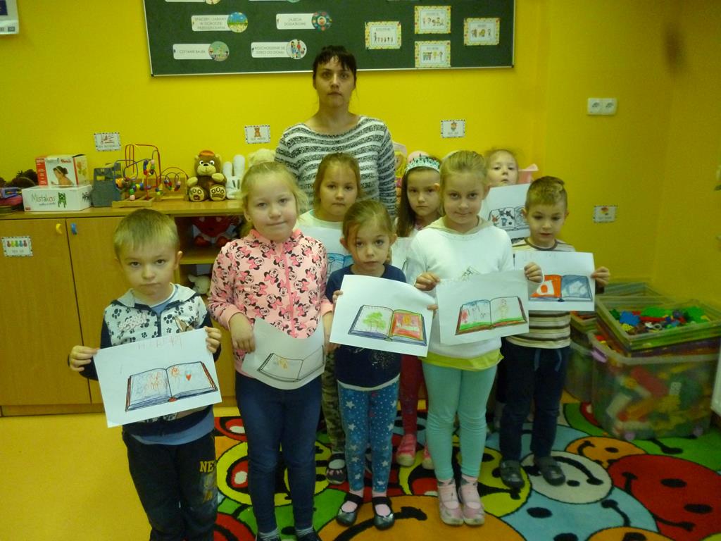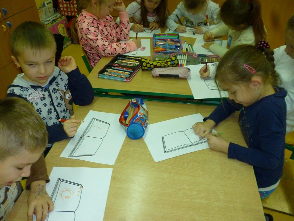Po chwilach skupienia przyszedł czas na zabawę. Przedszkolaki wcieliły się w ilustratorów i na wcześniej przygotowanych konturach książek namalowały ilustracje do wybranej przez siebie opowieści. Prace zawisły na klasowej „ gazetce".