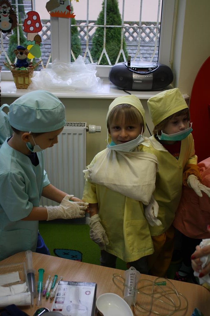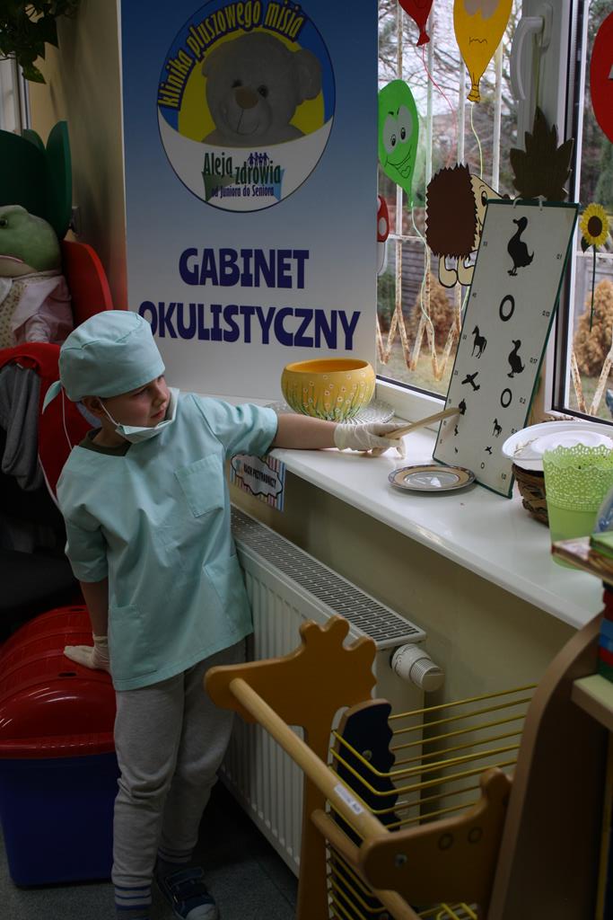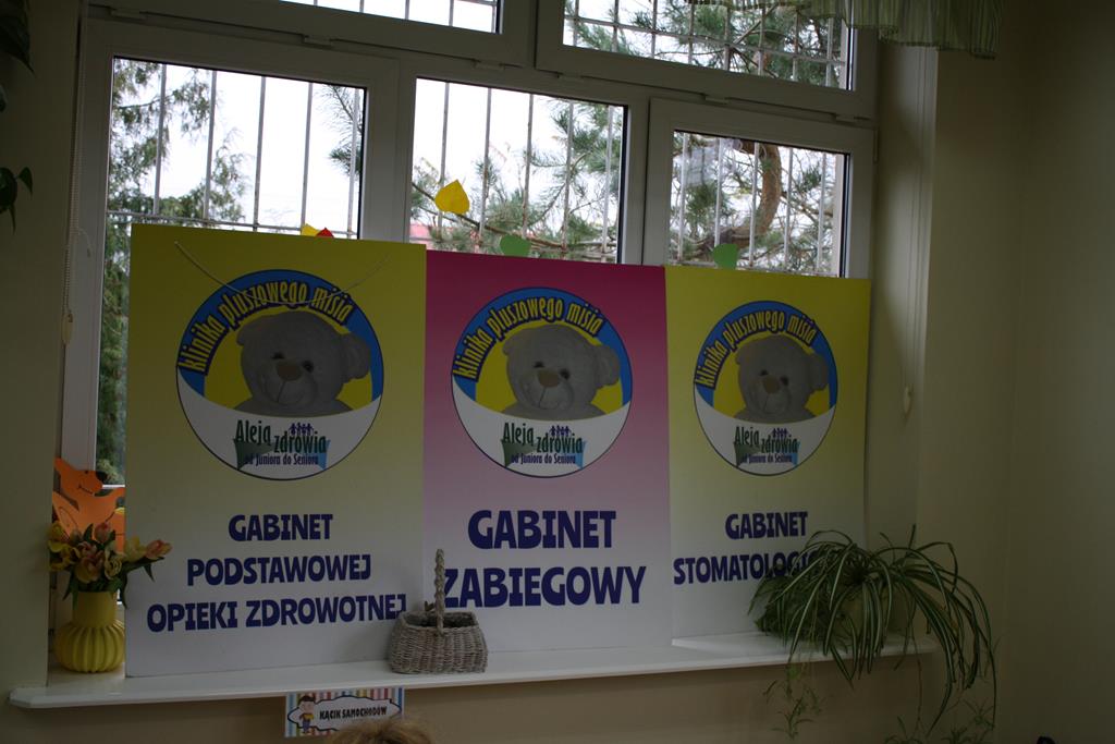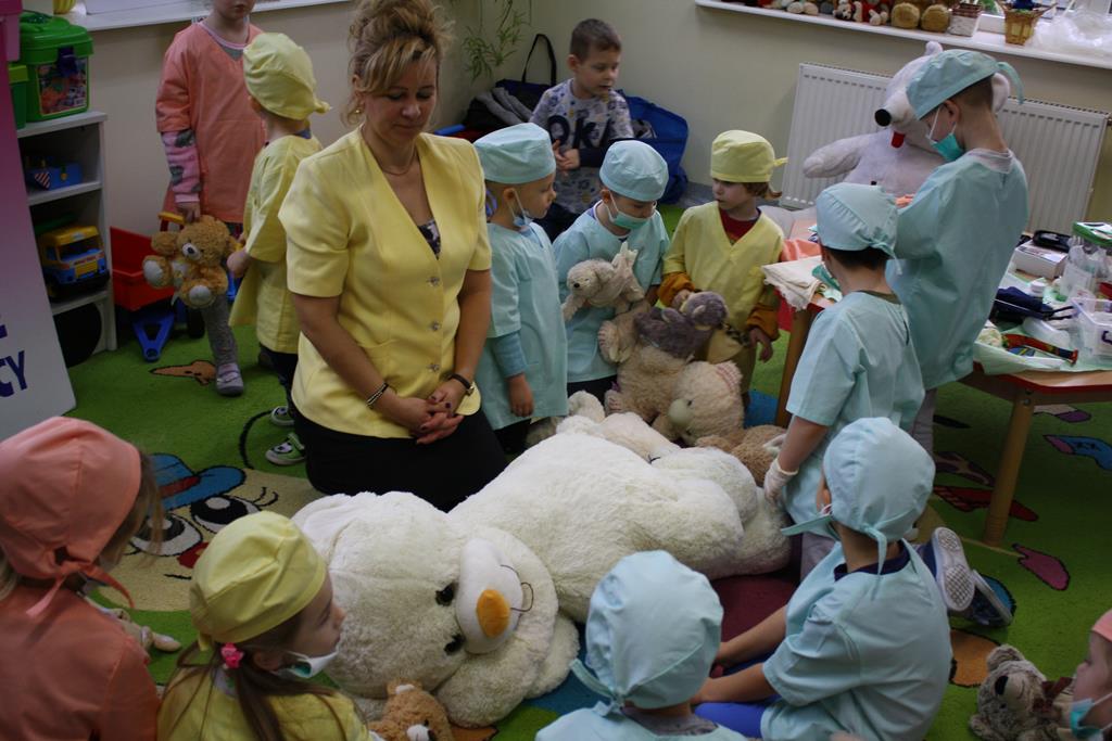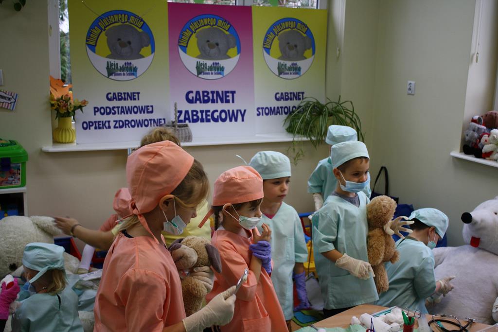 Bardzo miłą niespodzianką były odwiedziny Misia Zdrowusia z Kliniki Pluszowego Misia ze swoimi asystentami . Przedszkolaki w kolorowych, lekarskich fartuchach przyjmowały „nagłe przypadki” w szpitalnym oddziale ratunkowym. Maluchy opiekowały się też doskonale chorymi misiami na oddziale dziecięcym, mierzyły ciśnienie, osłuchiwały pacjentów, sprawdzały temperaturę, a także robiły zastrzyki. Dzieci bawiły się doskonale, a przy tym uczyły się i przełamywały strach przed lekarzem oraz poznawały zawód pielęgniarki i lekarza. Klinika Pluszowego Misia to projekt Fundacji Zdrowia „Od Juniora do Seniora”, która ze swoją mobilną przychodnią od kilku lat odwiedza szkoły i przedszkola.