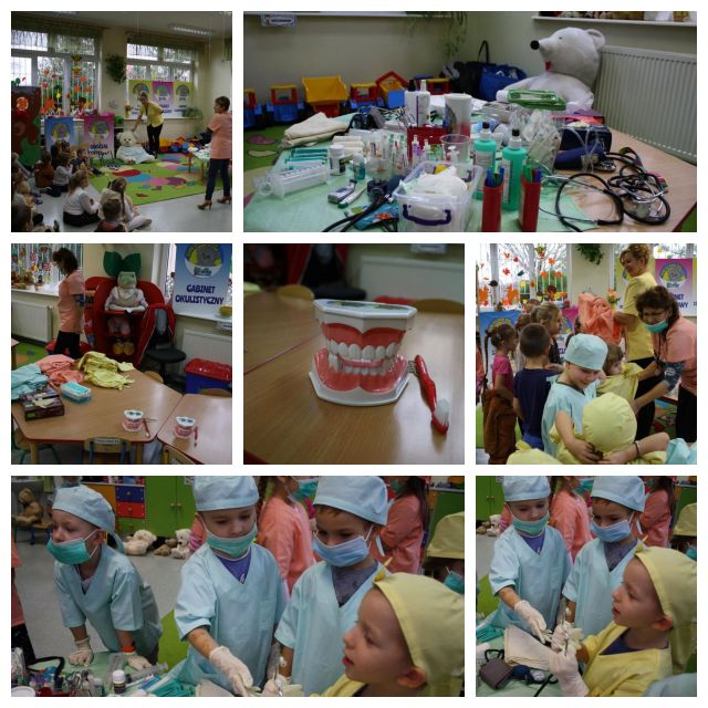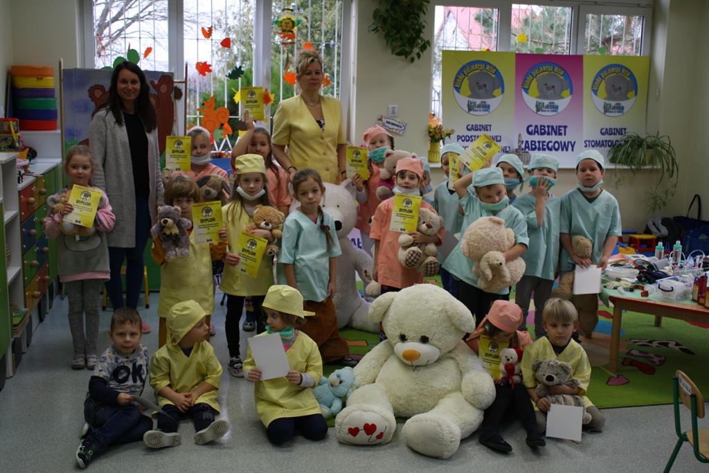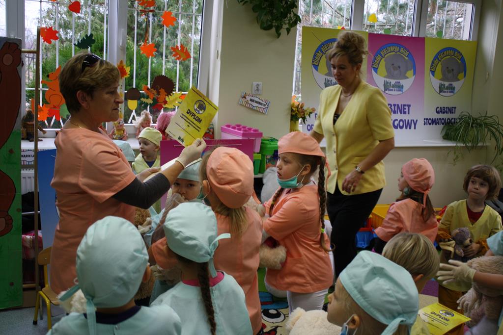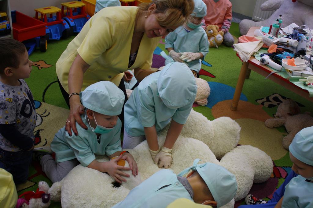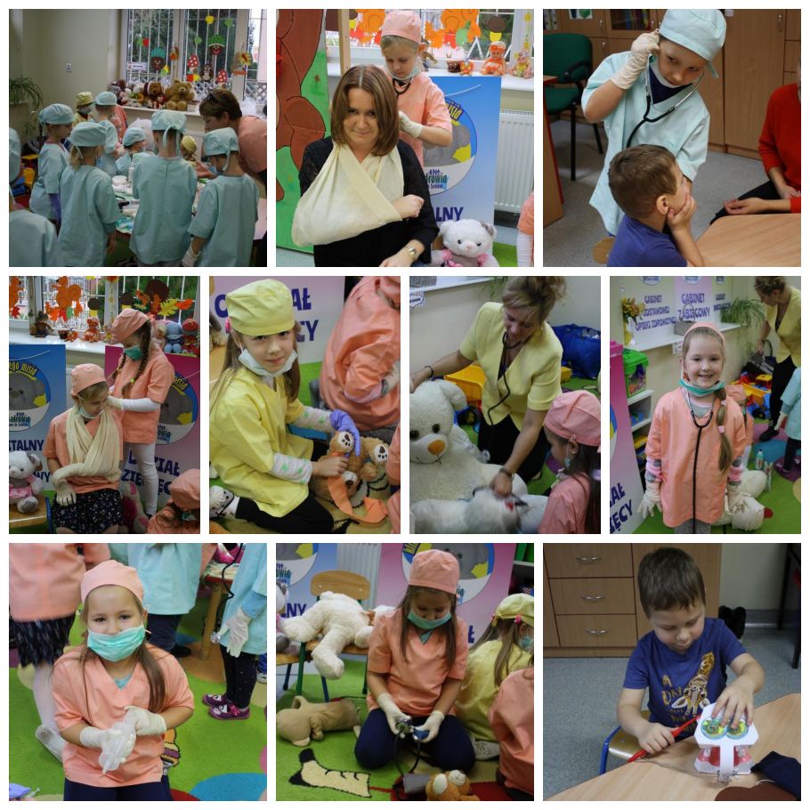 Bardzo miłą niespodzianką były odwiedziny Misia Zdrowusia z Kliniki Pluszowego Misia ze swoimi asystentami . Przedszkolaki w kolorowych, lekarskich fartuchach przyjmowały „nagłe przypadki” w szpitalnym oddziale ratunkowym. Maluchy opiekowały się też doskonale chorymi misiami na oddziale dziecięcym, mierzyły ciśnienie, osłuchiwały pacjentów, sprawdzały temperaturę, a także robiły zastrzyki. Dzieci bawiły się doskonale, a przy tym uczyły się i przełamywały strach przed lekarzem oraz poznawały zawód pielęgniarki i lekarza. Klinika Pluszowego Misia to projekt Fundacji Zdrowia „Od Juniora do Seniora”, która ze swoją mobilną przychodnią od kilku lat odwiedza szkoły i przedszkola.