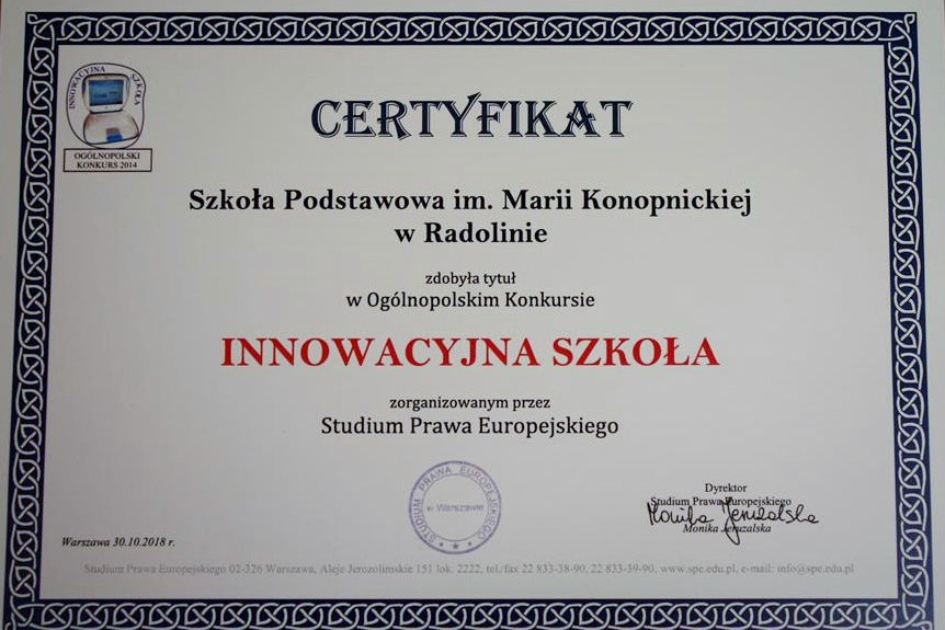 Po wytężonej pracy całej społeczności zdobyliśmy certyfikat „ Innowacyjna szkoła”.