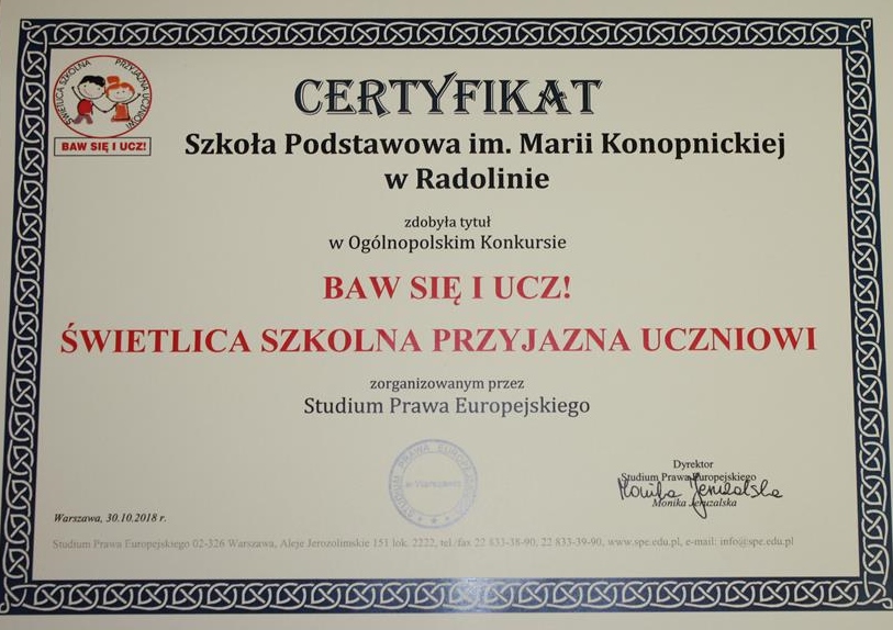 Nasza szkoła wzięła udział w Ogólnopolskim Konkursie pod nazwą „Baw się i ucz! Świetlica szkolna przyjazna uczniowi”, który został przeprowadzony w okresie od 1 marca 2018r. do 30 października 2018 r.