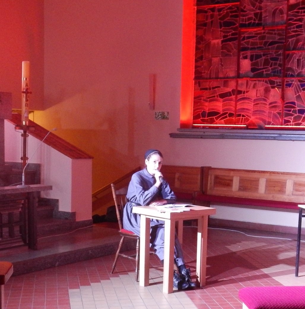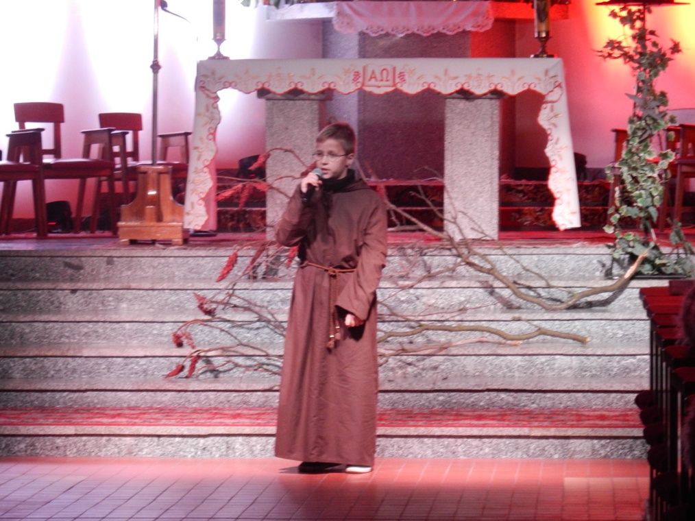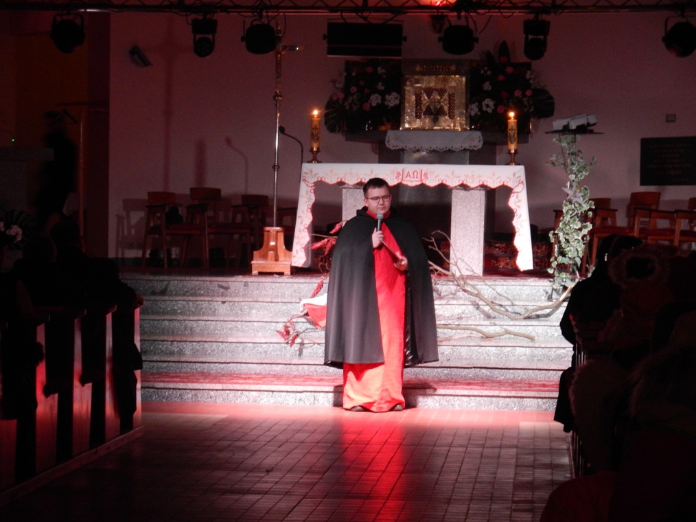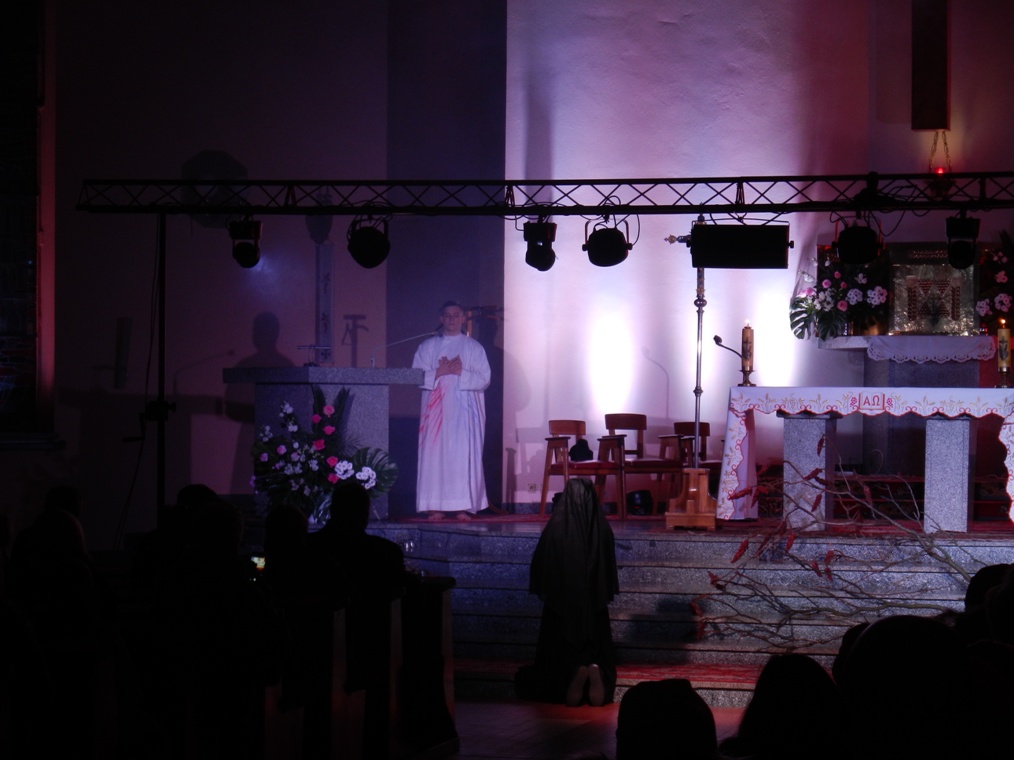 Następnie parafia bpa Mikołaja w Lądku przygotowała prezentację św. Siostry Faustyny Kowalskiej. Tu też mogliśmy przyjrzeć się życiu siostry Faustyny, dzięki przedstawionej scenie z „ Dzienniczka siostry Faustyny” i jej rozmów z Jezusem podczas objawień. To ona ofiarowała swoją modlitwę i cierpienie za Polskę.
