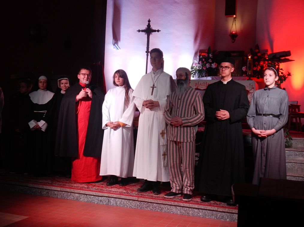 Kolejna postać to św. Maksymilian Kolbe zaprezentowany przez parafię św. Katarzyny Aleksandryjskiej z Cienina Kościelnego. Ojciec Maksymilian jak sam mówił, całą zasługa w umiłowaniu Ojczyzny jest w jego rodzicach, bo oni rozbudowali w nim miłość do Matki Bożej, a ponieważ Maryja jest Królową Polski, dlatego tak samo jak Matkę Bożą kocha Polskę. Przedstawiona teraz została scena obozu koncentracyjnego, w której ks. Maksymilian przyjmuje wyrok śmierci za innego skazańca.
