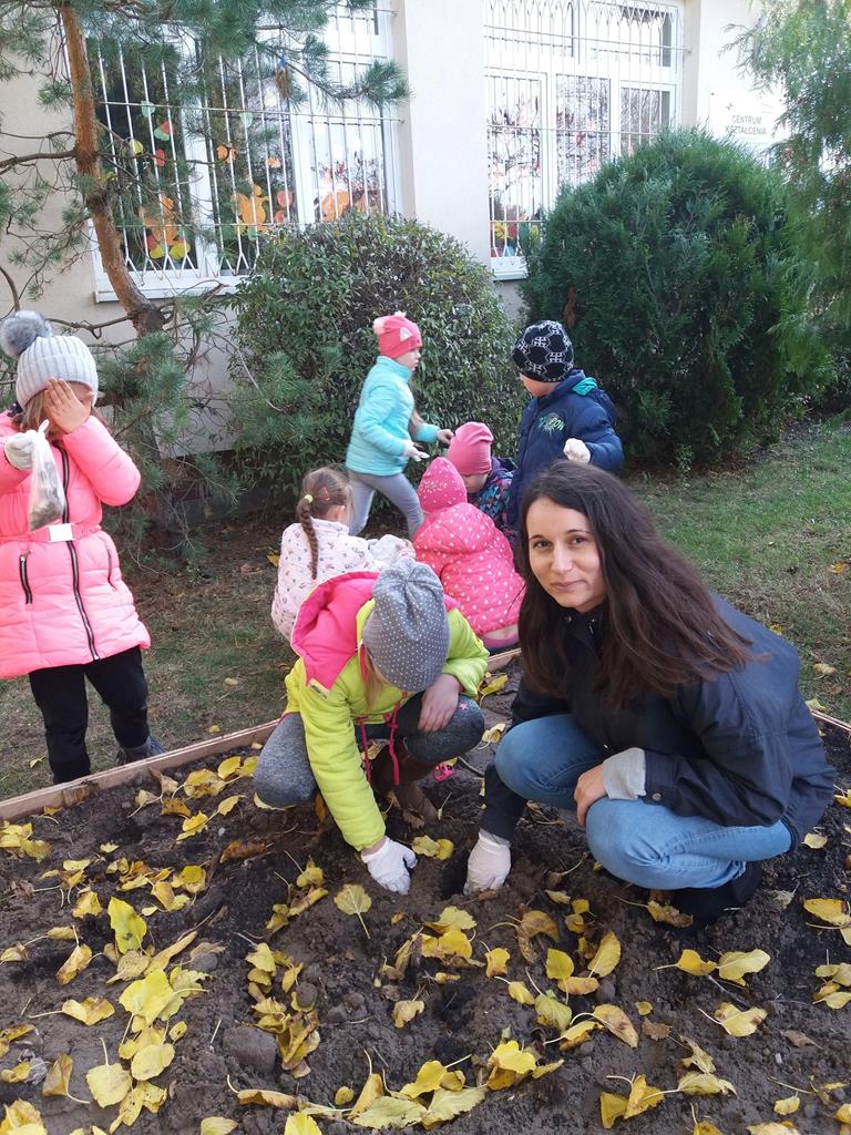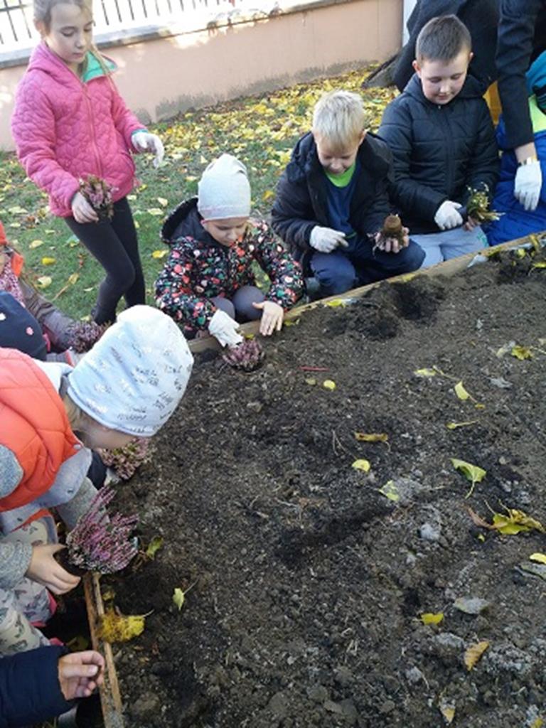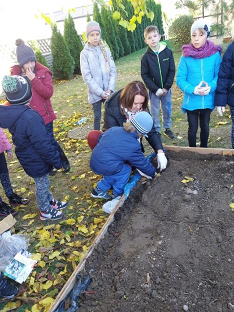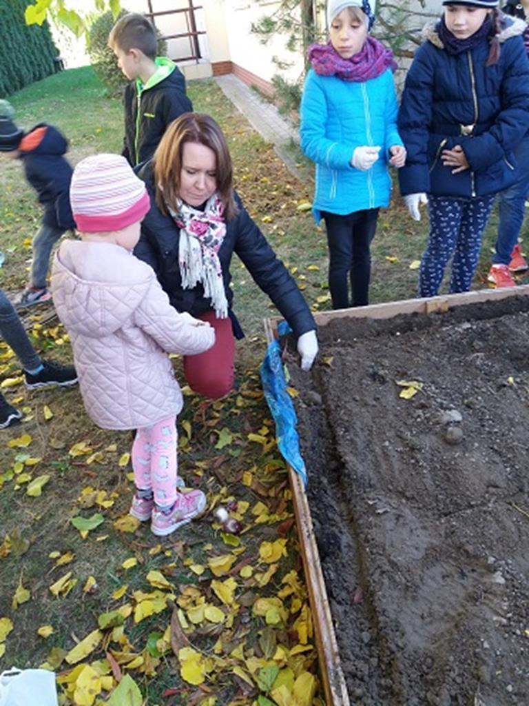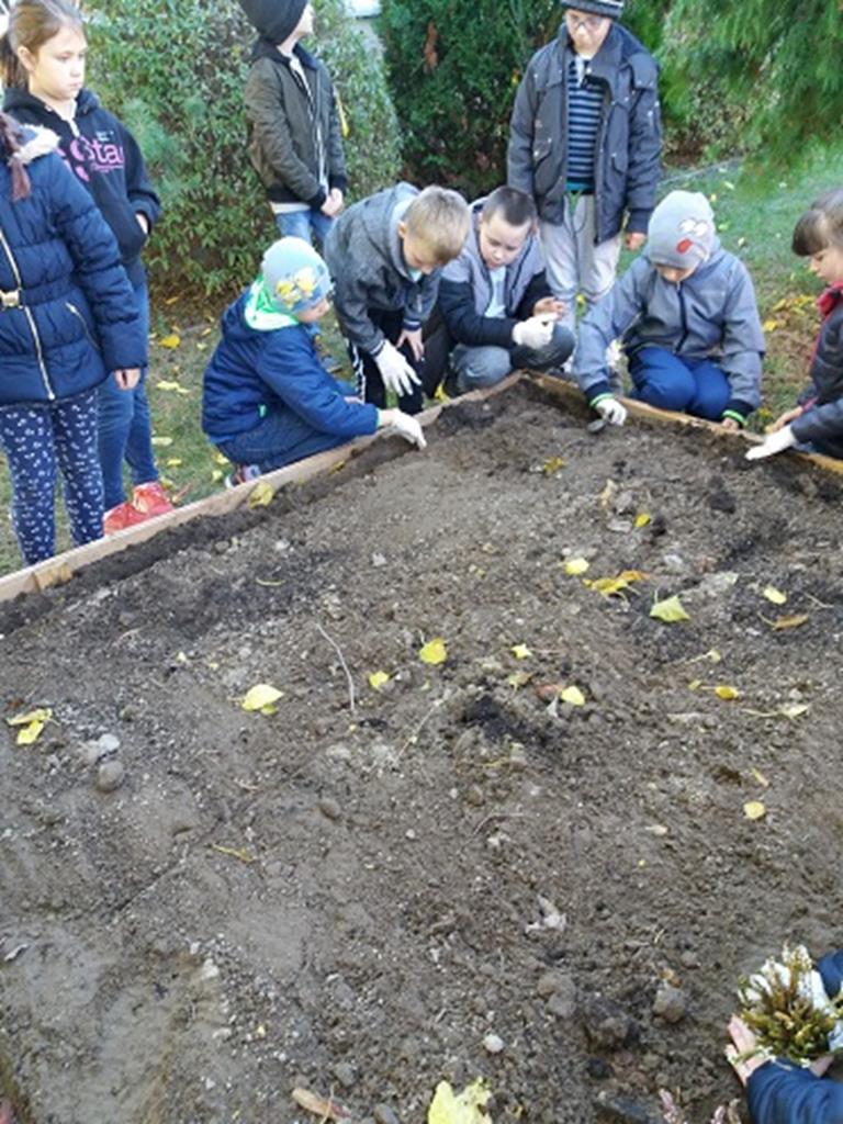 Prace rozpoczęły się od budowy ogródka, w której pomógł nam p. Leszek Dulcyt. Potem nawieźliśmy ziemi z pomocą p. Ani Szymczak, zagrabiliśmy i posadziliśmy cebulki kwiatów, aby na wiosnę cieszyły nasze serca.