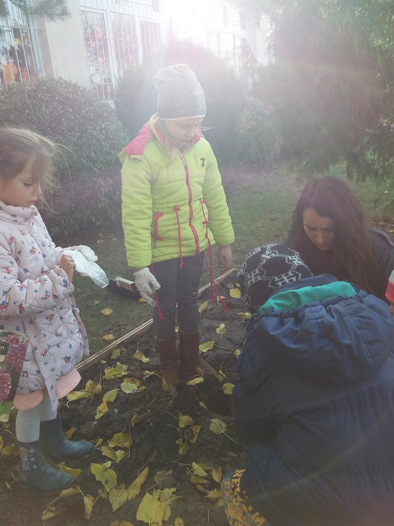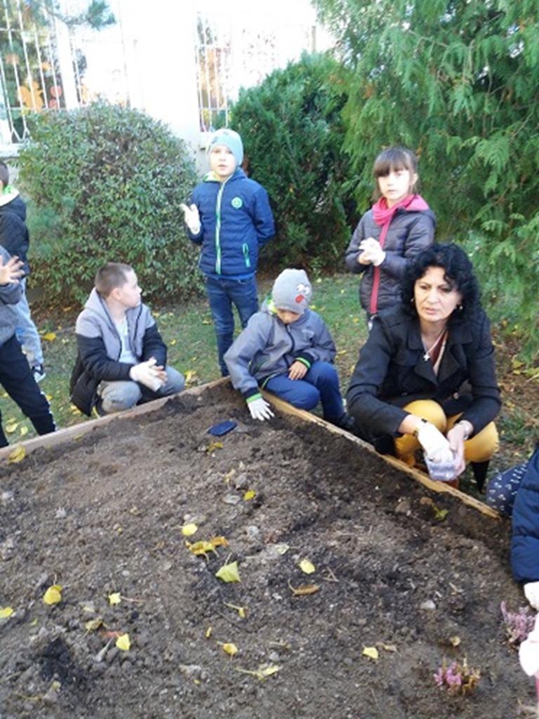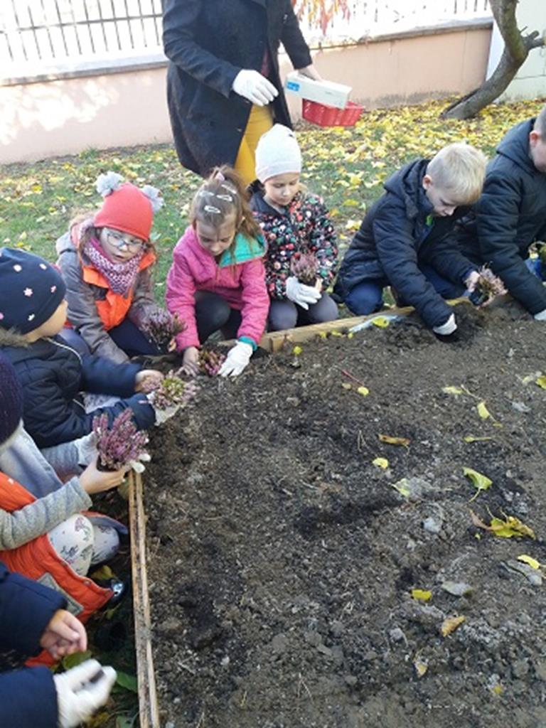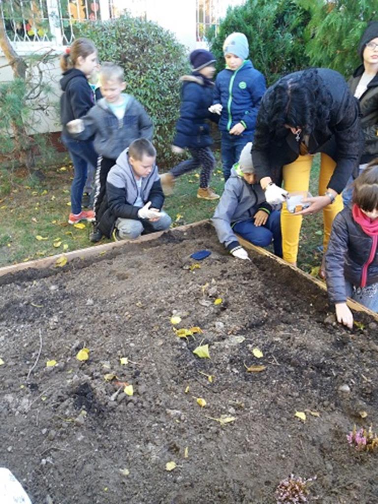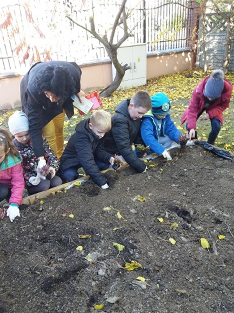 Prace rozpoczęły się od budowy ogródka, w której pomógł nam p. Leszek Dulcyt. Potem nawieźliśmy ziemi z pomocą p. Ani Szymczak, zagrabiliśmy i posadziliśmy cebulki kwiatów, aby na wiosnę cieszyły nasze serca.