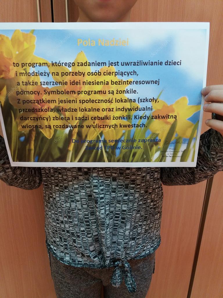 Symbolem programu są żonkile. Nasza społeczność szkolna postanowiła przyłączyć się do tej akcji. Zebraliśmy i posadziliśmy cebulki żonkili w naszym przyszkolnym ogródku. Kiedy zakwitną wiosną, będą rozdawane w ulicznych kwestach. Do programu zaprosiła nas Pani Halina Paluszkiewicz - Prezes Zarządu Gminnego TPD w Golinie.