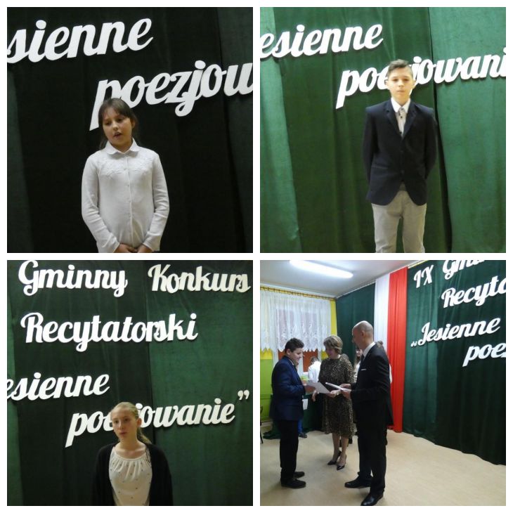Dnia 7.11.2018 roku czworo uczniów naszej szkoły wzięło udział w IX edycji Gminnego Konkursu Recytatorskiego pod hasłem Jesienne poezjowanie, który odbył się w Szkole Podstawowej im. Juliusza Słowackiego w Kawnicach.