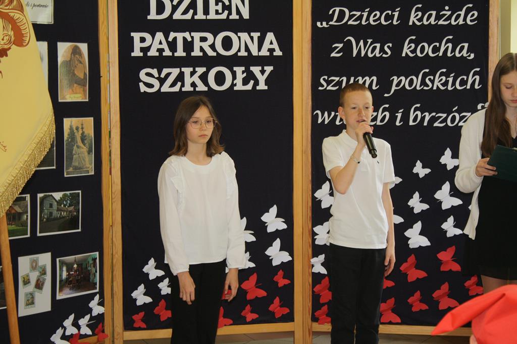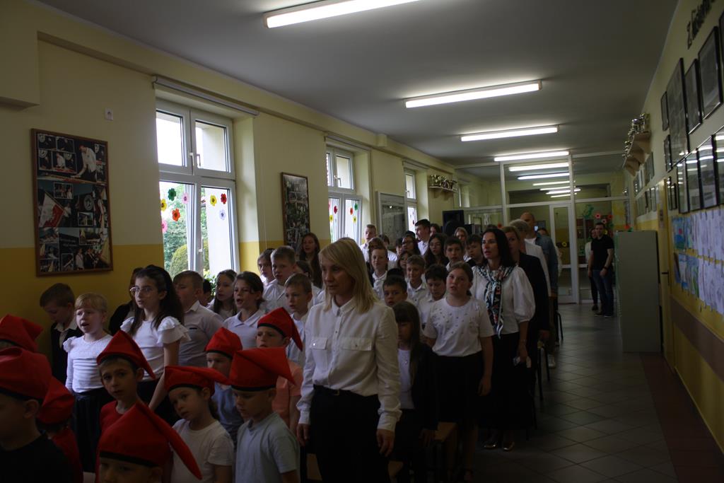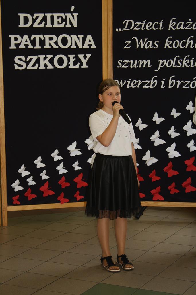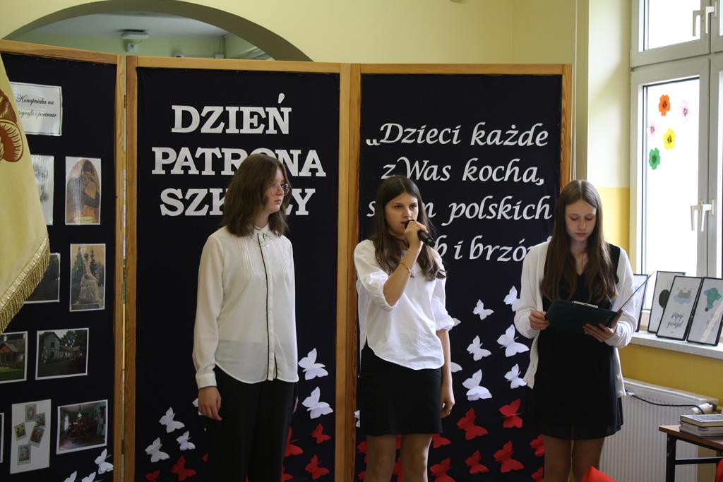 Szkolną uroczystość z okazji Dnia Patrona rozpoczęliśmy od odśpiewania ,,Roty” – utworu napisanego przez naszą patronkę - Marię Konopnicką - w 1908 roku jako wyraz protestu przeciwko nasilającej się germanizacji i stanowiącej po dziś dzień prawdziwy symbol polskiego patriotyzmu.
