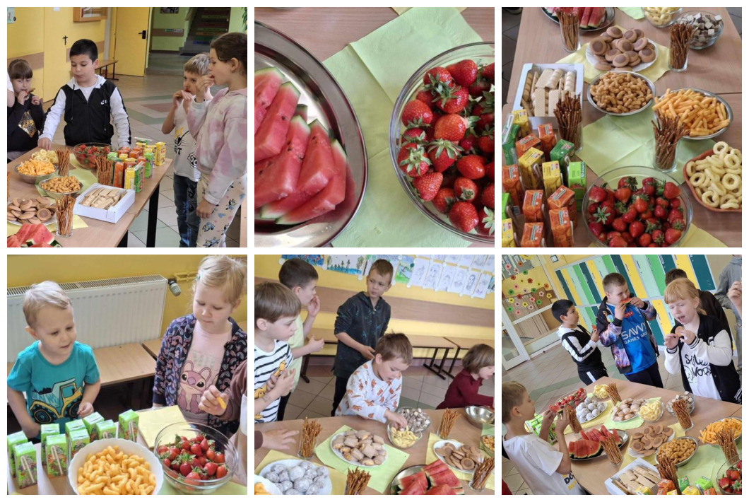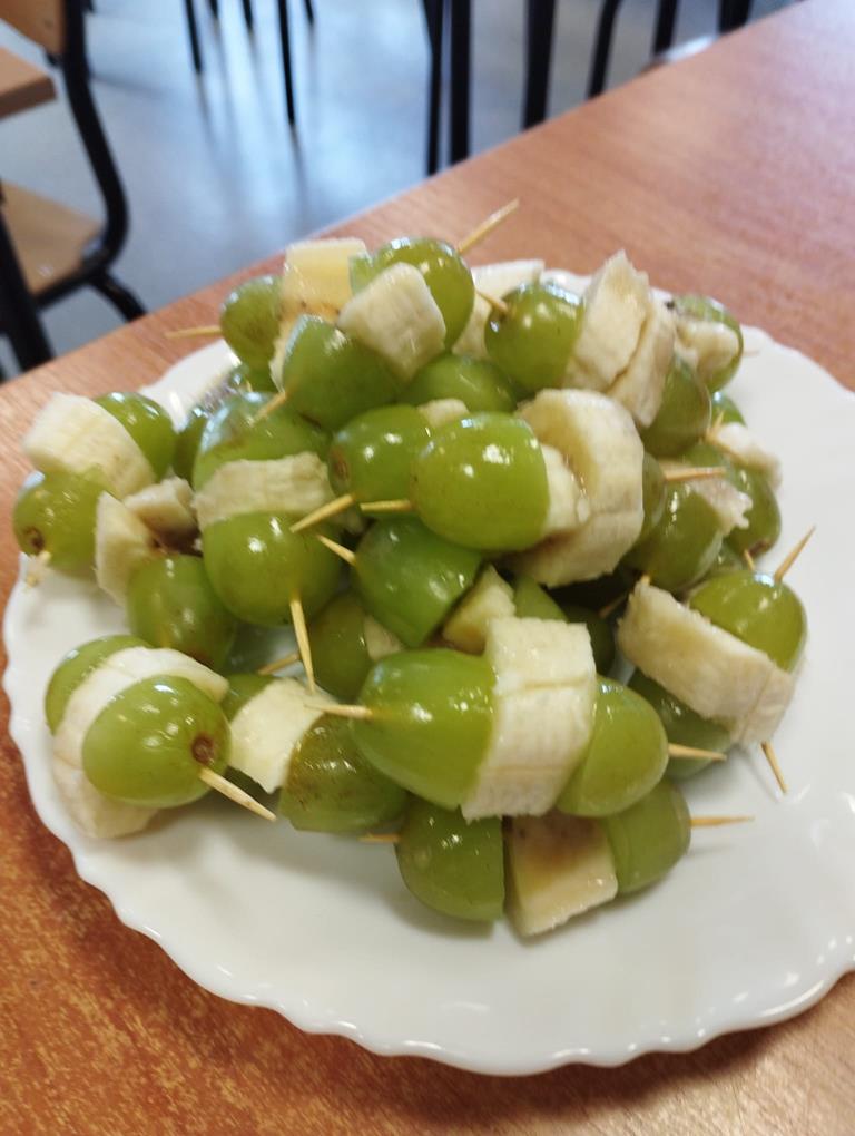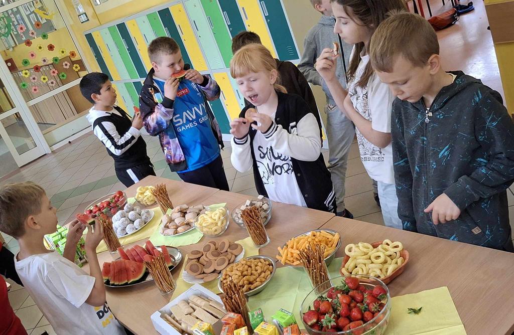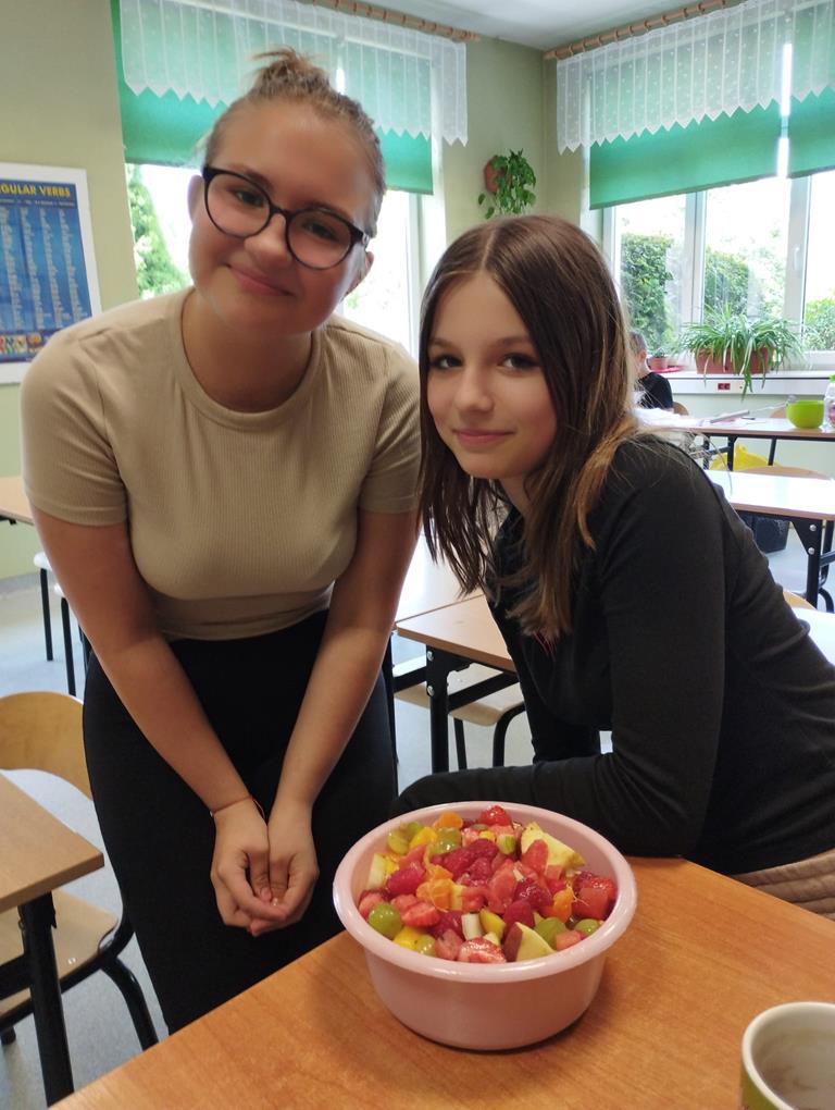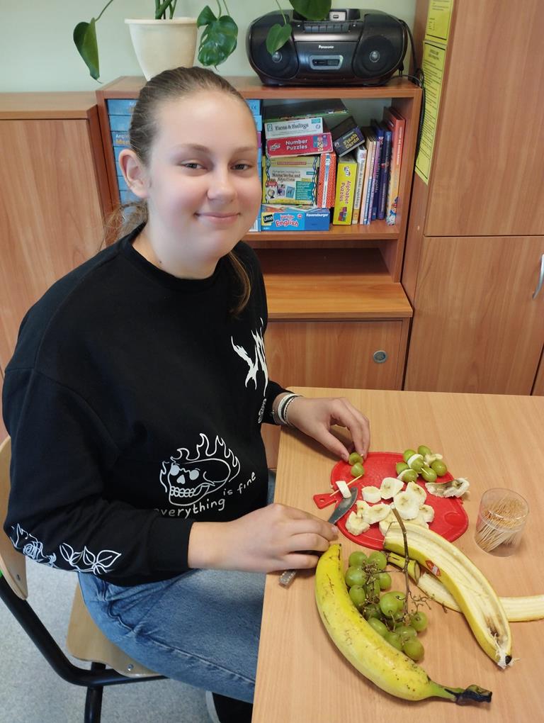 - uczniowie samodzielnie przygotowywali zdrowe przekąski: np. owocowe szaszłyki, kolorowe kanapki, jogurtowe desery z owocami,