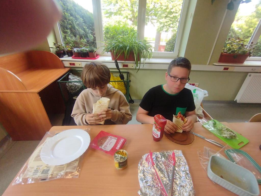 Uczniowie klas 5 i 6 w ramach zajęć techniki przygotowali zdrowe i smaczne posiłki – kolorowe tortille z warzywami, sałatki owocowe oraz kluski z truskawkami. Zajęcia miały na celu nie tylko rozwijanie umiejętności kulinarnych, ale również promowanie zdrowego stylu życia. Działania wpisują się w realizację podstawy programowej oraz inicjatywę Szkoły Promującej Zdrowie.