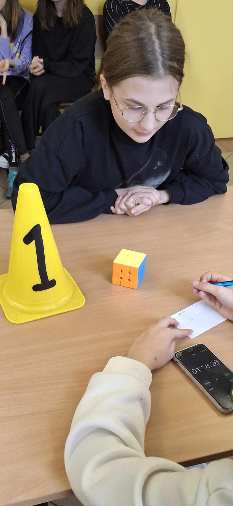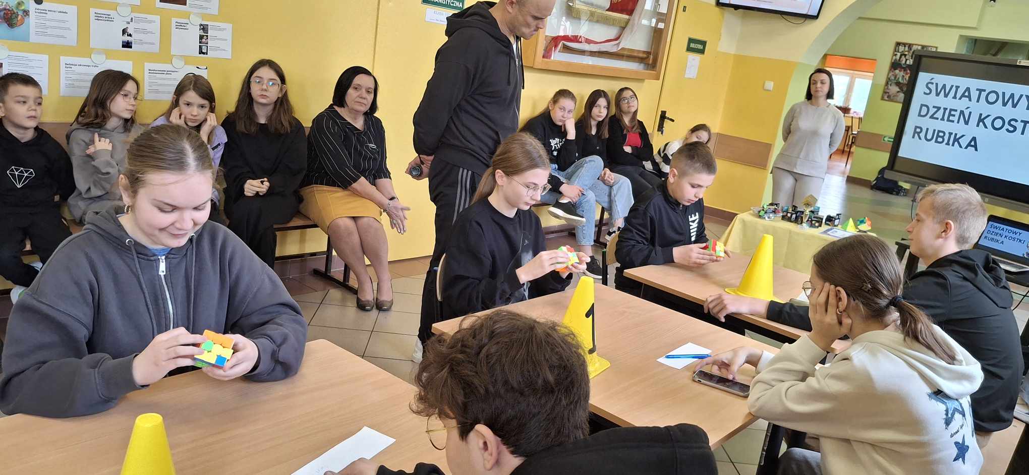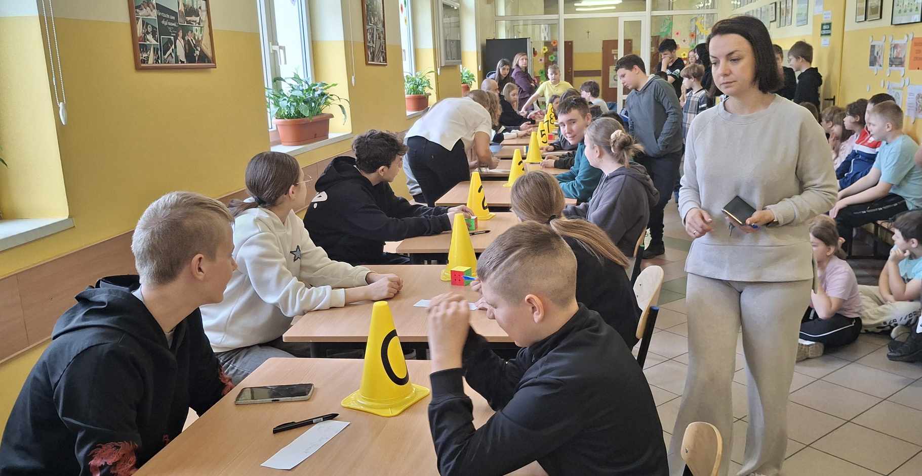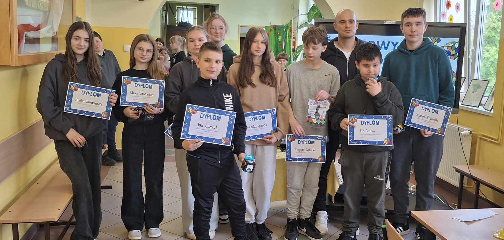 Do rywalizacji stanęło kilkoro uczniów z różnych klas, którzy zmierzyli się w dwóch rundach, walcząc o tytuł najszybszego układacza kostki. Emocje sięgały zenitu, a widownia z zapartym tchem śledziła każde obroty kolorowych ścianek. Najlepsze czasy, poniżej minuty należały do uczniów : Weroniki Żabierek ( 50,68s), , Kaspiana Gomulskiego (56,12 s.) i Nadii Szczepańskiej ( 63,26s. )