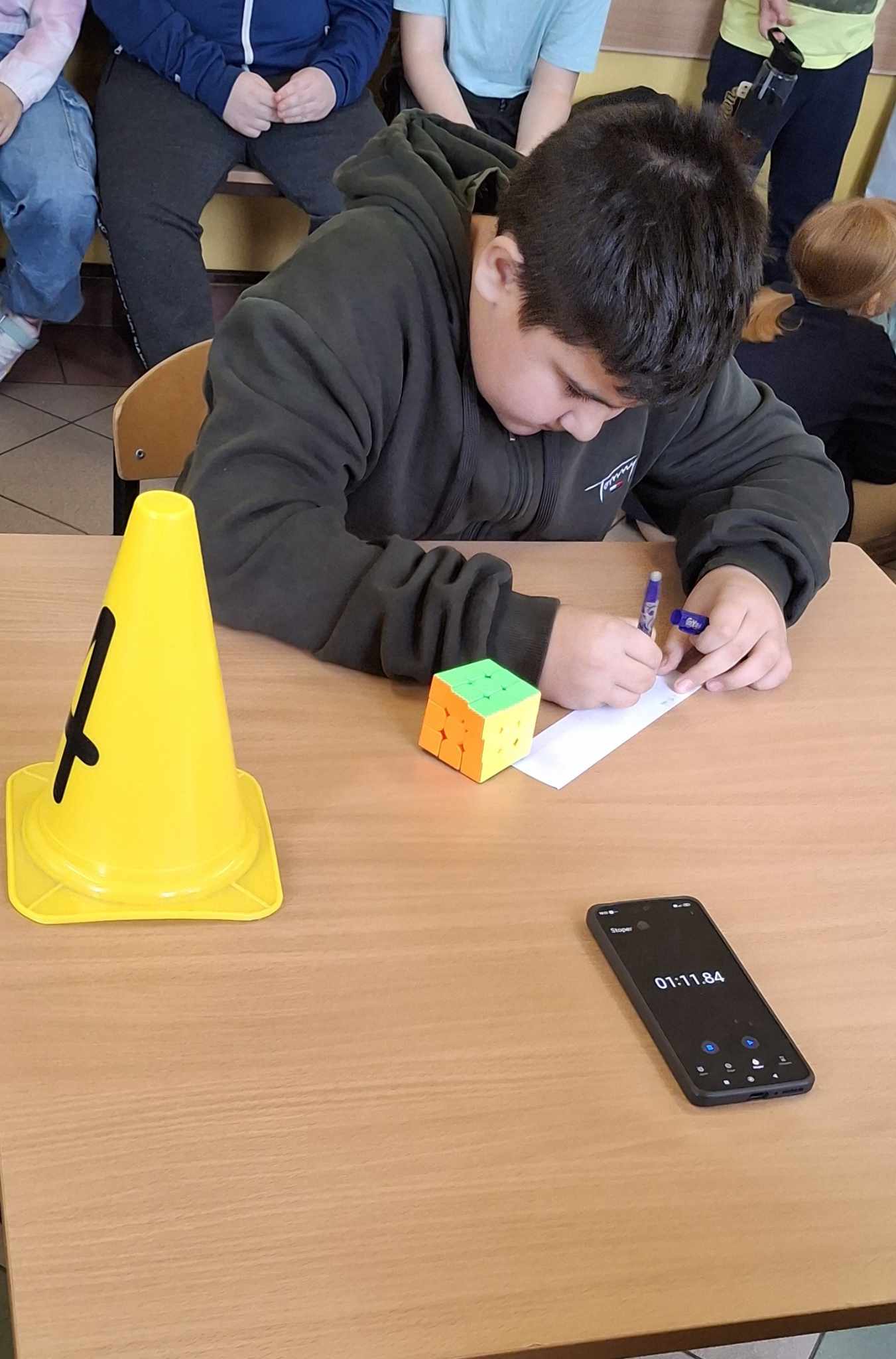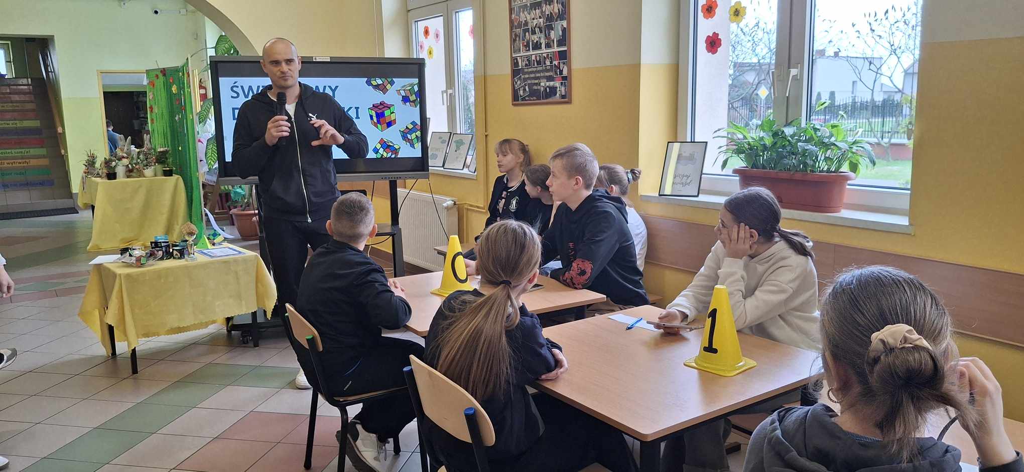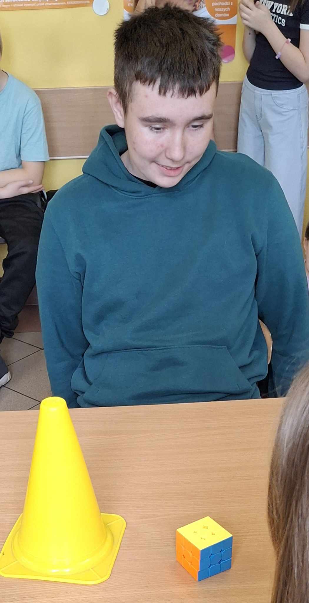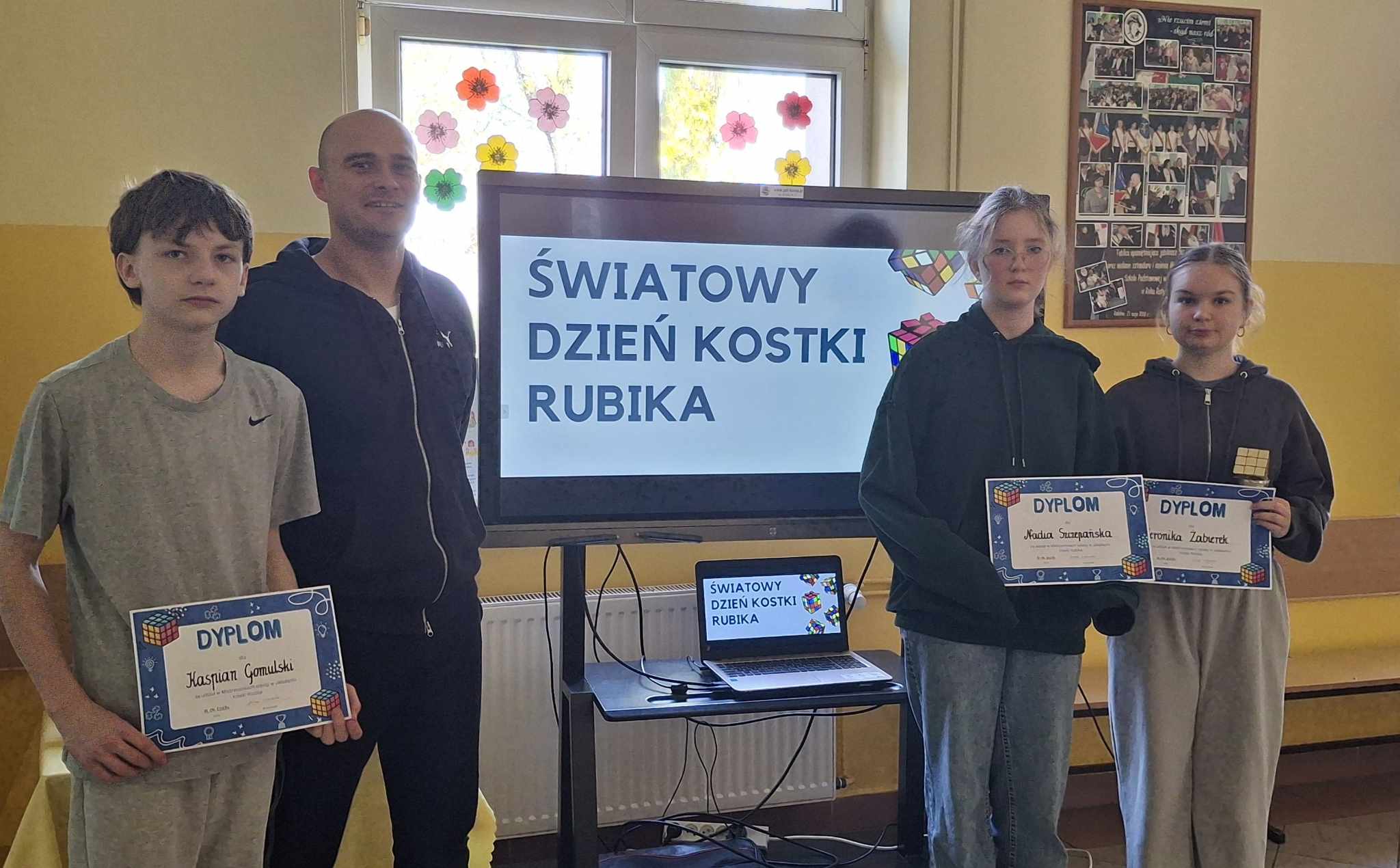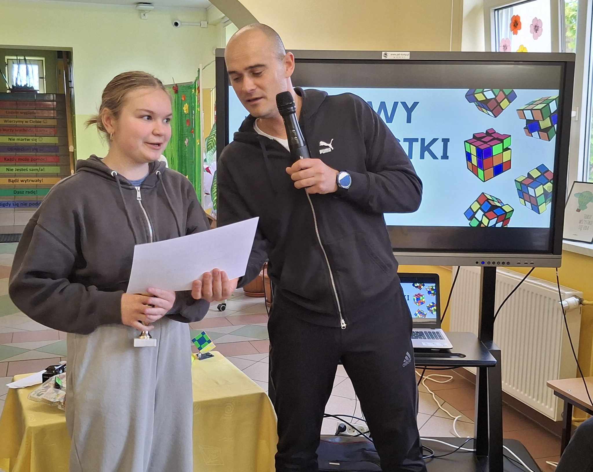 Do rywalizacji stanęło kilkoro uczniów z różnych klas, którzy zmierzyli się w dwóch rundach, walcząc o tytuł najszybszego układacza kostki. Emocje sięgały zenitu, a widownia z zapartym tchem śledziła każde obroty kolorowych ścianek. Najlepsze czasy, poniżej minuty należały do uczniów : Weroniki Żabierek ( 50,68s), , Kaspiana Gomulskiego (56,12 s.) i Nadii Szczepańskiej ( 63,26s. )