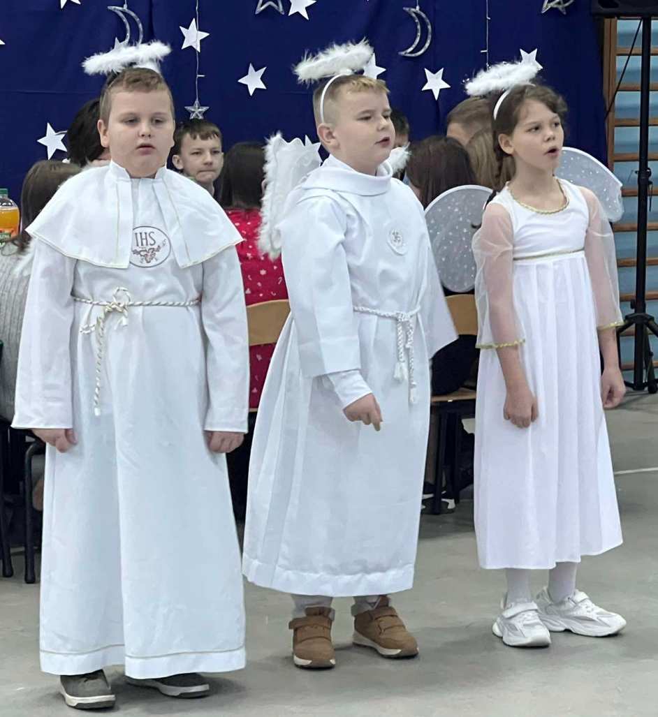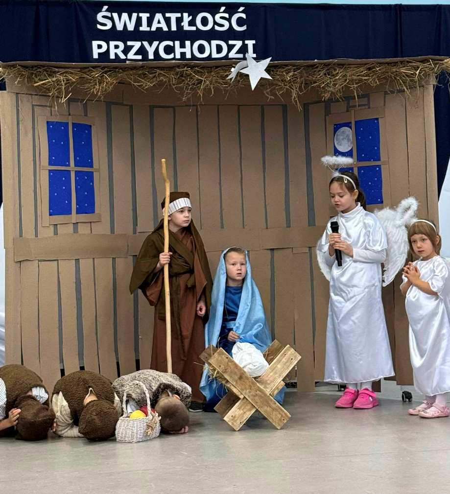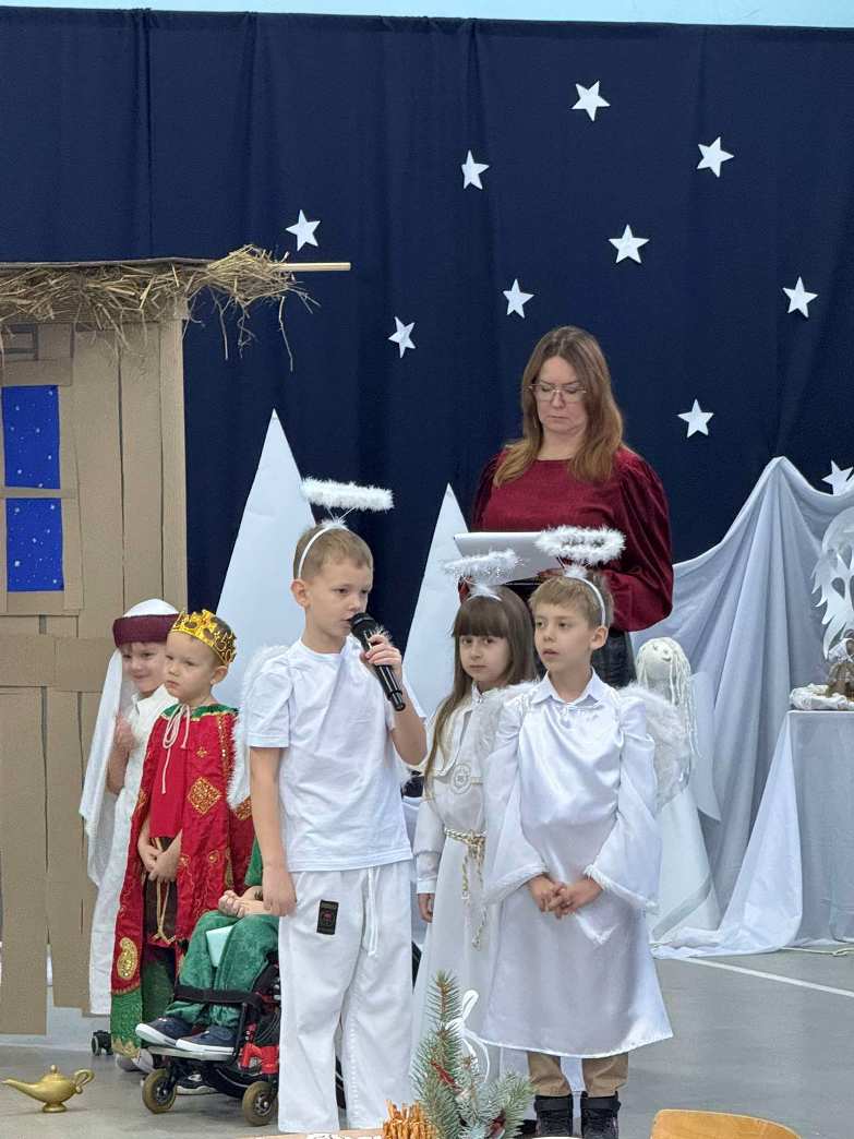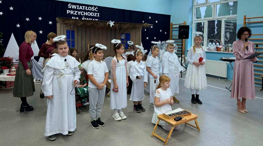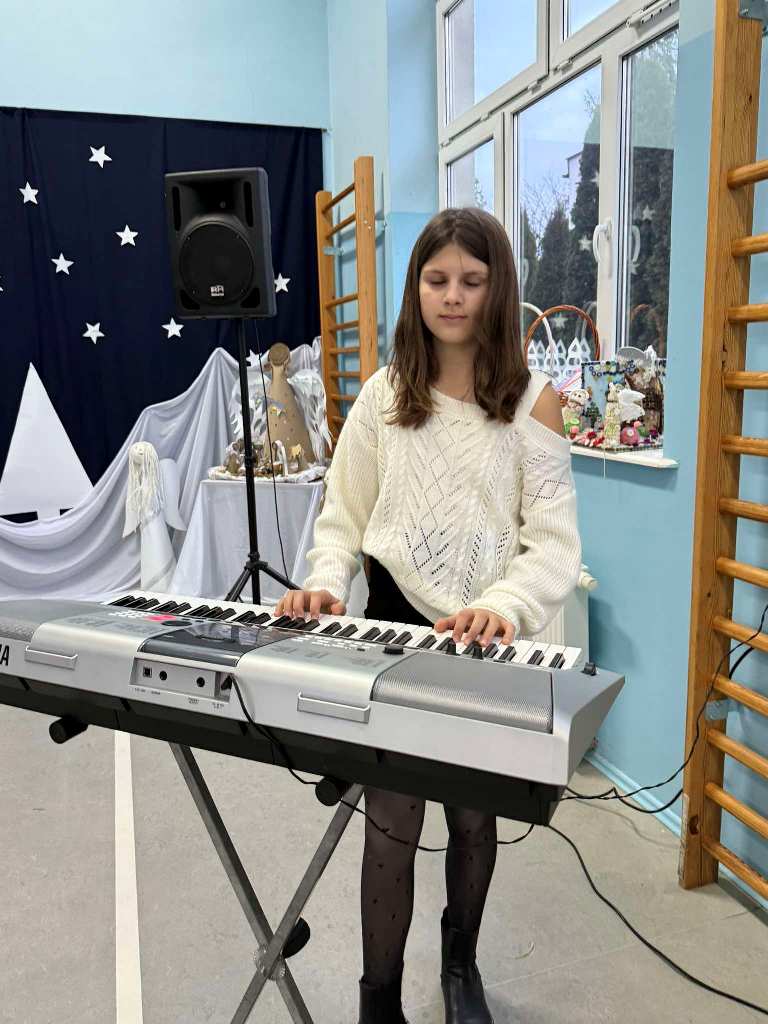 Chcąc wprowadzić wszystkich w przedświąteczny nastrój przygotowaliśmy program artystyczny. Świąteczną akademię rozpoczęli uczestnicy koła muzycznego przygotowane przez Panią Agnieszkę Waliniak. W ich wykonaniu usłyszeliśmy wesołą pastorałkę pod tytułem „Podniebna rozmowa”. Po nich najmłodsi uczniowie naszej szkoły: przedszkole, klasa O oraz pierwszoklasiści zaprezentowali Jasełka, dzięki którym przypomnieliśmy sobie historię narodzin Pana Jezusa. Dzieci zostały przygotowane przez Panią Agnieszkę Kołodziejczak, Emilię Napierałę i Barbarę Jarońską. Na zakończenie programu artystycznego usłyszeliśmy instrumentalną wersję kolędy „ Gdy śliczna Panna ” w wykonaniu Nadii Kasprzyk.
