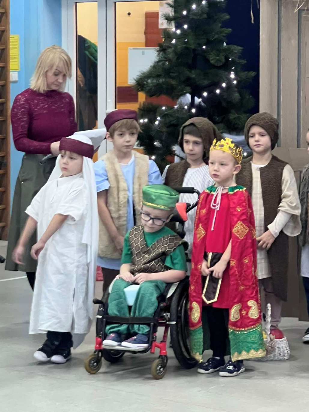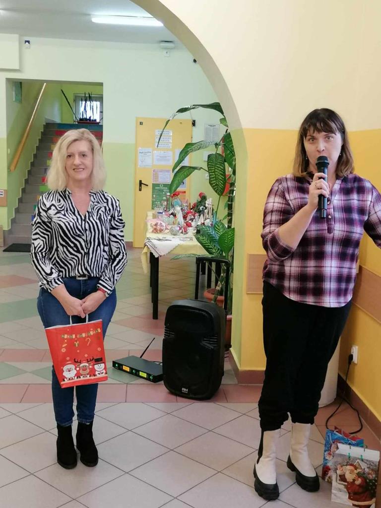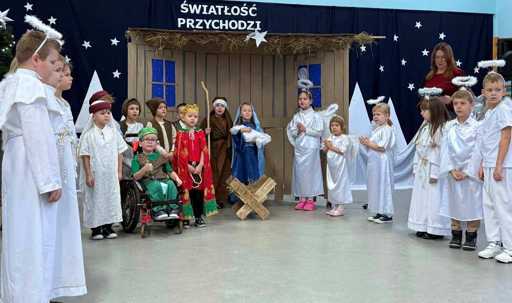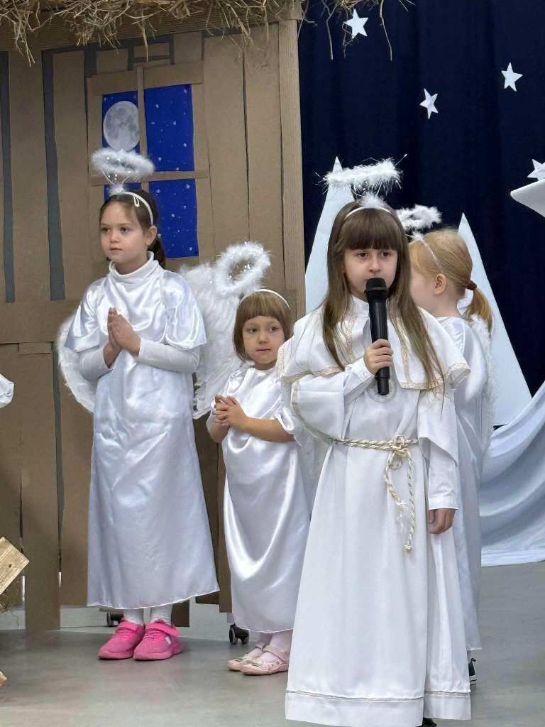 Chcąc wprowadzić wszystkich w przedświąteczny nastrój przygotowaliśmy program artystyczny. Świąteczną akademię rozpoczęli uczestnicy koła muzycznego przygotowane przez Panią Agnieszkę Waliniak. W ich wykonaniu usłyszeliśmy wesołą pastorałkę pod tytułem „Podniebna rozmowa”. Po nich najmłodsi uczniowie naszej szkoły: przedszkole, klasa O oraz pierwszoklasiści zaprezentowali Jasełka, dzięki którym przypomnieliśmy sobie historię narodzin Pana Jezusa. Dzieci zostały przygotowane przez Panią Agnieszkę Kołodziejczak, Emilię Napierałę i Barbarę Jarońską. Na zakończenie programu artystycznego usłyszeliśmy instrumentalną wersję kolędy „ Gdy śliczna Panna ” w wykonaniu Nadii Kasprzyk.