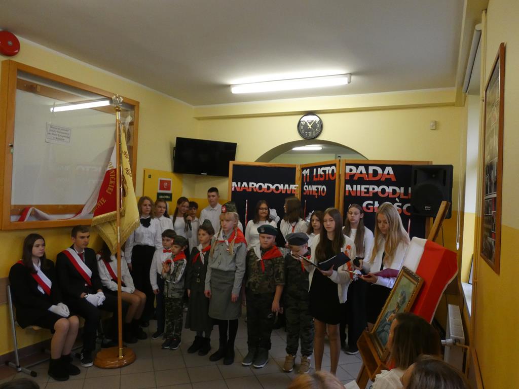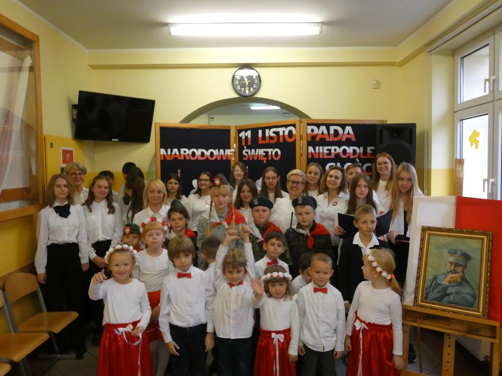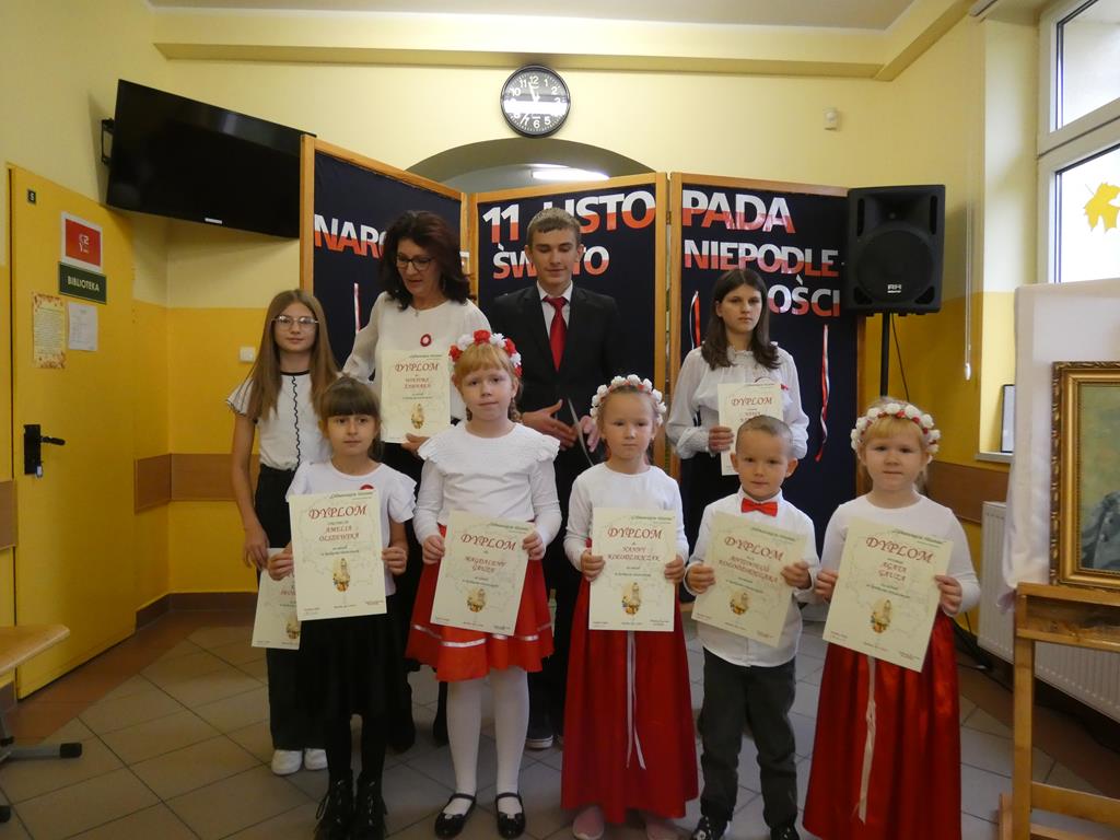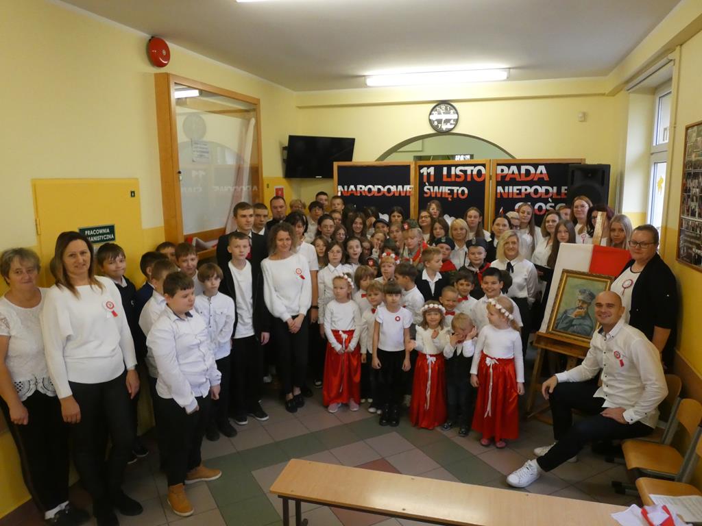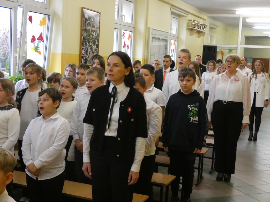 Jak co roku wzięliśmy udział w akcji „Szkoła do hymnu!” i dokładnie o godzinie 11.11 wspólnie odśpiewaliśmy hymn narodowy. Data 11 listopada to symbol walki o wolność oraz wiary w zwycięstwo, dlatego podczas uroczystości prócz „Mazurka Dąbrowskiego” odśpiewano ważne dla Polaków pieśni narodowe: „Rotę” autorstwa Marii Konopnickiej oraz „Pieśń Legionów” w hołdzie dla dowódcy I Brygady Józefa Piłsudskiego, późniejszego Naczelnika naszej Niepodległej Ojczyzny. Podczas występu nie zabrakło również współczesnych utworów patriotycznych oraz refleksji o podstawowych wartościach w życiu współczesnego patrioty. Na szkolnej scenie zaprezentowały się laureaci Gminnego Przeglądu Piosenki Patriotycznej „Golina dla Niepodległej” – koło muzyczne klas I-III, przedszkolaki, a także w występie solowym Magdalena Gauza z klasy III. Wszyscy uczestnicy zajęli w powyższym przeglądzie 2. miejsce w swoich kategoriach wiekowych.
