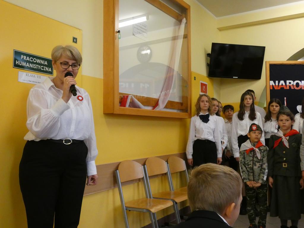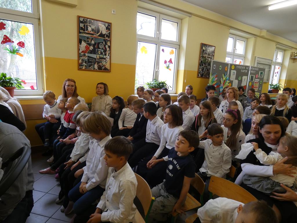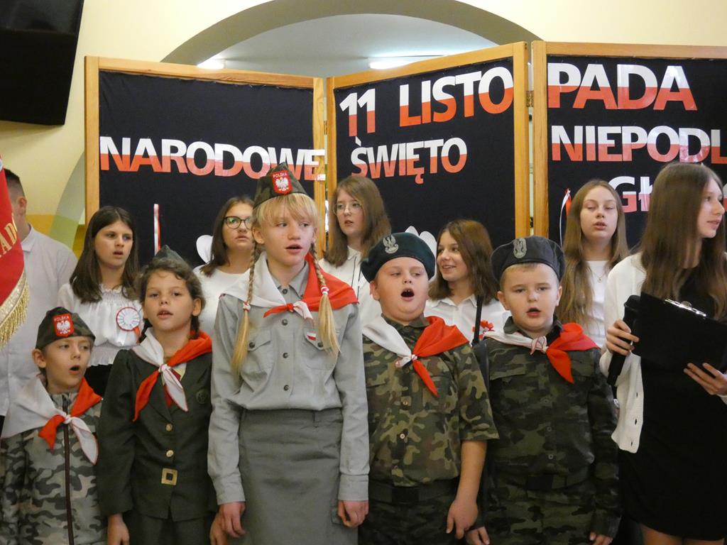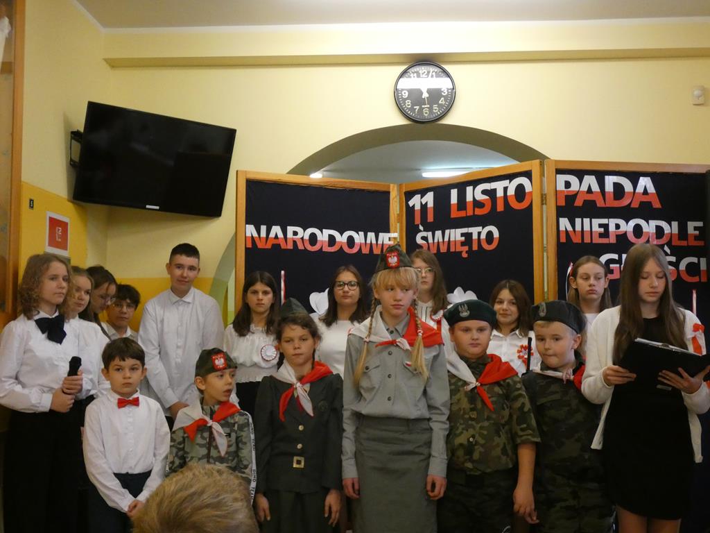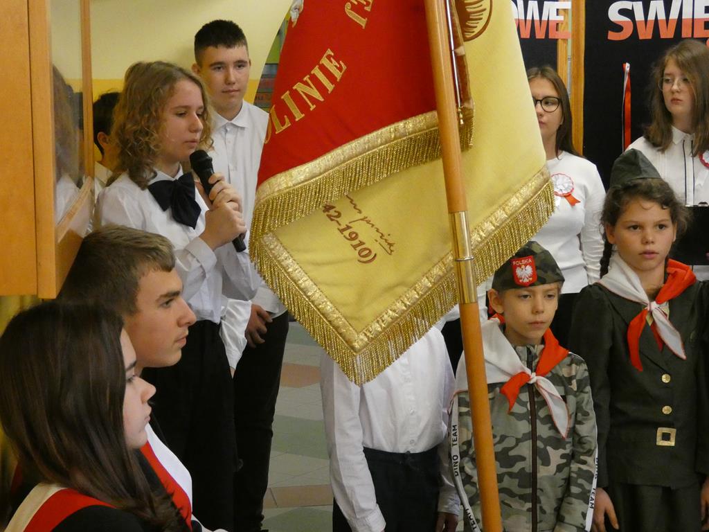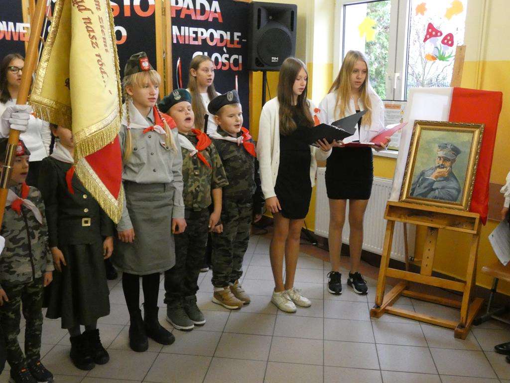 Jak co roku wzięliśmy udział w akcji „Szkoła do hymnu!” i dokładnie o godzinie 11.11 wspólnie odśpiewaliśmy hymn narodowy. Data 11 listopada to symbol walki o wolność oraz wiary w zwycięstwo, dlatego podczas uroczystości prócz „Mazurka Dąbrowskiego” odśpiewano ważne dla Polaków pieśni narodowe: „Rotę” autorstwa Marii Konopnickiej oraz „Pieśń Legionów” w hołdzie dla dowódcy I Brygady Józefa Piłsudskiego, późniejszego Naczelnika naszej Niepodległej Ojczyzny. Podczas występu nie zabrakło również współczesnych utworów patriotycznych oraz refleksji o podstawowych wartościach w życiu współczesnego patrioty. Na szkolnej scenie zaprezentowały się laureaci Gminnego Przeglądu Piosenki Patriotycznej „Golina dla Niepodległej” – koło muzyczne klas I-III, przedszkolaki, a także w występie solowym Magdalena Gauza z klasy III. Wszyscy uczestnicy zajęli w powyższym przeglądzie 2. miejsce w swoich kategoriach wiekowych.