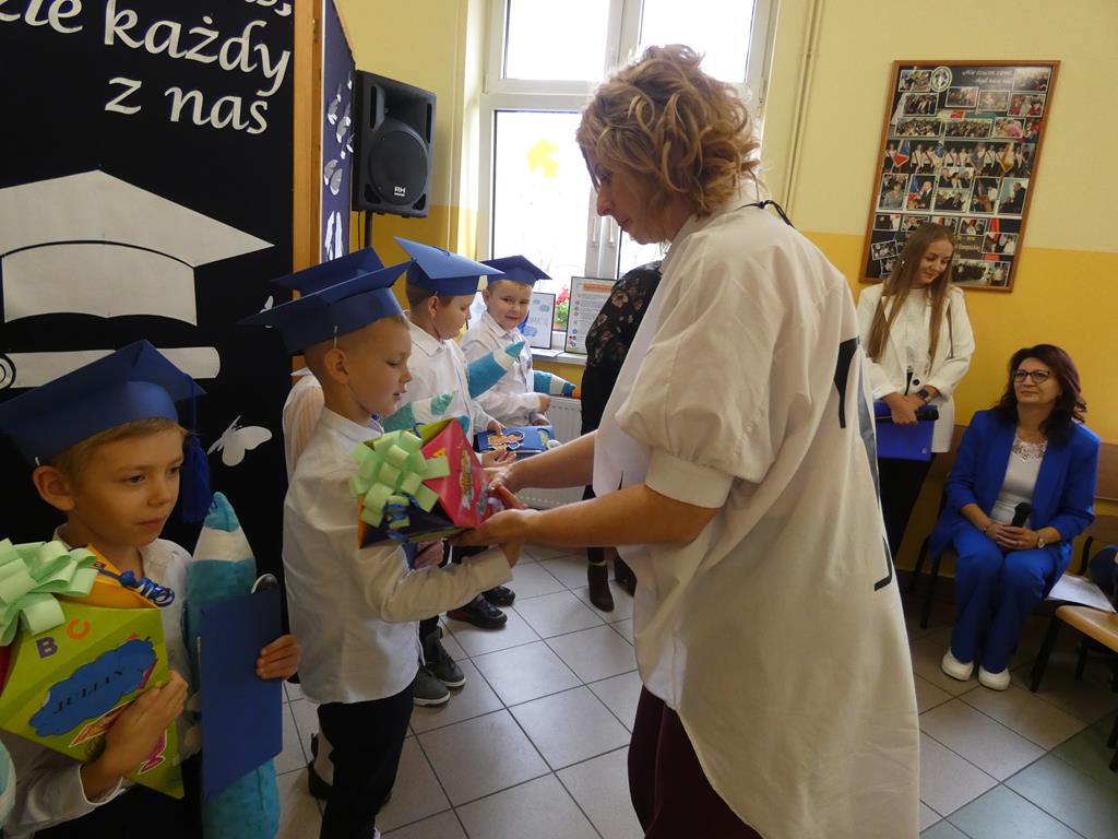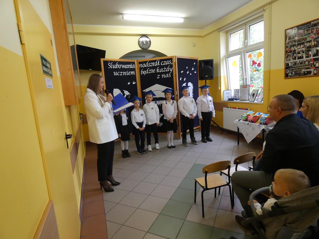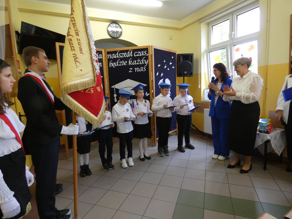 Klasa pierwsza pod okiem swojej wychowawczyni przygotowała na dzień ślubowania część artystyczną, aby zaprezentować swoje umiejętności. Następnie po odśpiewaniu hymnu państwowego nastąpiła część oficjalna uroczystości, podczas której pierwszoklasiści złożyli przysięgę na sztandar szkoły, a Pani Dyrektor dokonała uroczystego pasowania na uczniów SP w Radolinie. Złożyła też życzenia wielu sukcesów w nauce wszystkim uczniom. Następie głos zabrali uczniowie klasy VIII oraz przedstawiciele Rady Rodziców wręczając bohaterom dzisiejszego dnia przygotowane upominki. Po wspólnej fotografii pierwszoklasiści udali się do swojej sali, gdzie rodzice przygotowali słodki poczęstunek.