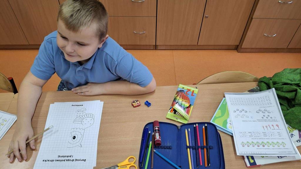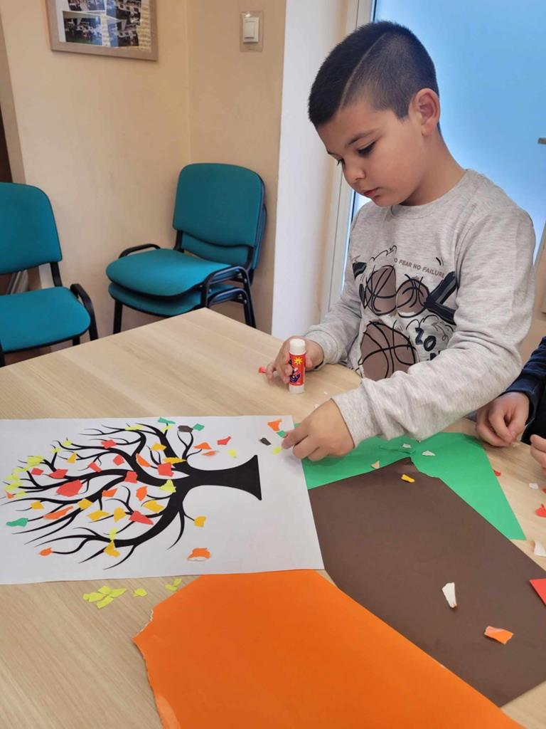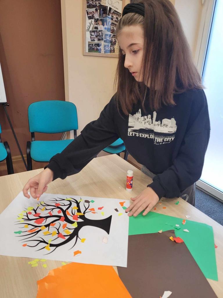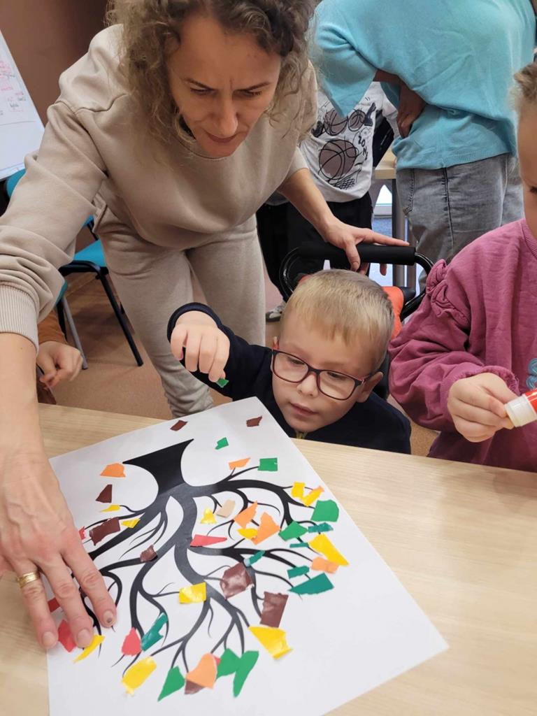W danej chwili tylko jedno z nich przyklejało kawałek wycinanki. W ten sposób każdy uczeń miał swój wkład w powstanie drzewa Na zakończenie spotkania dzieci narysowały jesienny krajobraz.