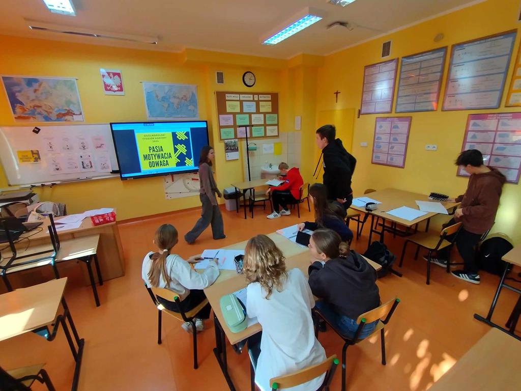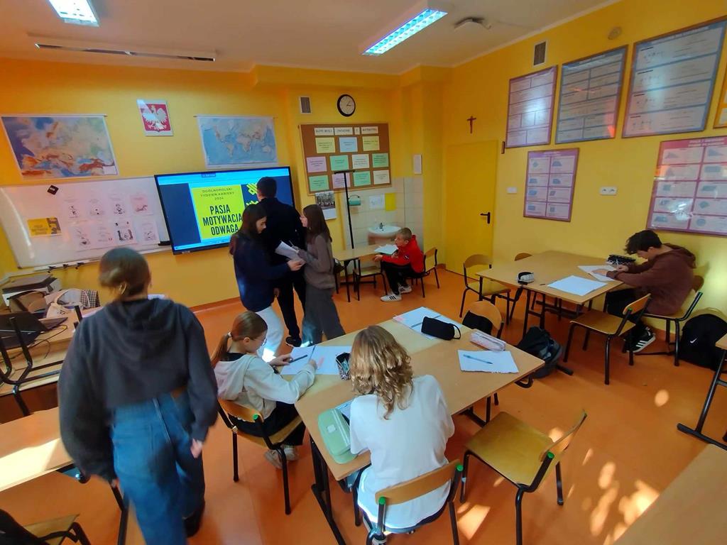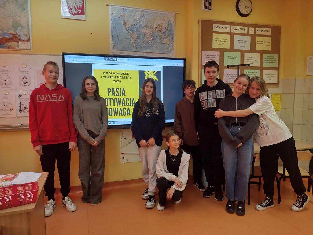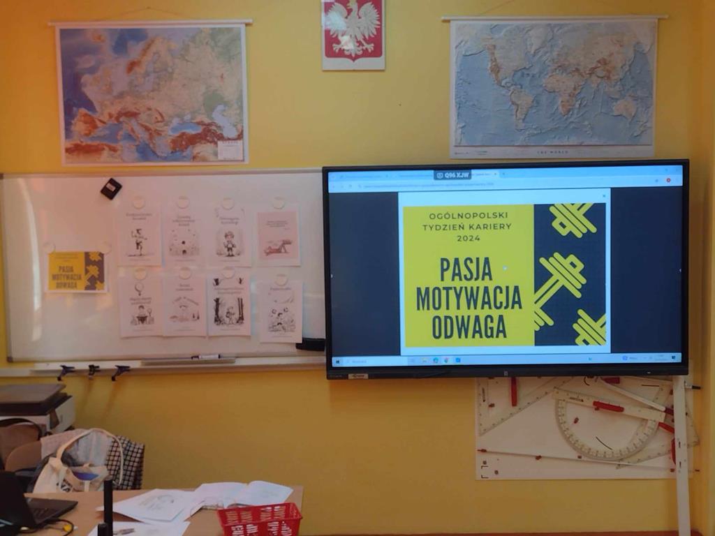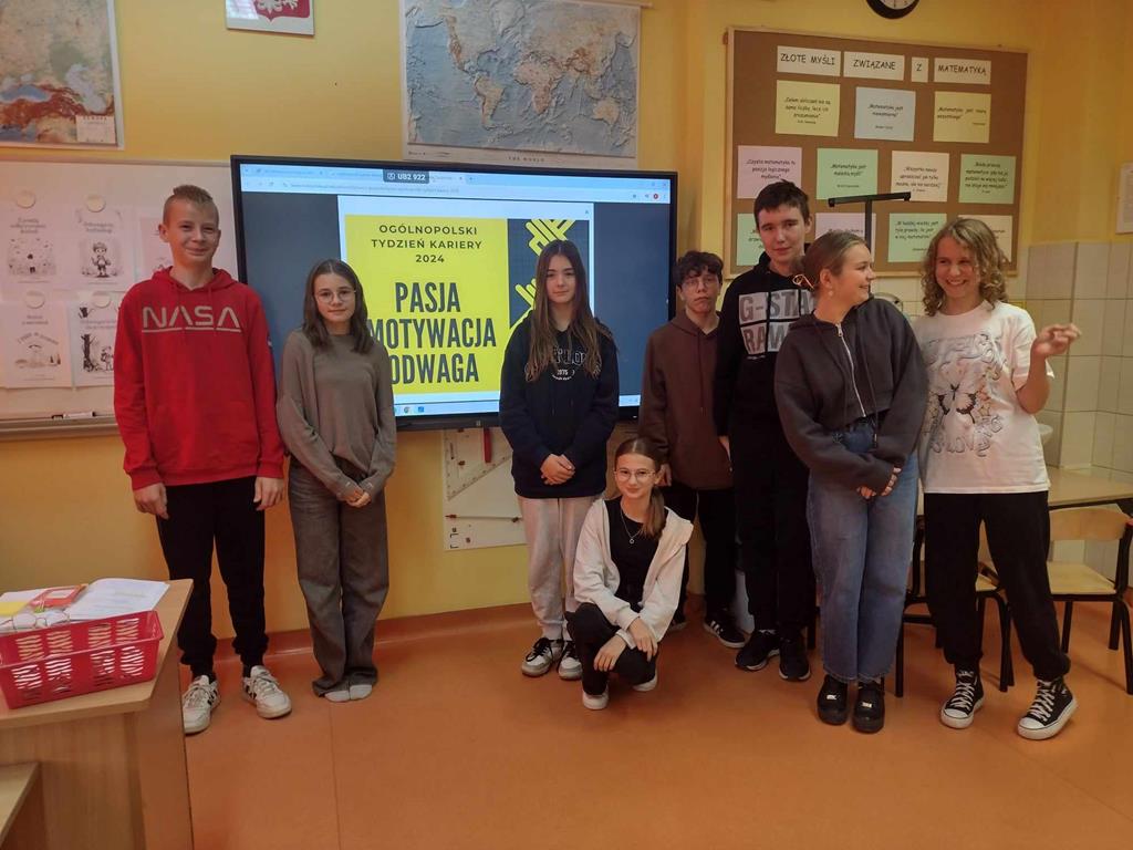 W ramach Ogólnopolskiego Tygodnia Kariery, który w tym roku odbywał się pod hasłem: „Pasja – Motywacja – Odwaga”, uczniowie aktywnie uczestniczyli w inicjatywie podjętej przez nauczyciela doradztwa zawodowego, m.in.: oglądali filmy, których bohaterami byli przedstawiciele różnych zawodów, wypowiadający się na temat motywacji, jaką kierowali się przy wyborze zawodu oraz brali udział w grze zespołowej, w której trzeba było wykazać się znajomością na temat różnych zawodów. Ponadto uczniowie uzyskali wiedzę na temat kompetencji takich jak: empatia, rzetelność, otwartość, znajomość języków i umiejętność współpracy. Uczniowie korzystali z materiałów udostępnionych na stronie Mapa Karier, gdzie znajduje się interaktywna baza informacji o ścieżkach kariery i rynku pracy.