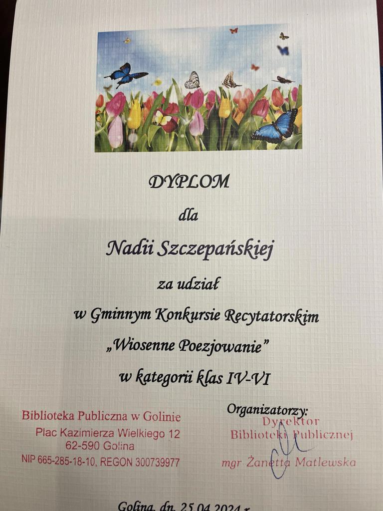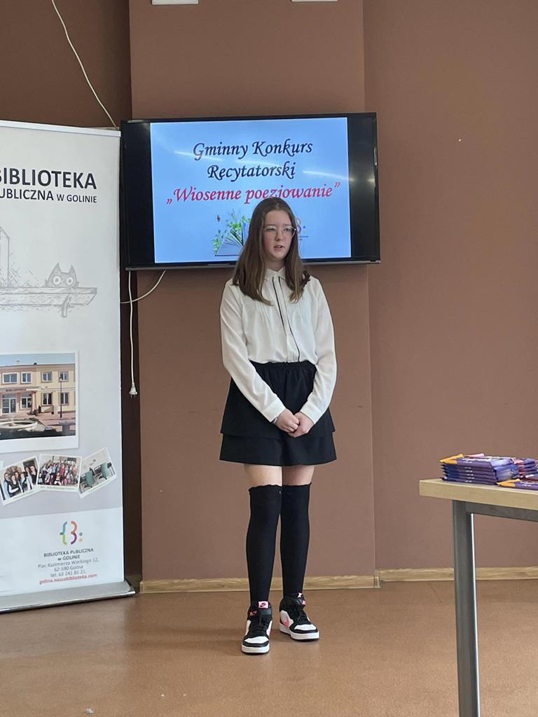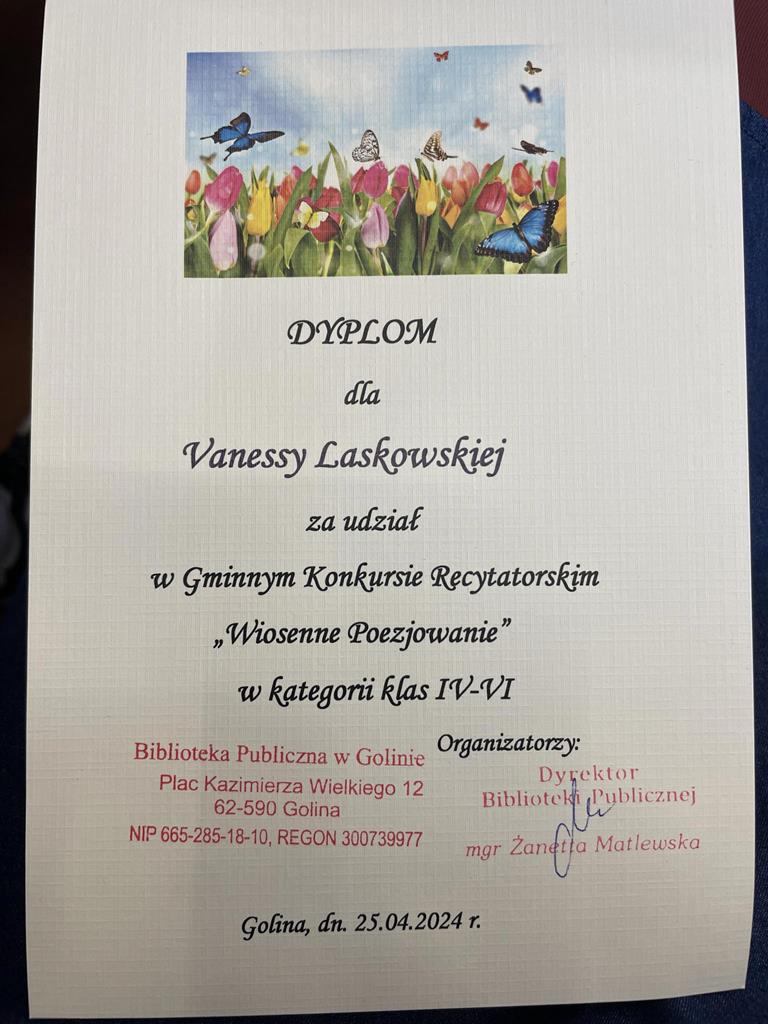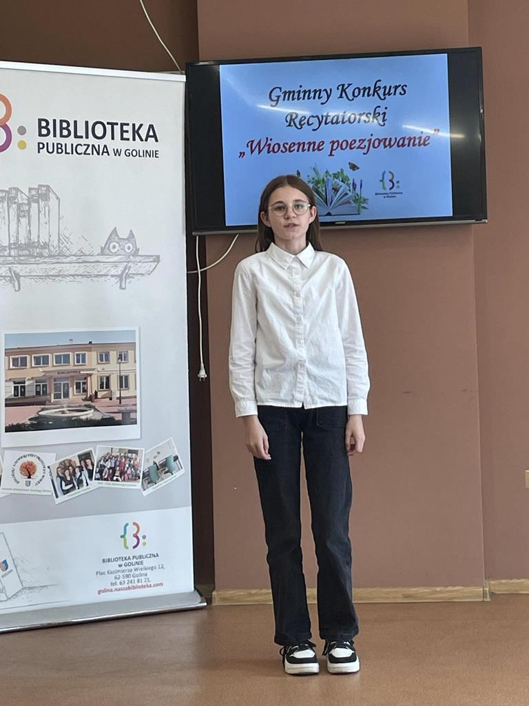 25 kwietnia b.r. w Bibliotece Publicznej w Golinie odbyła się kolejna edycja Gminnego Konkursu Recytatorskiego „Wiosenne poezjowanie”. Wzięły w nim również udział uczennice naszej szkoły. W kategorii klas I- III Szkołę Podstawową im. M. Konopnickiej w Radolinie reprezentowała Magdalena Gauza z kl. II, natomiast w kategorii klas IV- VI- Nadia Szczepańska (V) i Vanessa Laskowska (VI). Jury w składzie: pani Żanetta Matlewska (przewodnicząca), pani Irena Elantkowska oraz pani Monika Łasińska oceniały prezentacje pod kątem doboru repertuaru, poprawności dykcyjnej, własnej interpretacji oraz ogólnego wyrazu artystycznego. Magdalena G. przedstawiła wiersz Wł. Bełzy pt. „Bocian”, Nadia Sz.- utwór „Uwaga! Świeżo malowane!” M. Terlikowskiej, a Vanessa L.- wiersz H. Łochockiej pt. ”Wiosna”. Dziękujemy uczennicom za zaangażowanie i godne reprezentowanie naszej szkoły!