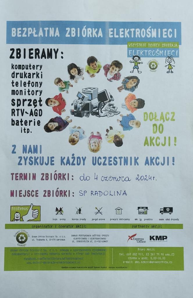 Nasza szkoła bierze udział w akcji "Wszystkie dzieci zbierają elektrośmieci" - jeśli posiadacie w domu zużyte urządzenia gospodarstwa domowego, sprzęty informatyczne, sprzęt audiowizualny, narzędzia, zabawki elektroniczne zachęcamy do wsparcia akcji. Sprzęt można przywozić do szkoły.