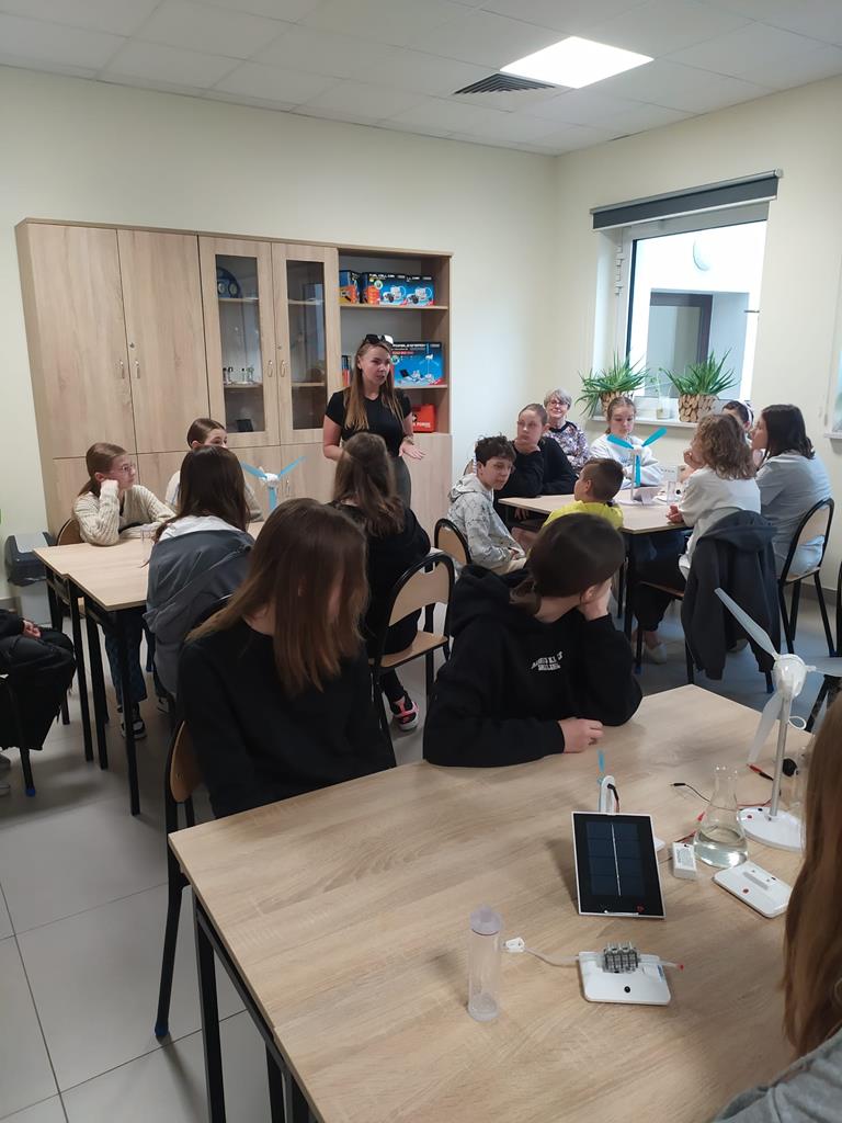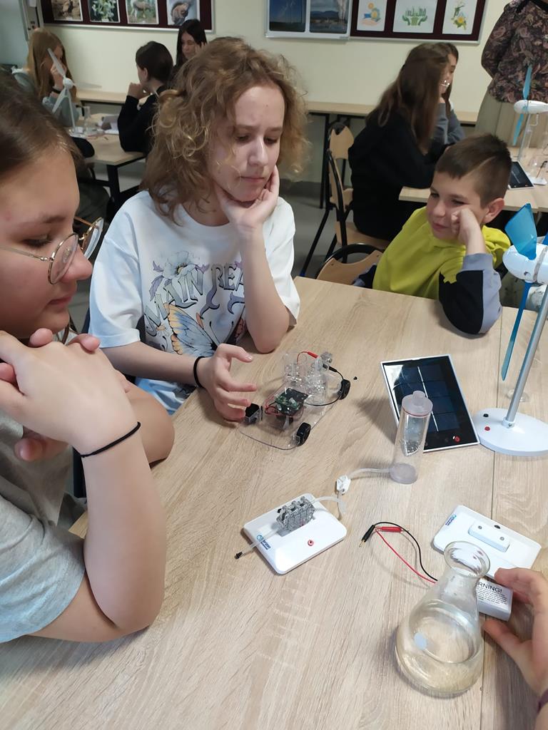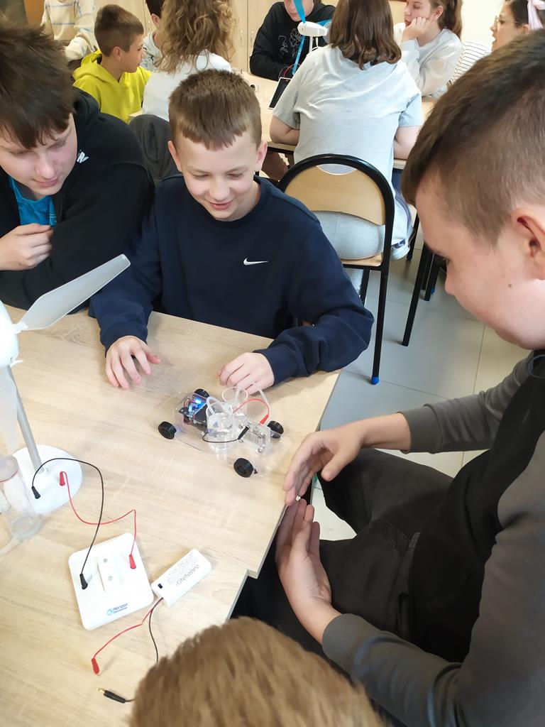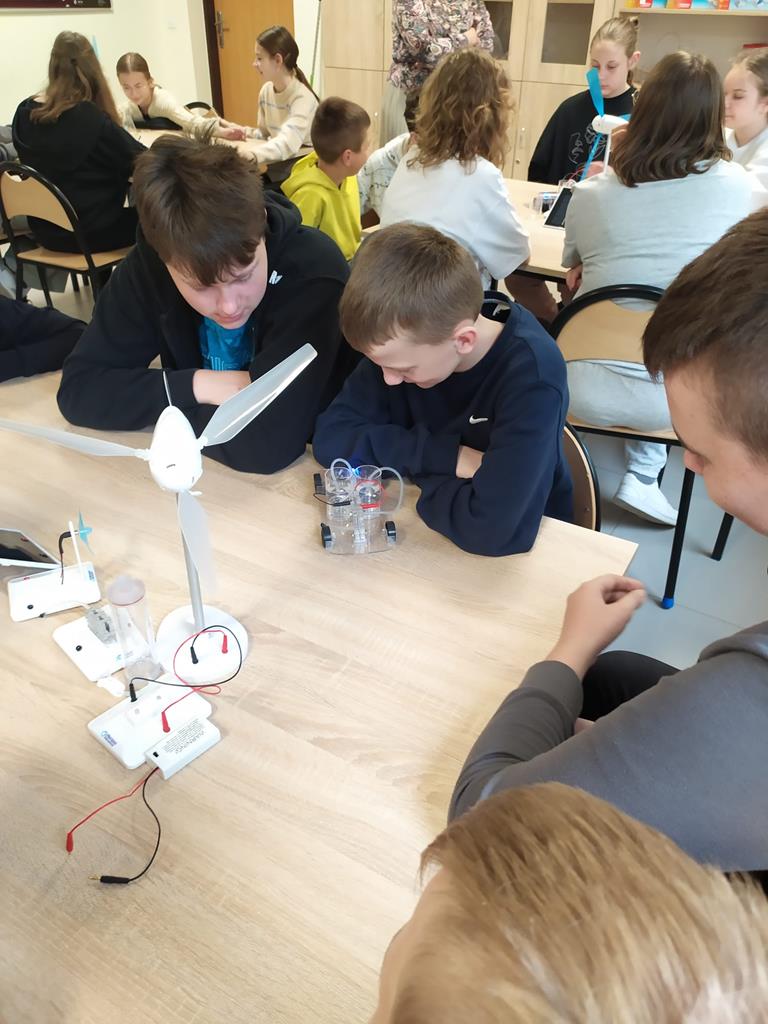 7 maja 2024r. nasi uczniowie klas 3-7 uczestniczyli w Szkole Podstawowej im. St. Wyspiańskiego w Kawnicach w zajęciach dotyczących odnawialnych źródeł energii. Celem zajęć było kształtowanie postaw proekologicznych uczniów. Zajęcia odbyły się w nowoczesnej ekopracowni wyposażonej ze środków Wojewódzkiego Funduszu Ochrony Środowiska i Gospodarki Wodnej w Poznaniu oraz Narodowego Funduszu Ochrony Środowiska i Gospodarki Wodnej. Uczniowie w ramach zajęć, które miały charakter przede wszystkim warsztatów mogli zapoznać się z zasadą działania auta z napędem wodorowym, modelami fotowoltaicznymi, modelami turbin wodnych.