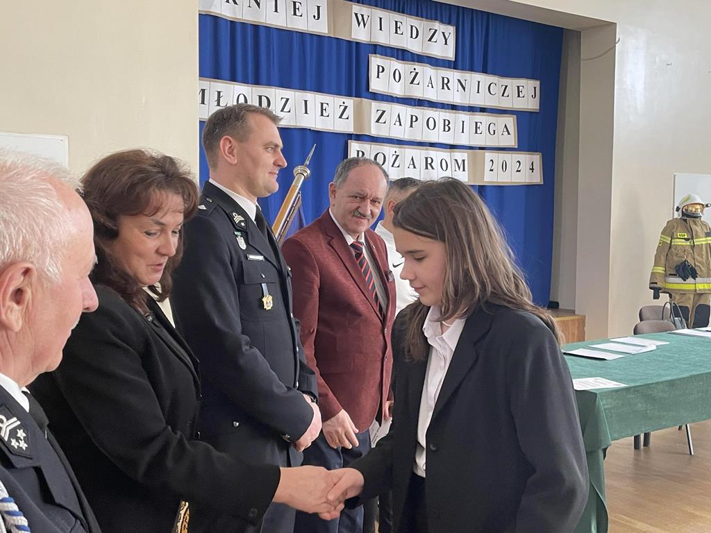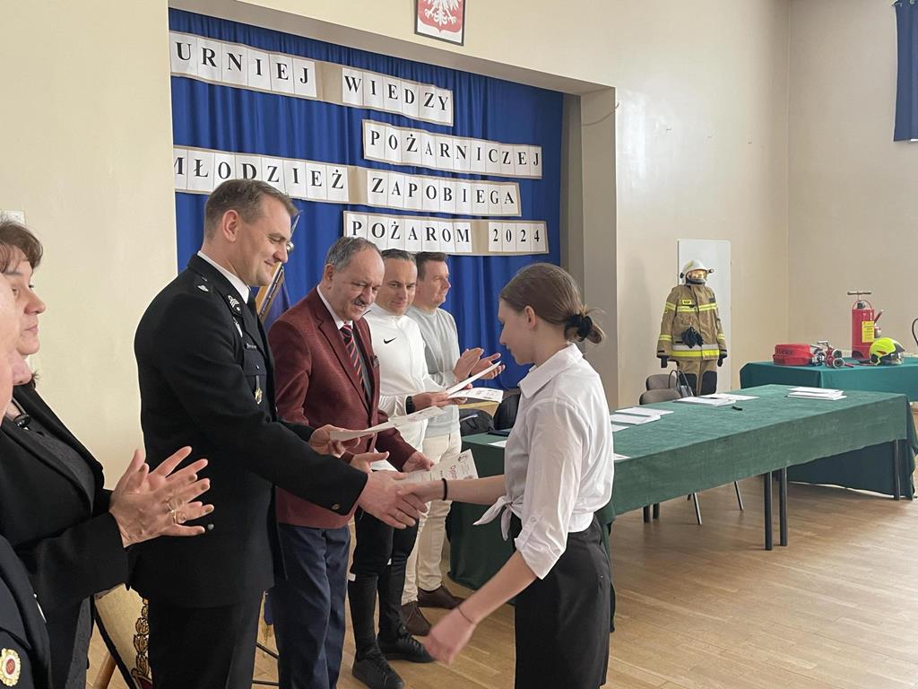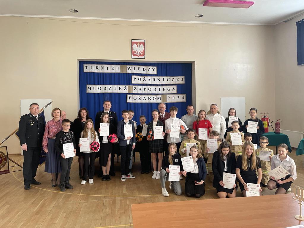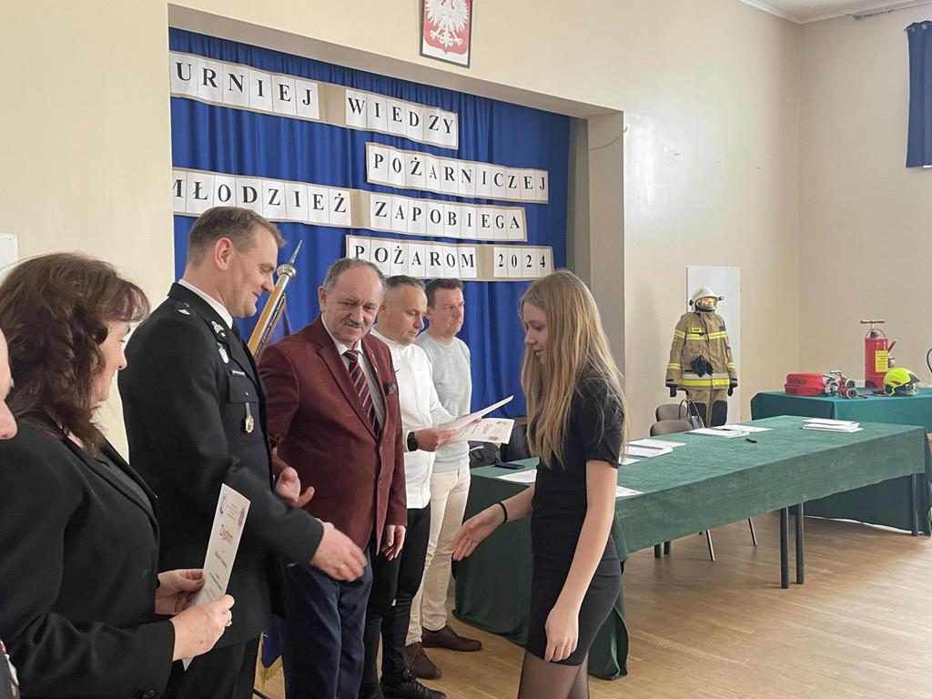 Dnia 26 marca b.r. uczennice klasy siódmej naszej szkoły: Dominika Grzesiak, Zuzanna Kurleto i Wiktoria Urbańska wzięły udział w kolejnej edycji konkursu wiedzy pożarniczej „Młodzież zapobiega pożarom” na szczeblu gminnym, który odbył się gościnnie w Szkole Podstawowej im. M.C. Skłodowskiej w Przyjmie. Turniej ten dotyczył znajomości przepisów przeciwpożarowych, zasad postępowania na wypadek pożarów, praktycznych umiejętności posługiwania się podręcznym sprzętem gaśniczym, wiedzy na temat techniki pożarniczej, organizacji ochrony przeciwpożarowej oraz historii i tradycji ruchu strażackiego. Miał on formę pisemnego testu zawierającego 20 pytań zamkniętych. Najwyższy wynik z naszej szkoły uzyskała Wiktoria Urbańska. Uczennice za udział zostały nagrodzone pamiątkowymi dyplomami. Gratulujemy odwagi zmierzenia się z tak rozległą wiedzą pozaszkolną!