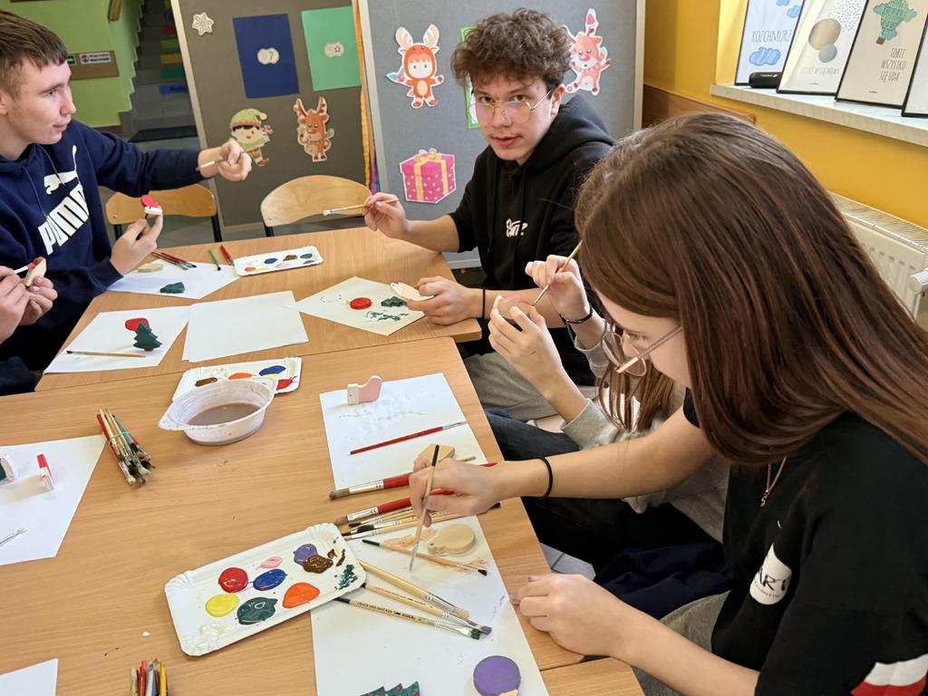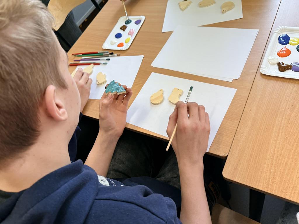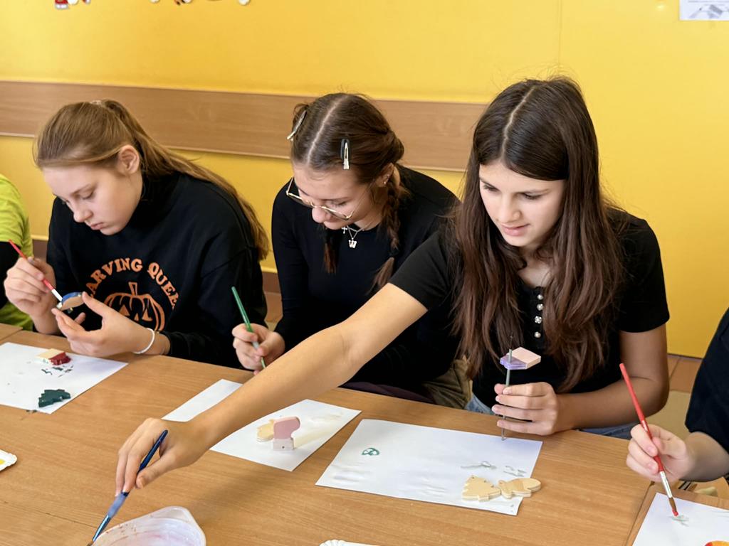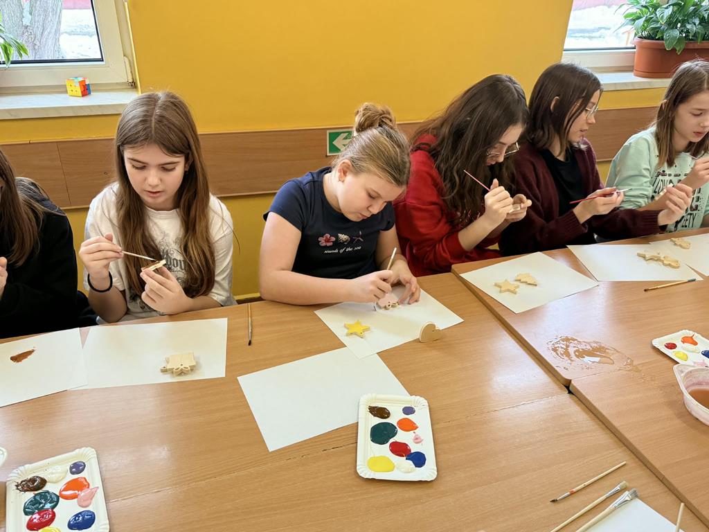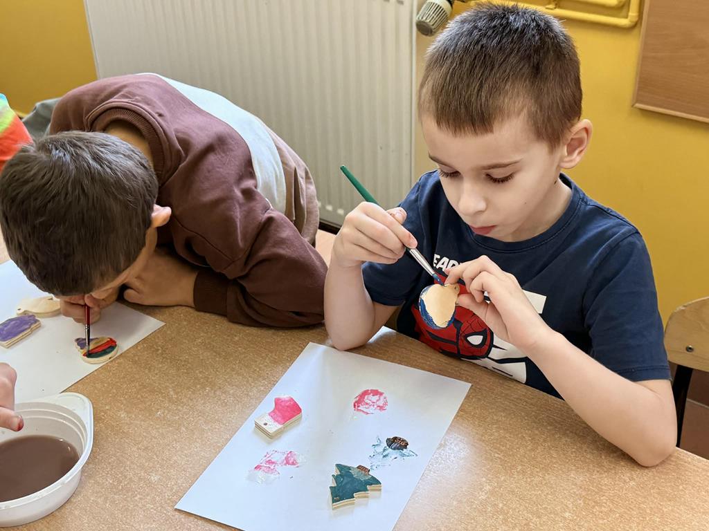 Uczniowie z zapałem malowali drewniane dekoracje, wykorzystując kolorowe farby. Kreatywność i radość tworzenia można było dostrzec na każdej twarzy! Wspólna praca sprawiła, że czas upłynął w niezwykle przyjemnej atmosferze.