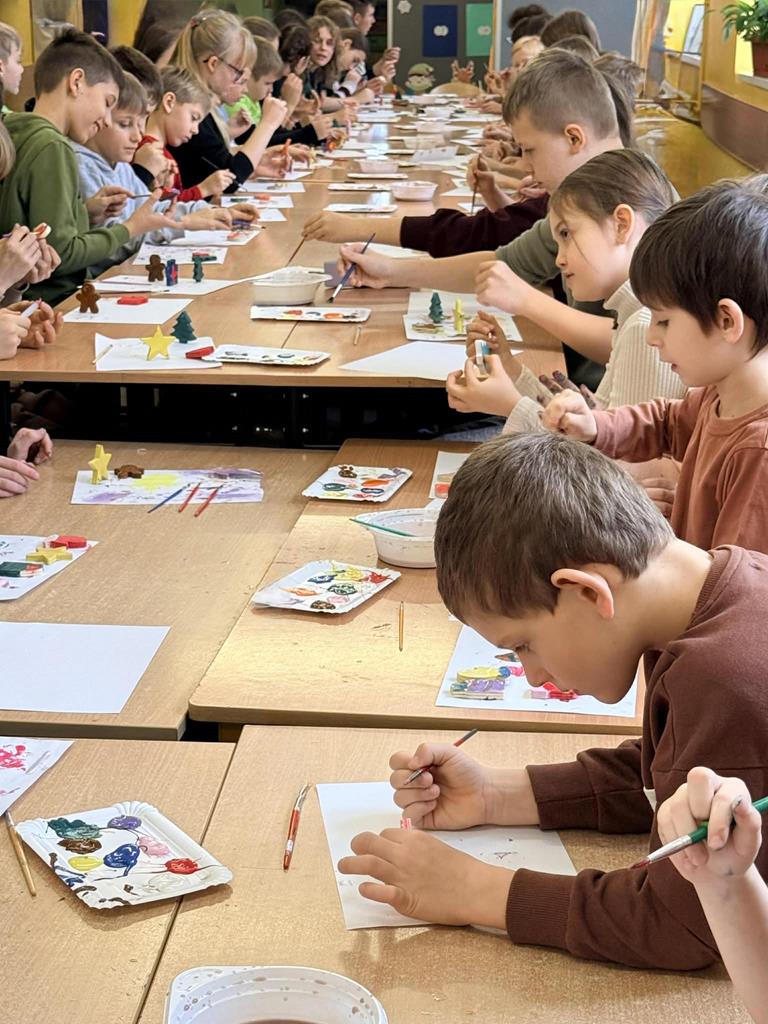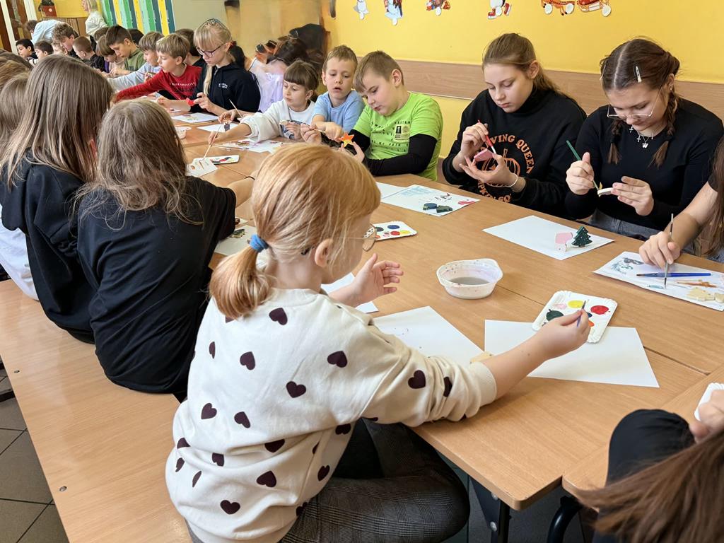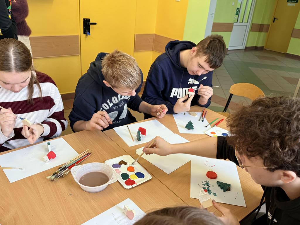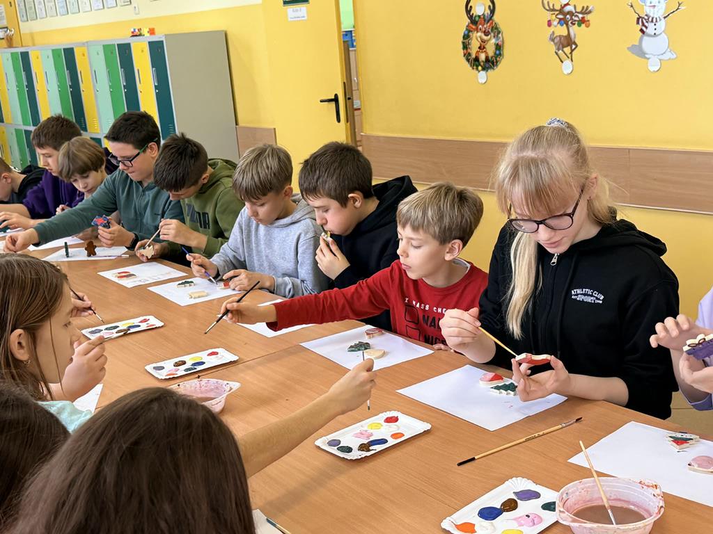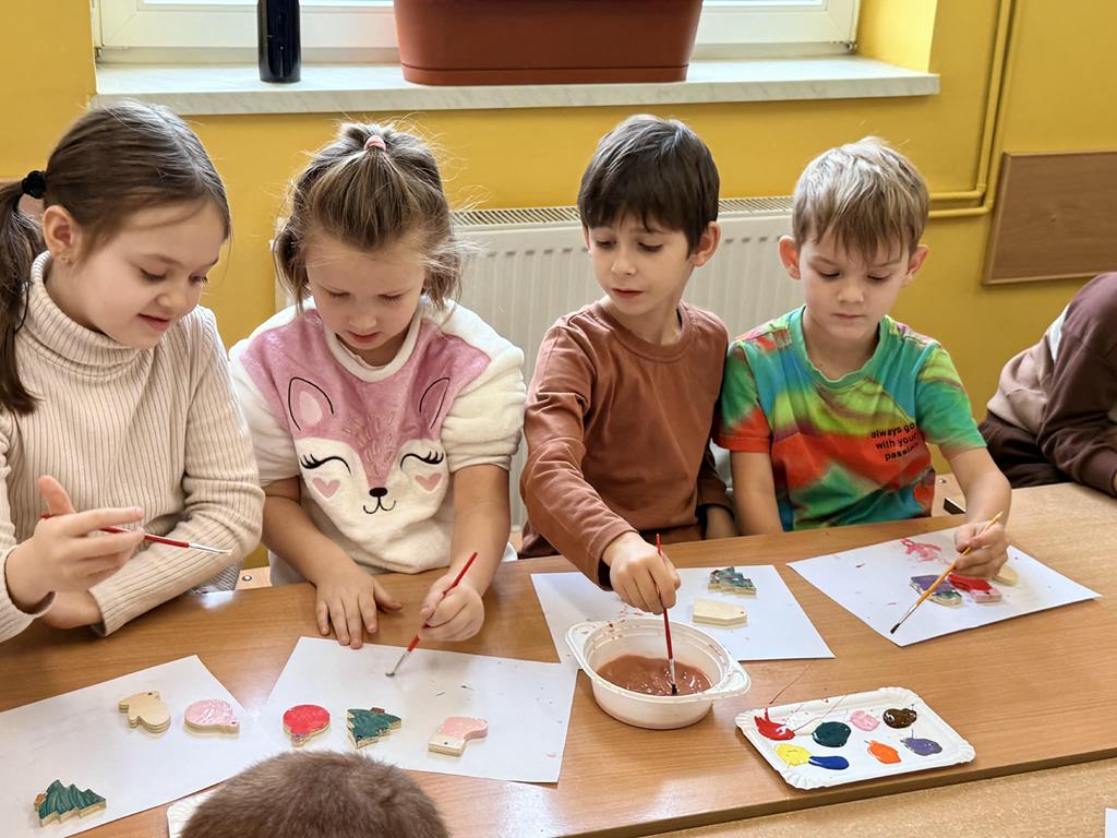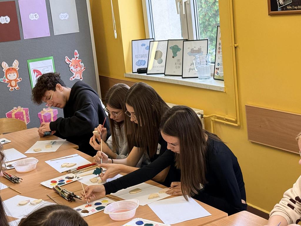 Uczniowie z zapałem malowali drewniane dekoracje, wykorzystując kolorowe farby. Kreatywność i radość tworzenia można było dostrzec na każdej twarzy! Wspólna praca sprawiła, że czas upłynął w niezwykle przyjemnej atmosferze.