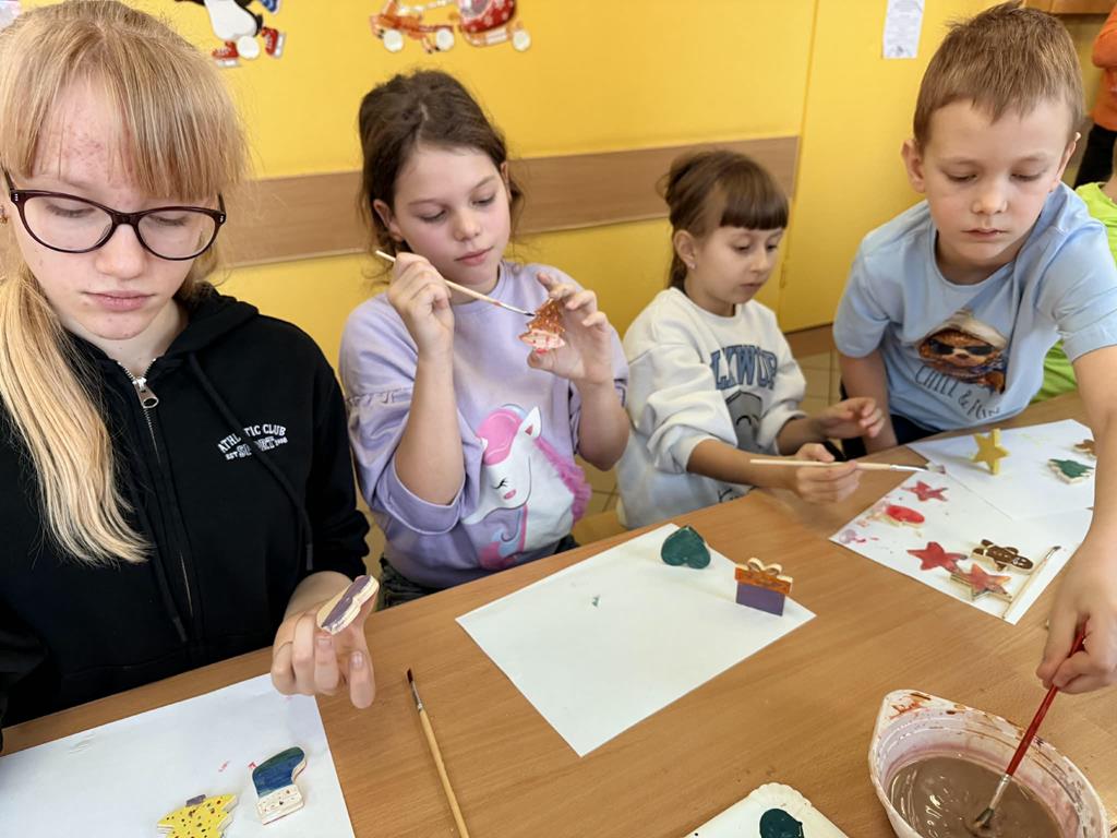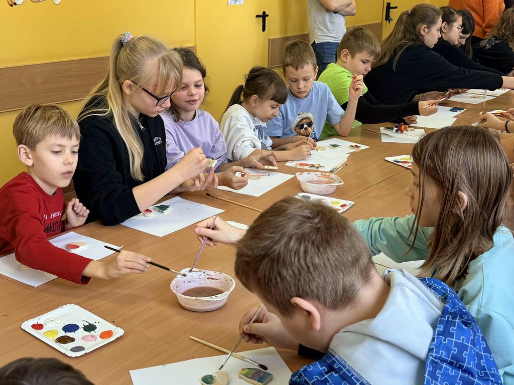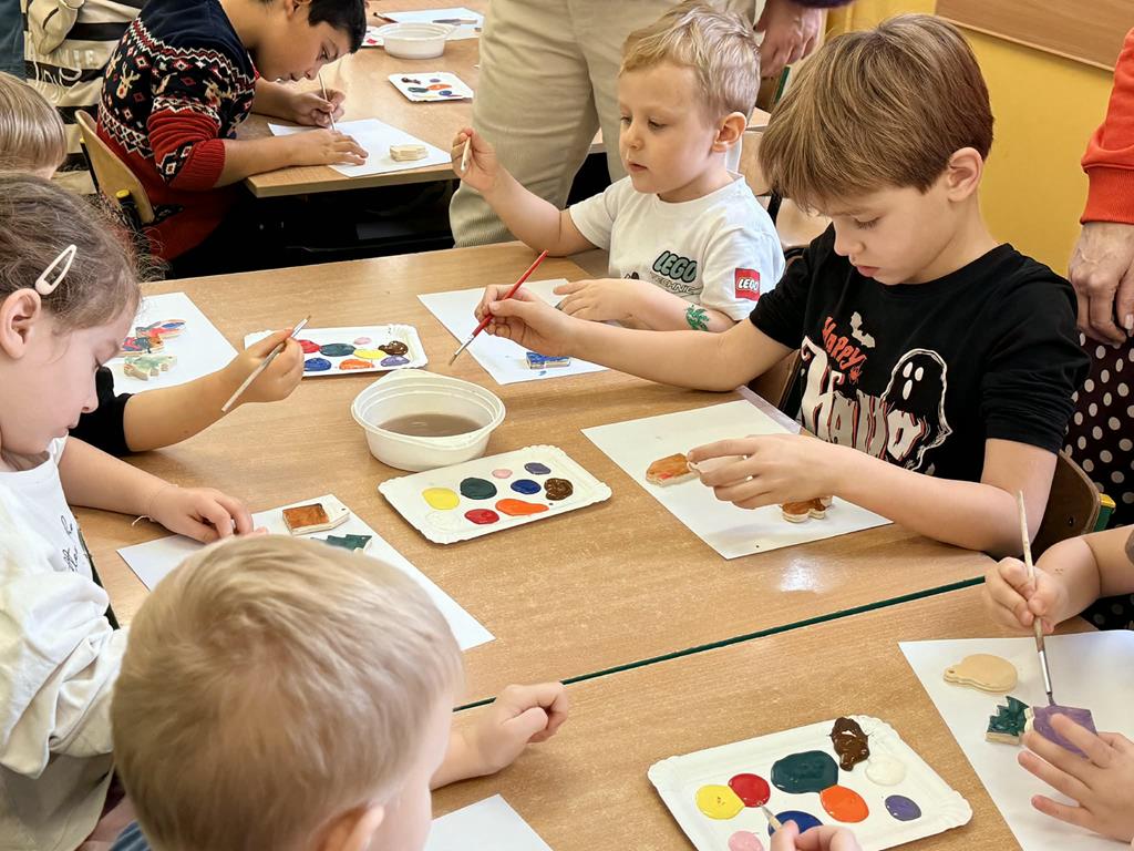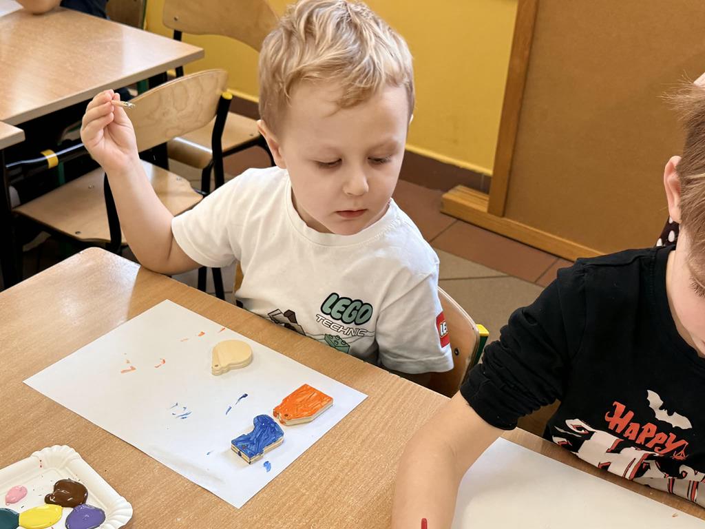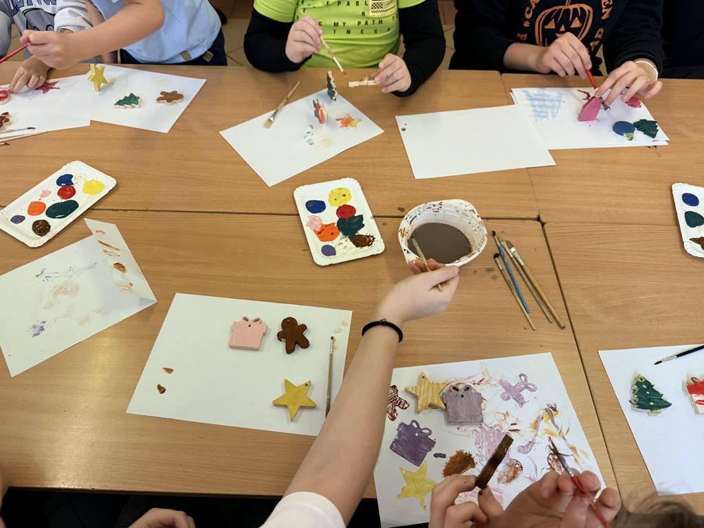 Uczniowie z zapałem malowali drewniane dekoracje, wykorzystując kolorowe farby. Kreatywność i radość tworzenia można było dostrzec na każdej twarzy! Wspólna praca sprawiła, że czas upłynął w niezwykle przyjemnej atmosferze.