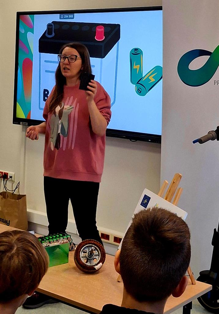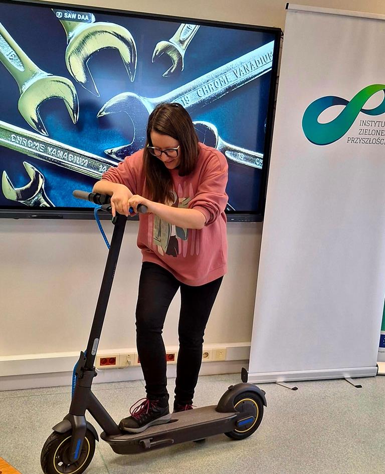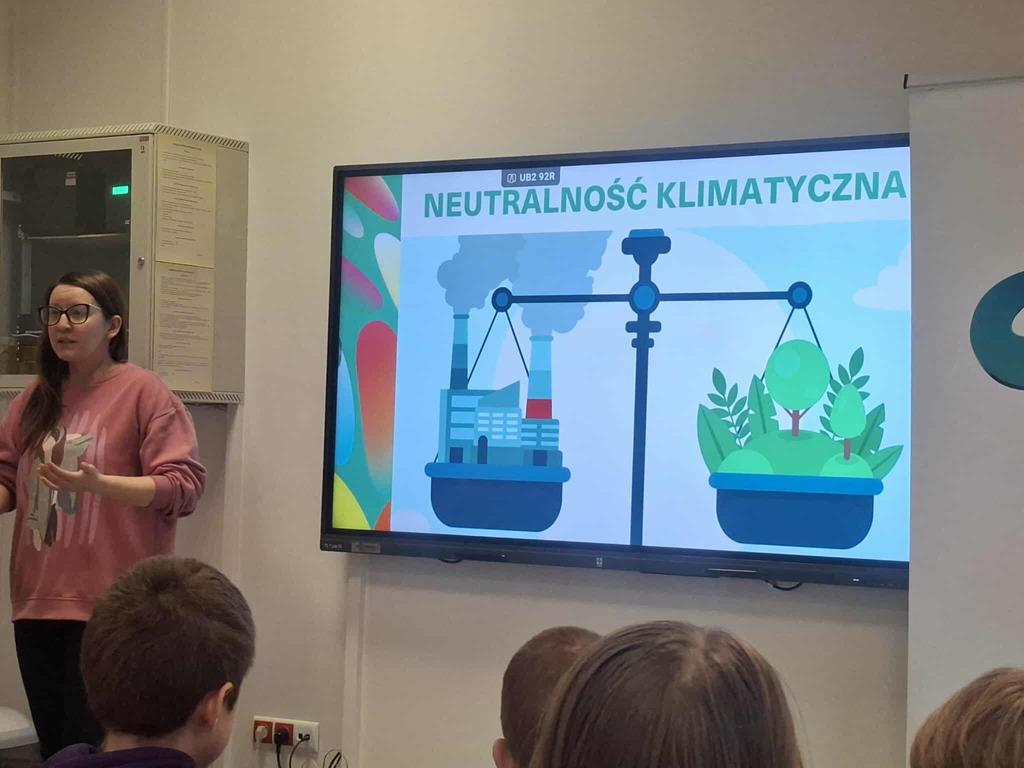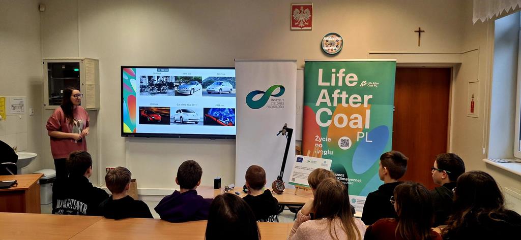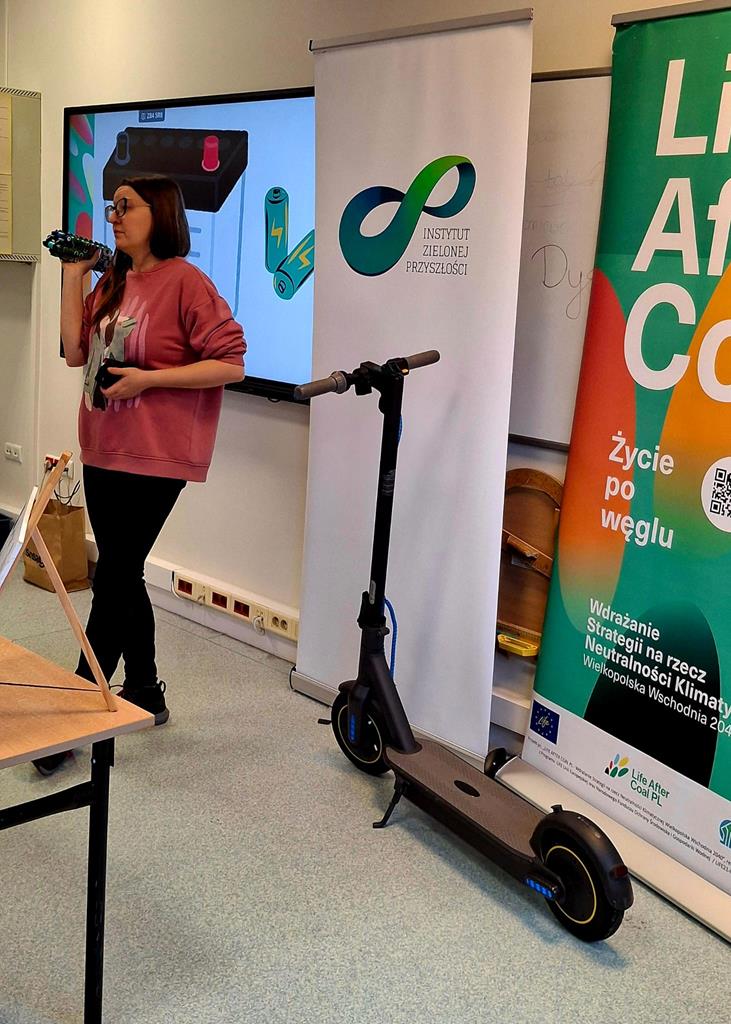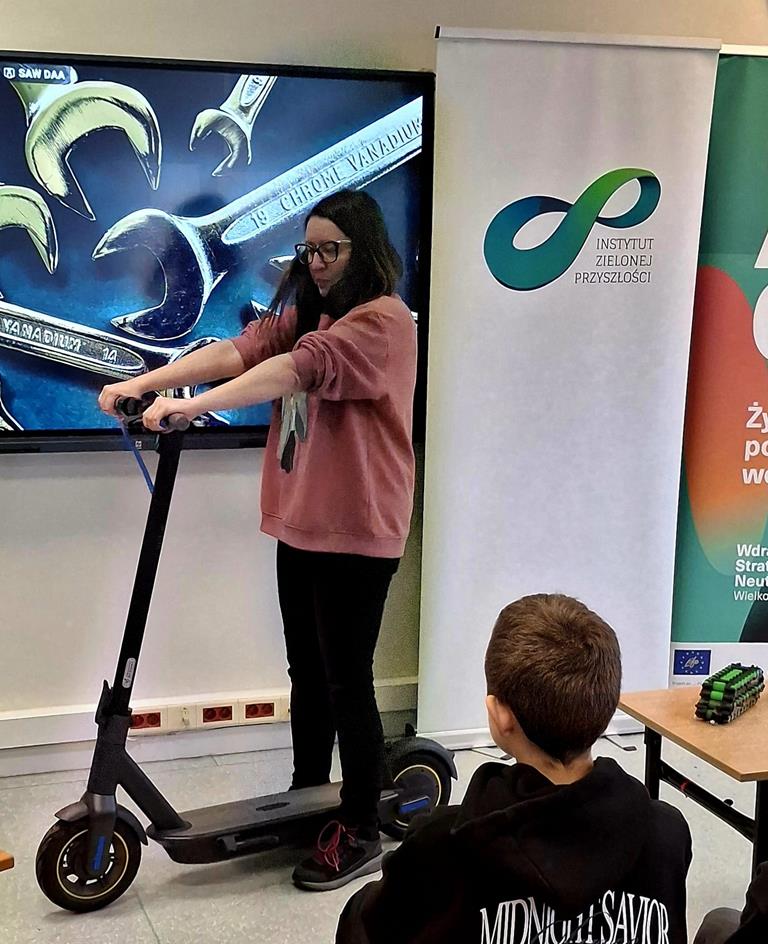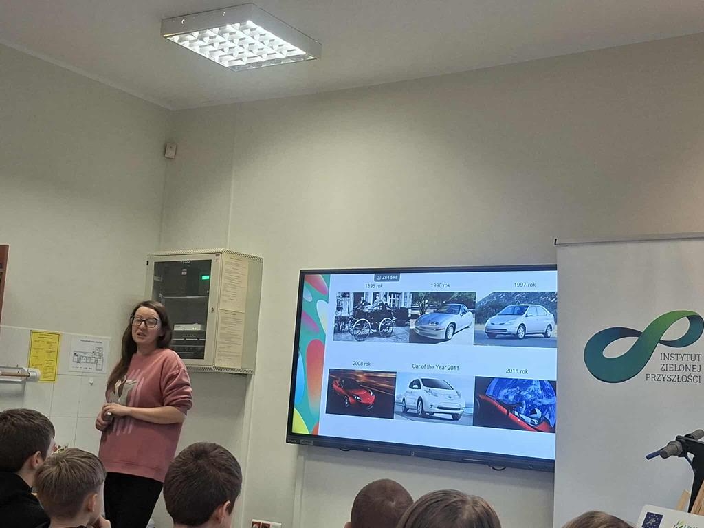 Prowadząca przedstawiła uczniom w jaki sposób zmieniał się klimat na naszej planecie przez około 10 tys. lat oraz wskazała jakie skutki miała rewolucji przemysłowej na przełomie XIX i w XX wieku na proces ocieplania naszej planety. Przedstawiła możliwości działań, aby choć w małym stopniu zmniejszyć emisję gazów cieplarnianych i zanieczyszczeń. Jednym z możliwości jest elektromobilność. Oprócz aspektów typowo ekologicznych pani Agata zwróciła szczególną uwagę na bezpieczne korzystanie z hulajnóg elektrycznych, na konieczność używania kasków oraz przestrzegania zasad ruchu drogowego i poruszania się z właściwą prędkością.