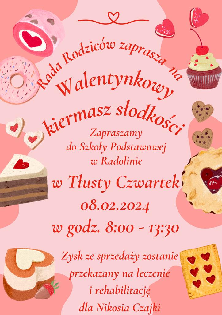 Rada Rodziców zaprasza na Walentynkowy kiermasz słodkości, który odbędzie się w Tłusty Czwartek