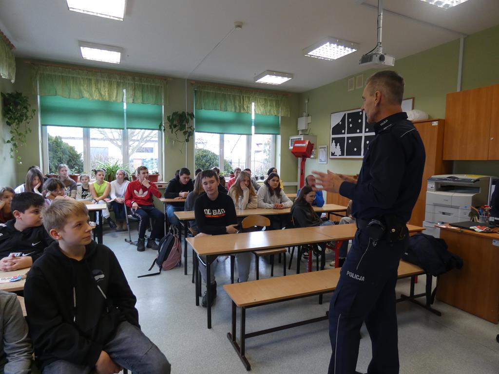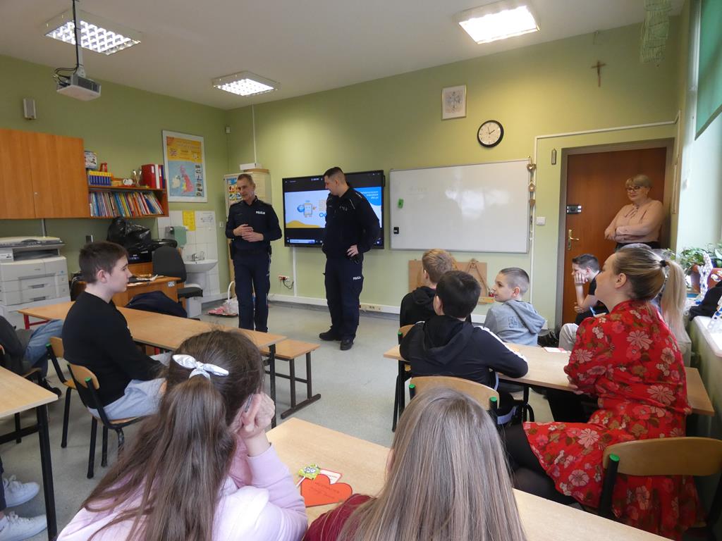 Dbając o bezpieczeństwo naszych uczniów w czasie ferii zimowych, 8 lutego odbyło się spotkanie profilaktyczno – edukacyjne z funkcjonariuszami policji z Posterunku Policji w Golinie: panami Błażejem Borowcem i Mateuszem Grymuzą, dla uczniów naszej szkoły.