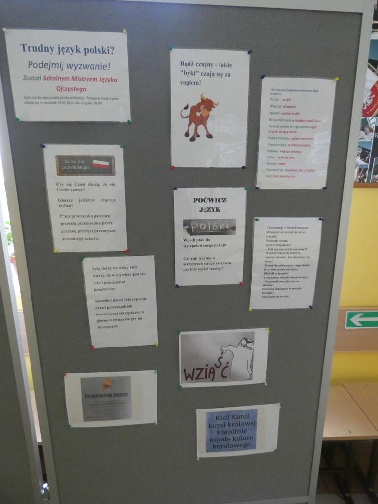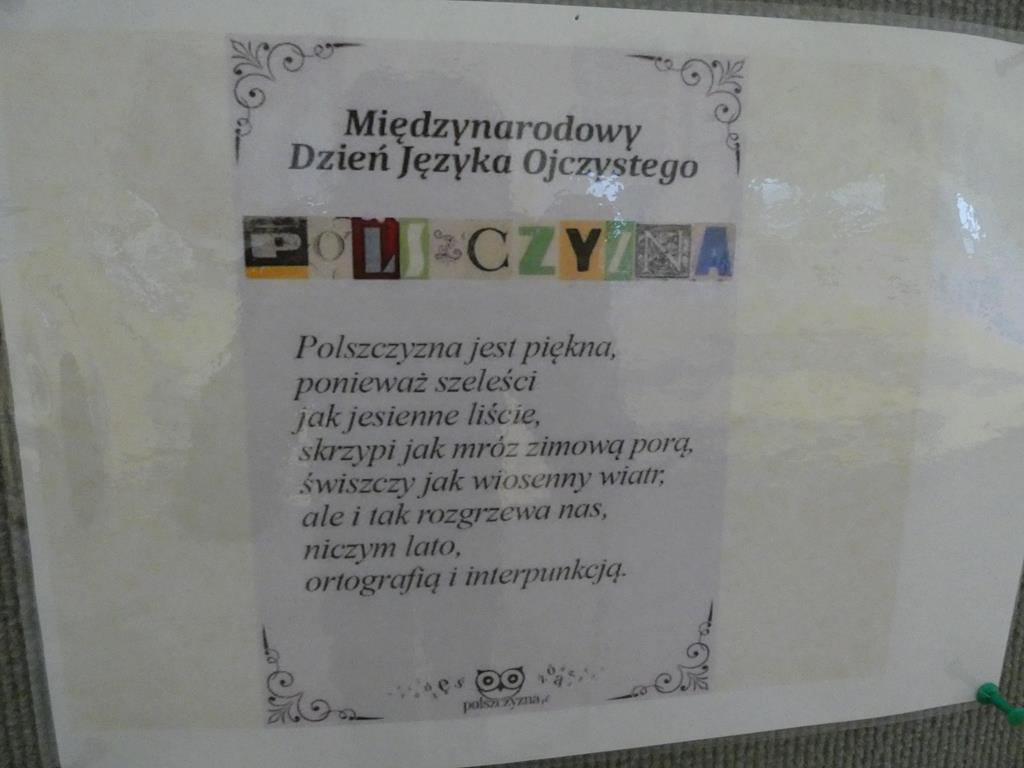 W ramach obchodów Międzynarodowego Dnia Języka Ojczystego w naszej szkole przygotowano specjalną prezentację. Uczniowie mogli poznać m.in. ciekawostki dotyczące języka polskiego oraz sposoby wzbogacania słownictwa. Uwaga uczniów została skierowana również na najczęściej popełniane błędy językowe. Korzystając z tekstów zamieszczonych w prezentacji można było poćwiczyć czytanie tzw. łamańców językowych.