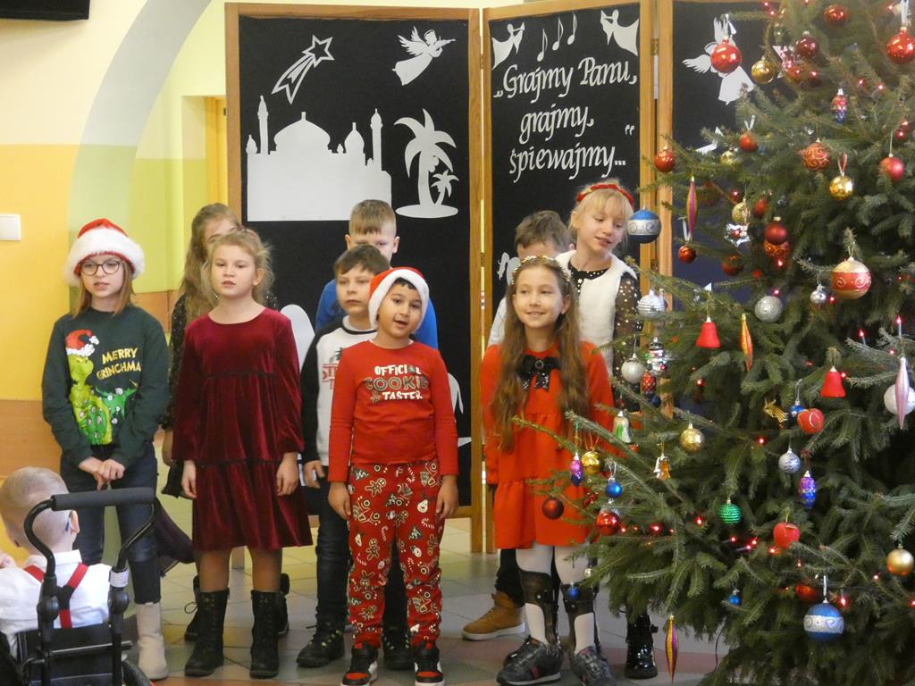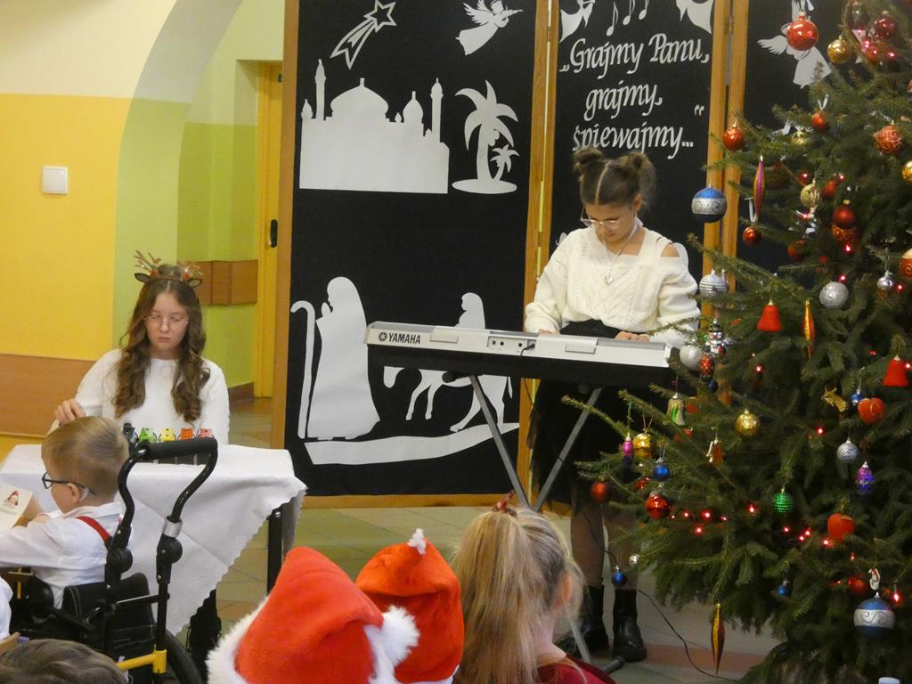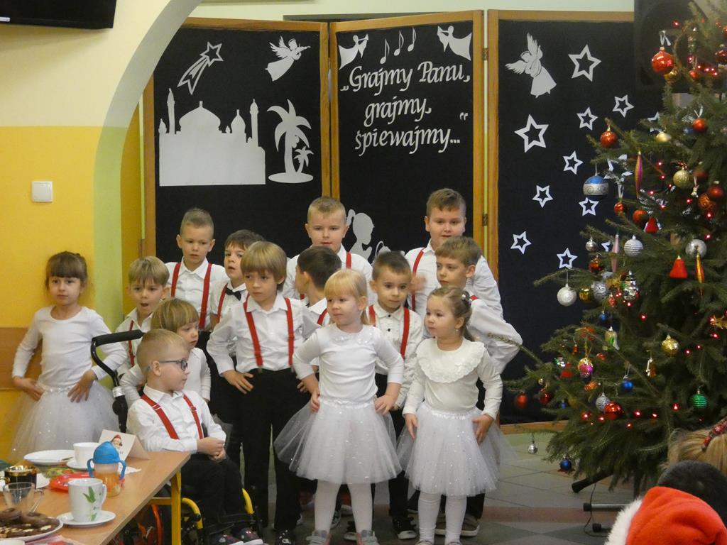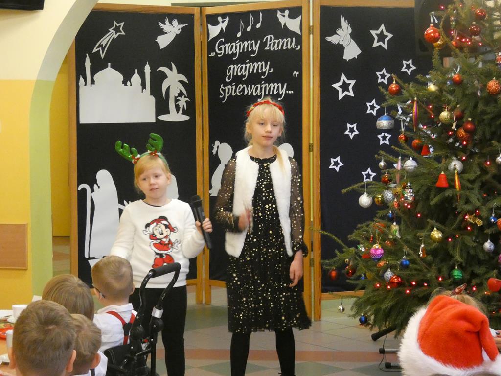 Nasze występy rozpoczęło koło muzyczne. W wykonaniu Nadii Kasprzyk i Nadii Szczepańskiej usłyszeliśmy instrumentalną wersję kolędy „ Lulajże Jezuniu” a po ich występie „Piosenkę dla Świętego Mikołaja” w wykonaniu Magdaleny Gauzy i Sary Karnafel .Po nich zerówka oraz przedszkolaki zaśpiewały kolędę „Przybieżeli do Betlejem”.