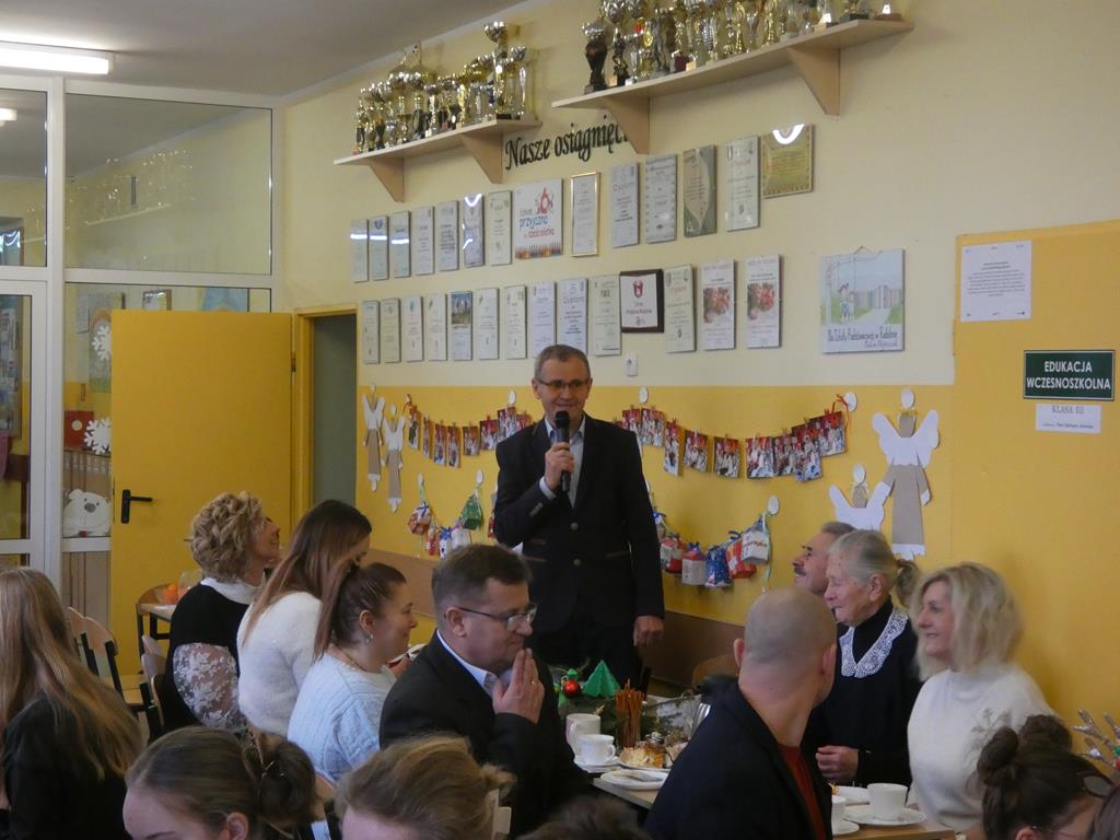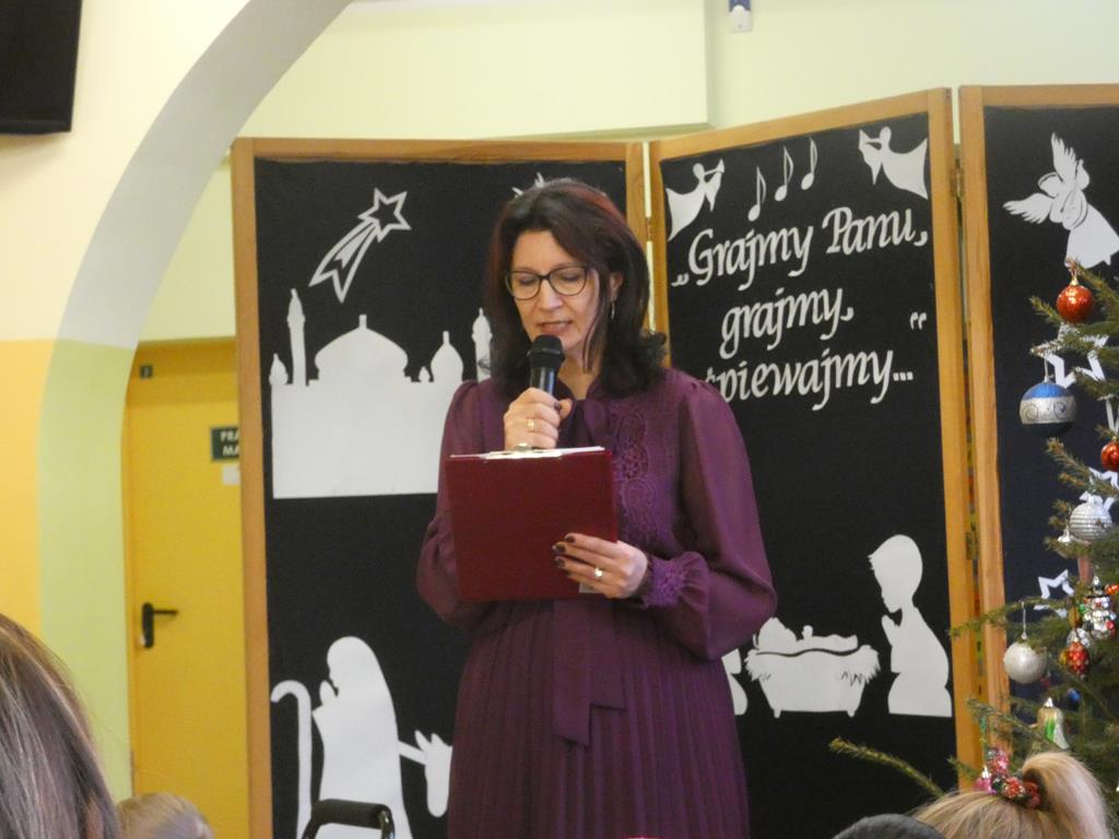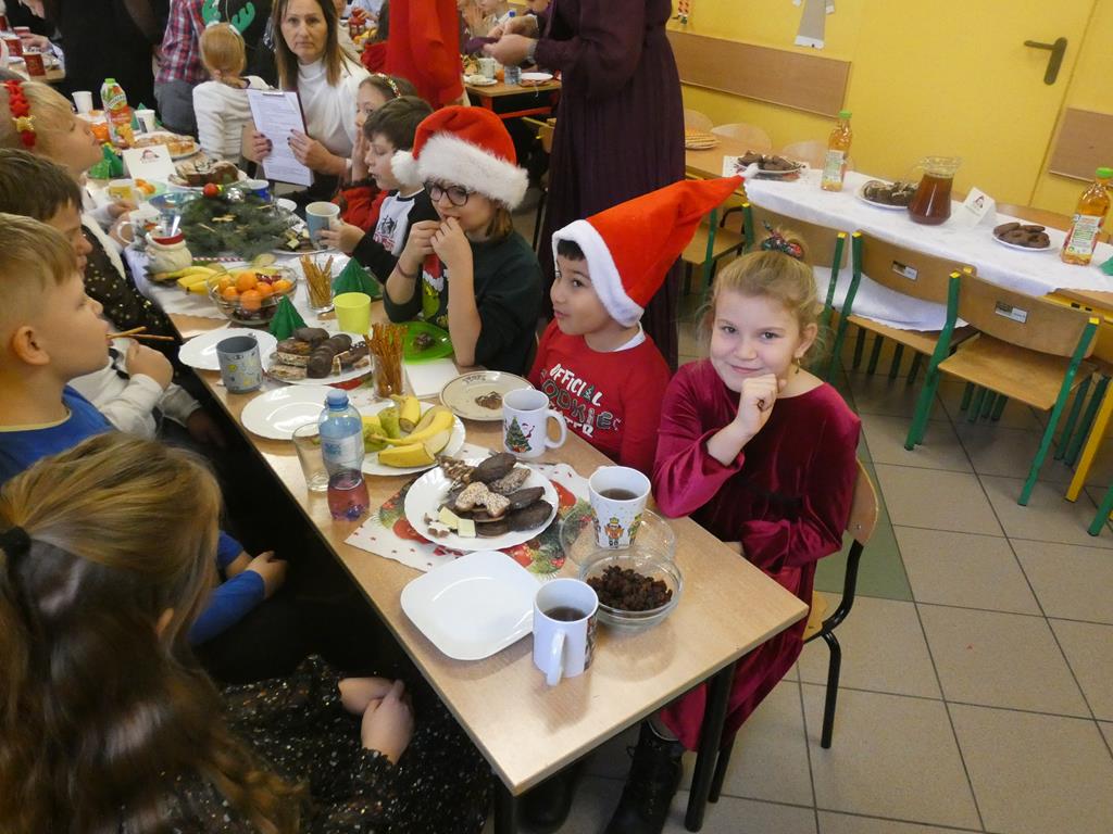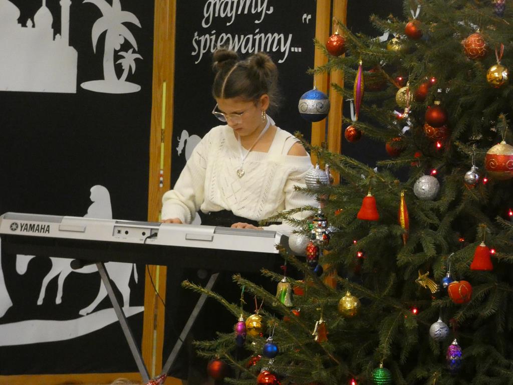 Nasze występy rozpoczęło koło muzyczne. W wykonaniu Nadii Kasprzyk i Nadii Szczepańskiej usłyszeliśmy instrumentalną wersję kolędy „ Lulajże Jezuniu” a po ich występie „Piosenkę dla Świętego Mikołaja” w wykonaniu Magdaleny Gauzy i Sary Karnafel .Po nich zerówka oraz przedszkolaki zaśpiewały kolędę „Przybieżeli do Betlejem”.
