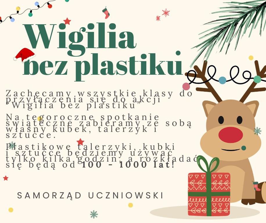 Z inicjatywy Samorządu Uczniowskiego w tym roku szkolnym dołączamy do akcji "Wigilia bez plastiku"