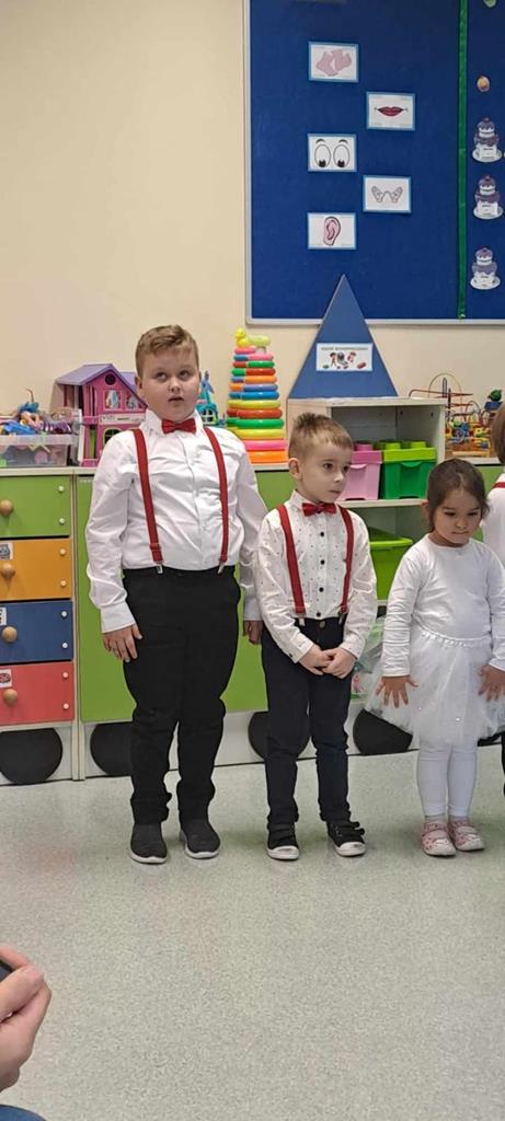 Nadszedł długo oczekiwany dzień. Dzieci z grup przedszkolnych wspólnie z wychowawczyniami panią Agnieszką i Emilią zaprosiły rodziców do przedszkola na montaż słowno- muzyczny.