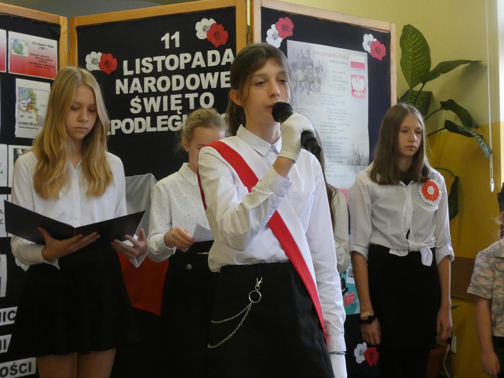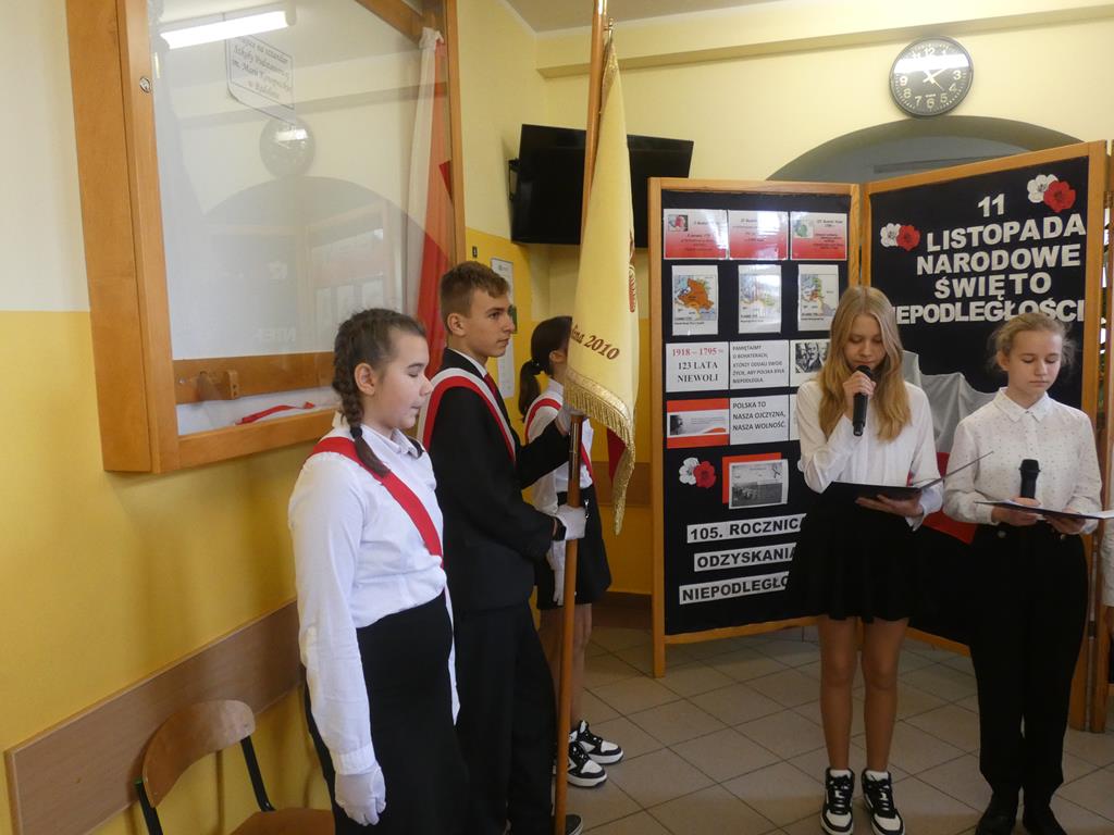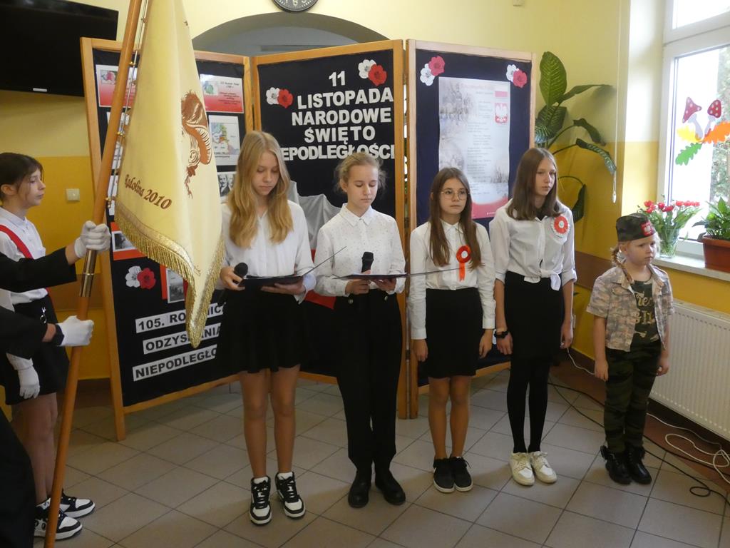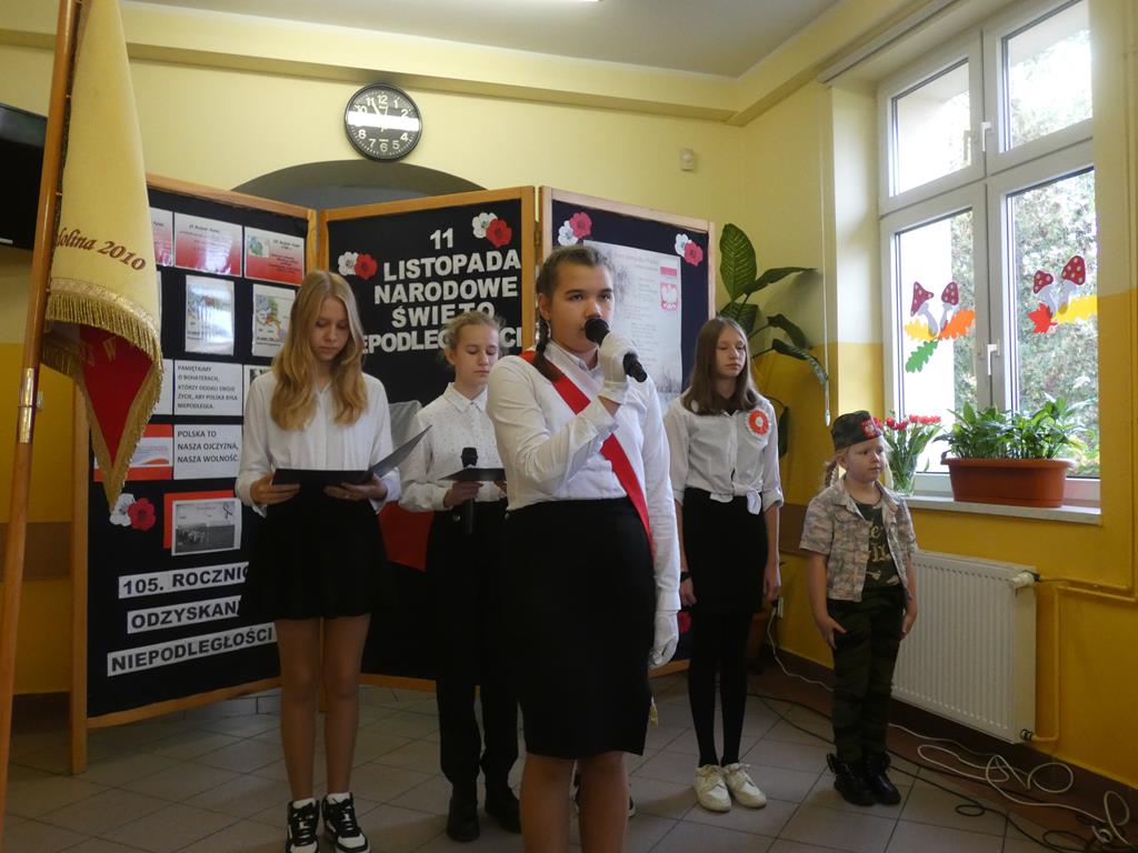 Społeczność Szkoły Podstawowej w Radolinie w piątek 10 listopada 2023r. podczas uroczystego apelu miała okazję upamiętnić 105. rocznicę odzyskania niepodległości przez Polskę. Jak co roku przystąpiliśmy do akcji „Szkoła do hymnu”, a następnie uczennice Wiktoria Urbańska i Zofia Wróbel przypomniały wszystkim zebranym trudne chwile naszej zniewolonej Ojczyzny. Dziewczęta z klasy siódmej pięknie wyrecytowały wiersze o tematyce patriotycznej. Mieliśmy również okazję wysłuchać pieśni patriotycznych w wykonaniu Vanessy Laskowskiej i Magdaleny Gauzy.