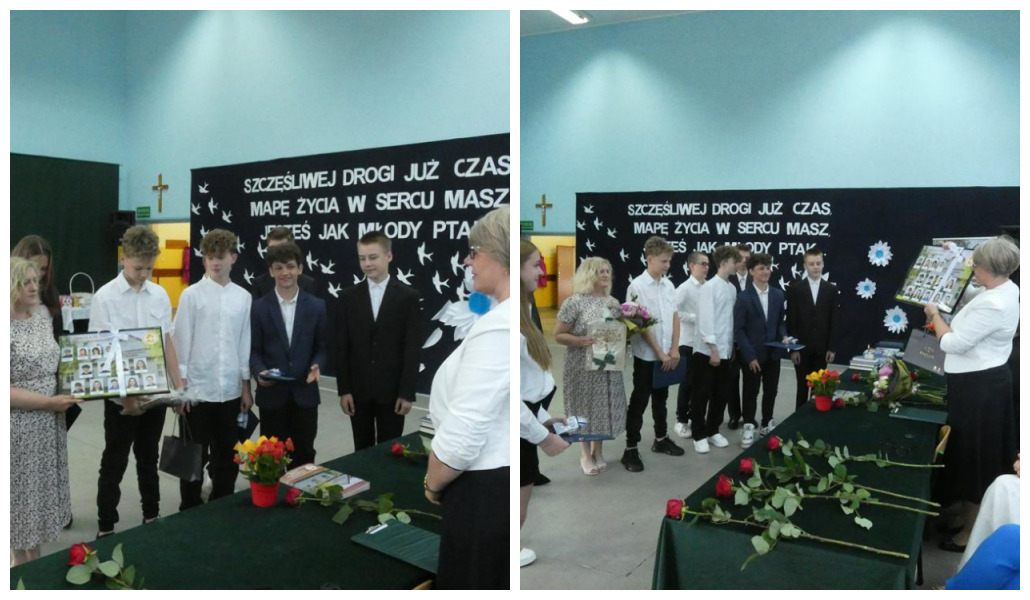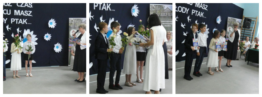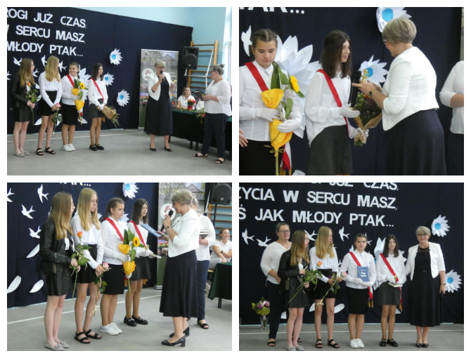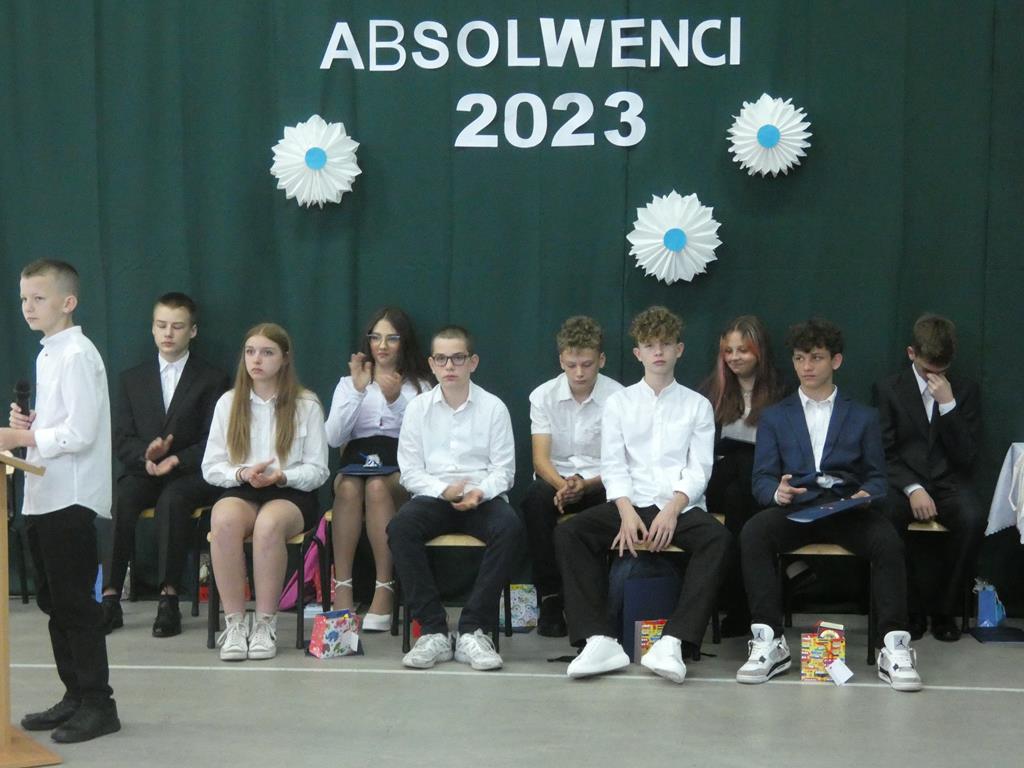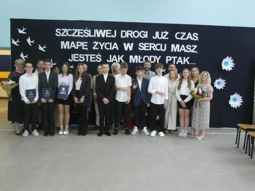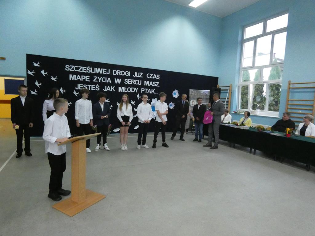 Podczas uroczystości odbyło się przekazanie sztandaru przedstawicielom klas młodszych. Pani Dyrektor wręczyła uczniom świadectwa z wyróżnieniem, a ich rodzicom okolicznościowe listy gratulacyjne. Nie zabrakło też nagród dla uczniów, którzy zostali „Supersportowcami Roku”. Rodzicom absolwentów podziękowano za ich pracę i zaangażowanie na rzecz szkoły. Następnie ósmoklasiści podziękowali pani Dyrektor, wychowawczyni, nauczycielom, pracownikom administracji i obsługi, a także swoim rodzicom za trud, życzliwość, wyrozumiałość, a przede wszystkim przekazaną wiedzę.
