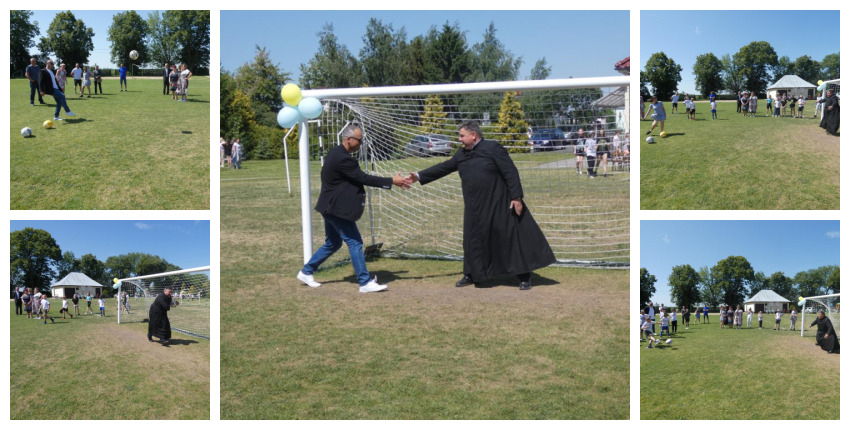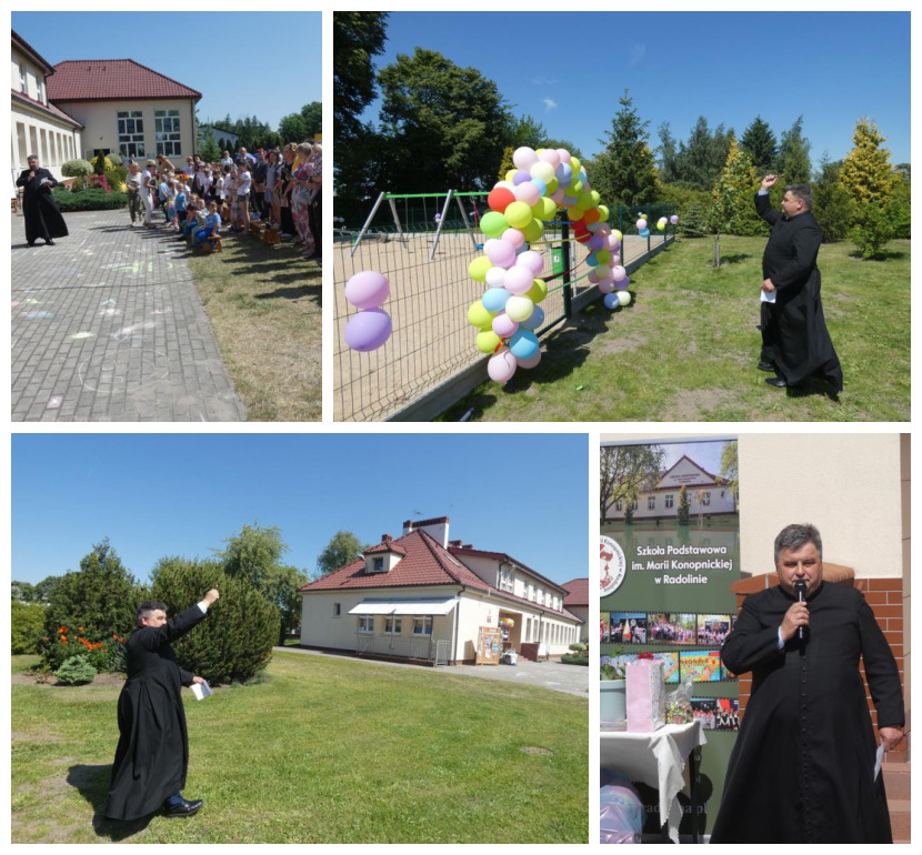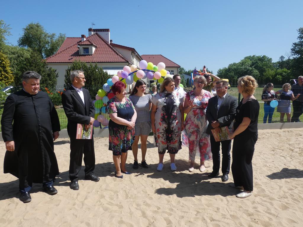 Następnie ks. Proboszcz Andrzej Czubaszewski poświęcił plac zabaw i boisko szkolne, po czym odbyło się przecięcie wstęgi, którego dokonali przedstawiciele przedszkolaków, władz samorządowych, radnych, rodziców oraz dyrektor szkoły i nauczycielka oddziału przedszkolnego. Symboliczne gole do bramki na nowym boisku szkolnym strzelili ks. Proboszcz, radni Rady Miejskiej, zastępca Kierownika Referatu Zamówień Inwestycji i Promocji Urzędu Miejskiego w Golinie oraz nauczyciel wychowania fizycznego i przedstawiciele uczniów.