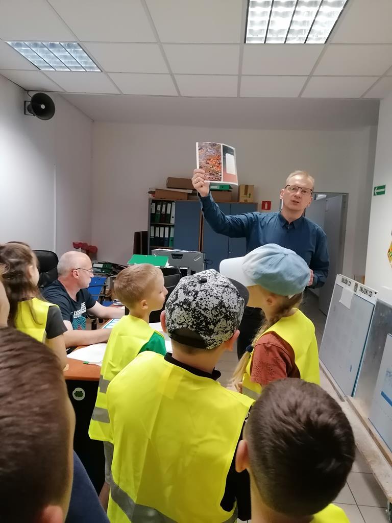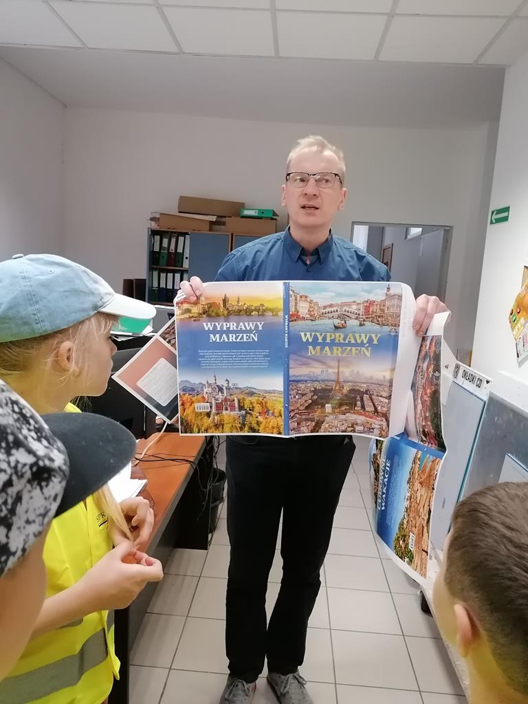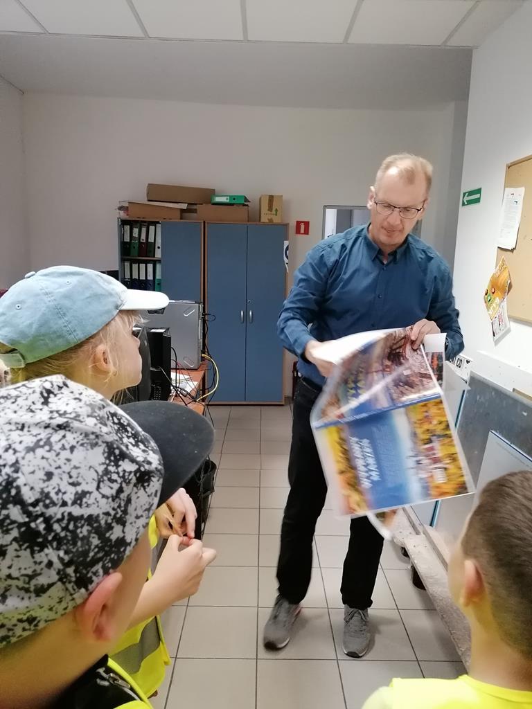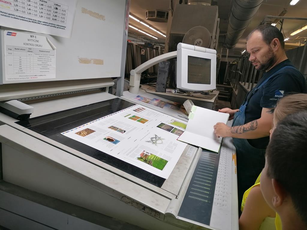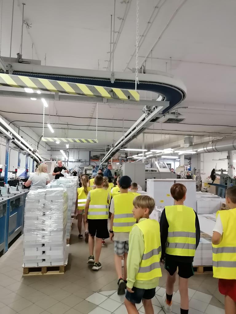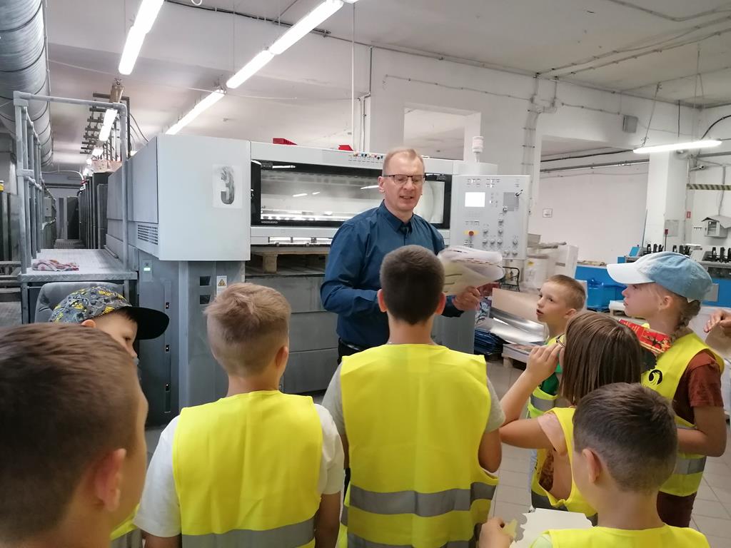 Pierwszym punktem wyjazdu była Drukarnia Trans – Druk , która mieści się Kraśnicy - Kolonii. Uczniowie klas młodszych zostały powitane przez Pana Jana Markaczewskiego, który pełnił rolę przewodnika i oprowadzał dzieci po różnych halach drukarni. Mogliśmy zobaczyć ogromne hale drukarni, w której wielkie maszyny drukują na ogromnych arkuszach papieru. oraz magazyny, gdzie odbywało się pakowanie gotowych już produktów i układanie ich na ogromnych regałach. Następną halą była introligatornia, gdzie uczniowie śledzili różne procesy składania książki w całość. W trakcie pobytu w drukarni dzieci obserwowały pracę maszyn, poznały ich nazewnictwo i znalazły odpowiedź na pytanie: „Jak powstaje książka?” Dzieci mogły zobaczyć profesjonalne maszyny poligraficzne ,a także pracę na hali produkcyjnej. Obserwowały proces drukowania tekstu, rozcinania papieru oraz składania i sortowania. Na zakończenie czekała na wszystkich miła słodka niespodzianka.