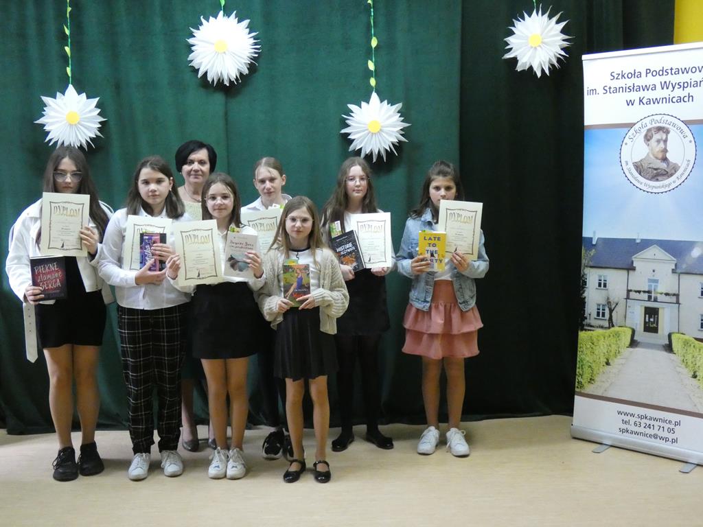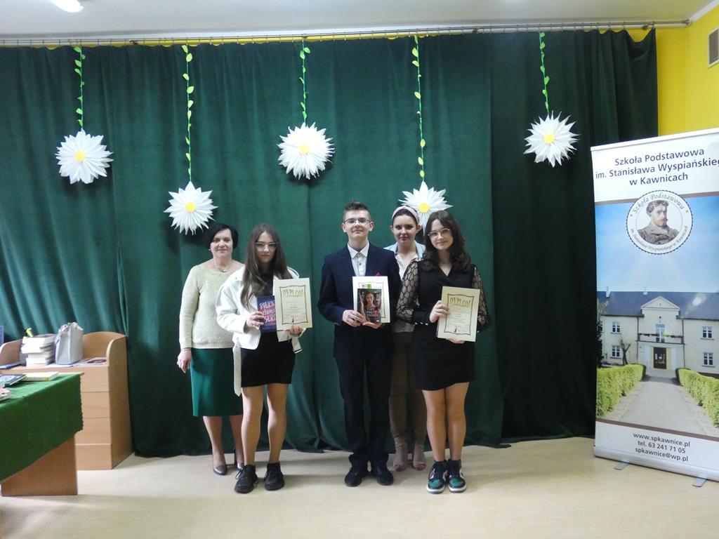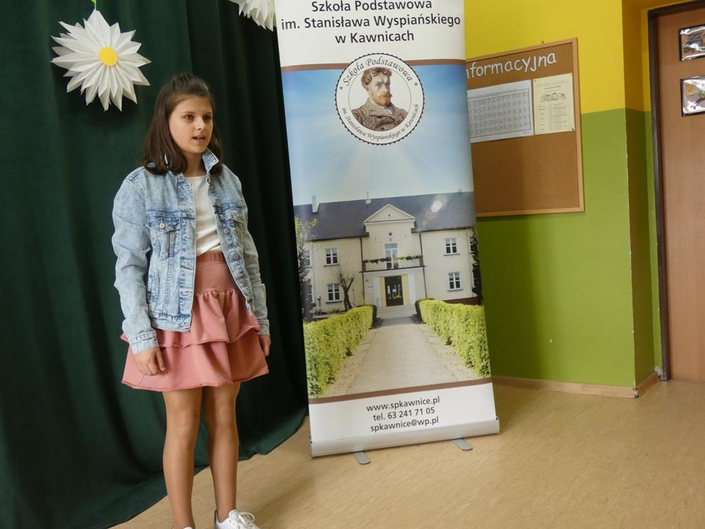 Dnia 17 kwietnia 2023 roku w Szkole Podstawowej im. Stanisława Wyspiańskiego w Kawnicach odbył się XII Gminny Konkurs Recytatorski ,,Wiosenne poezjowanie”. Naszą szkołę reprezentowało 7 uczennic: Nadia Kasprzyk, Nadia Szczepańska, Vanessa Laskowska, Oliwia Śrutowska, Dominika Grzesiak, Zuzanna Kurleto i Wioletta Tyderka.