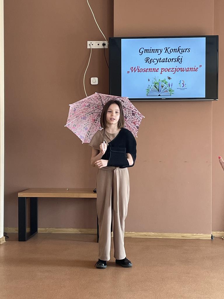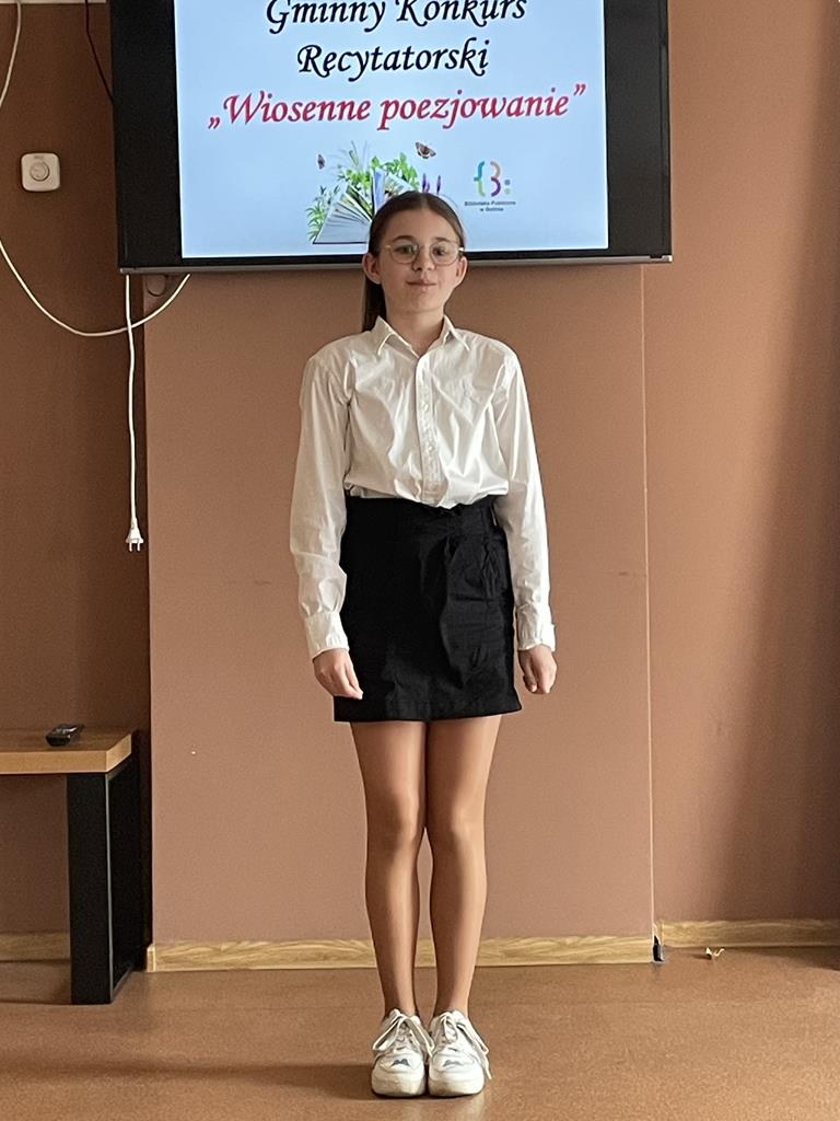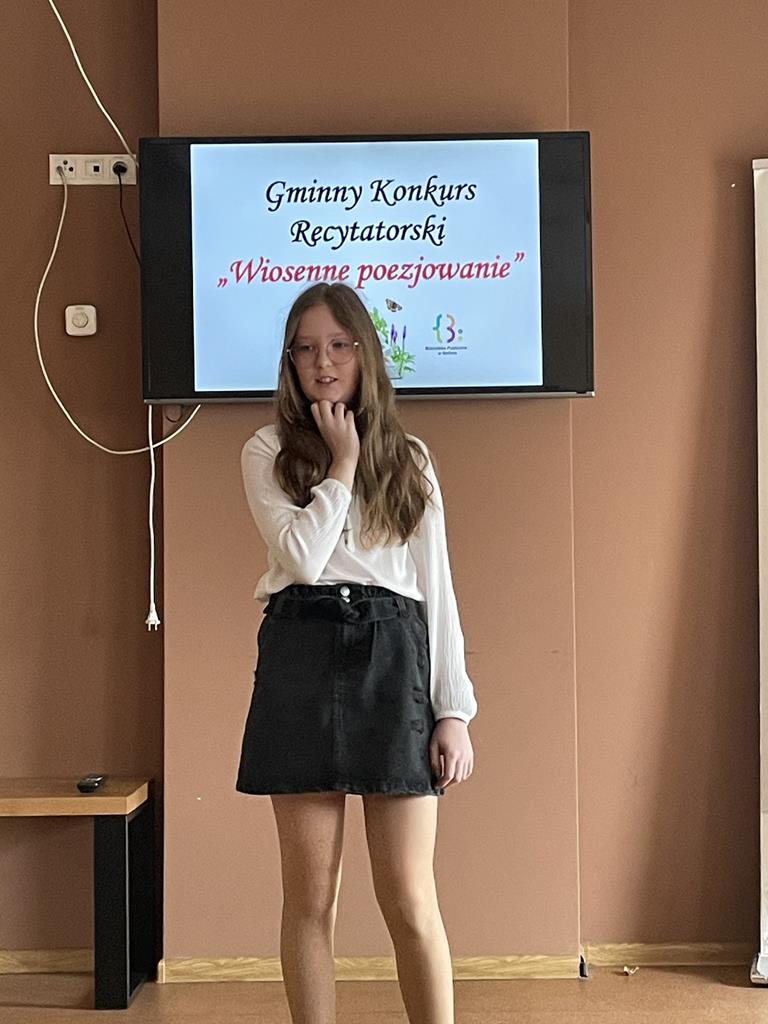 27 kwietnia b.r. odbyła się kolejna edycja Gminnego Konkursu Recytatorskiego „Wiosenne poezjowanie”, organizowanego przez Bibliotekę Publiczną w Golinie, skierowanego do uczniów szkół podstawowych z terenu gminy. Naszą szkołę reprezentowały: w kategorii klas I- III- Magdalena Gauza oraz Blanka Wilant, natomiast w kategorii klas IV- VI- Nadia Szczepańska, Vanessa Laskowska oraz Zuzanna Kurleto.
