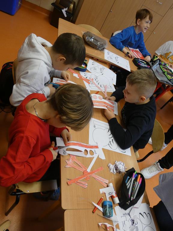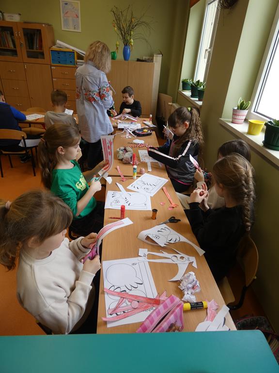 Kolejnym punktem dnia były warsztaty plastyczne w których uczestniczyły dzieci z oddziałów przedszkolnych oraz uczniowie klas I – III. Zadanie polegało na wykonaniu papierowego bociana. Koordynatorem warsztatów były Pani Bernadeta Kucharska oraz Pani Emilia Napierała.