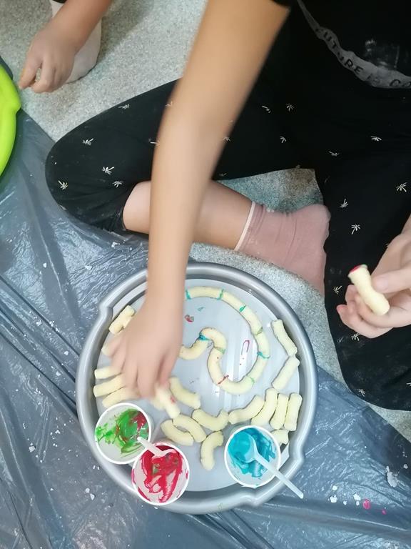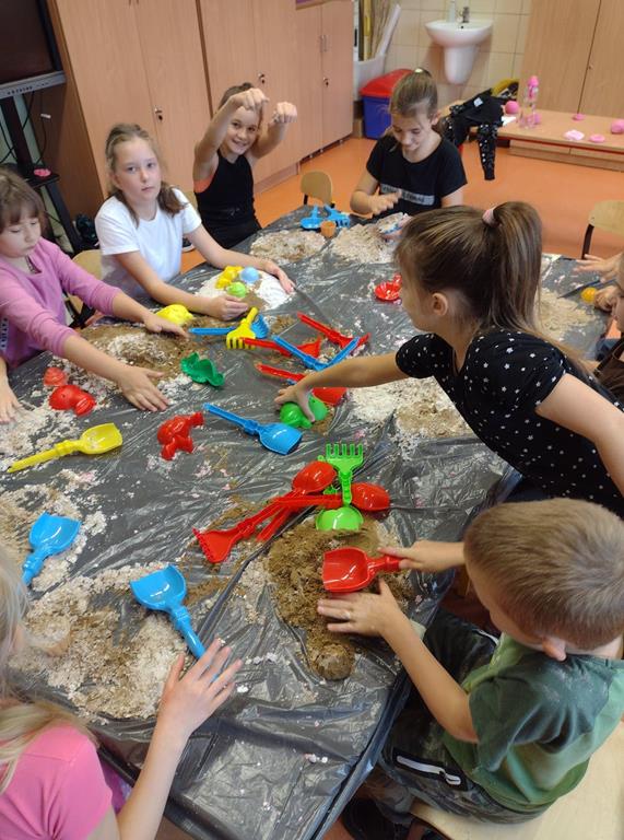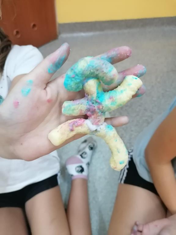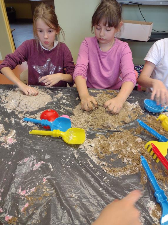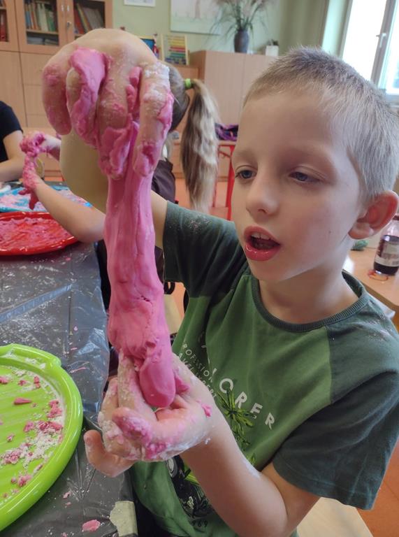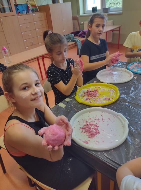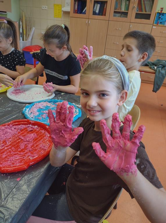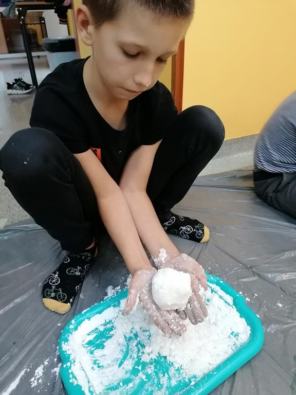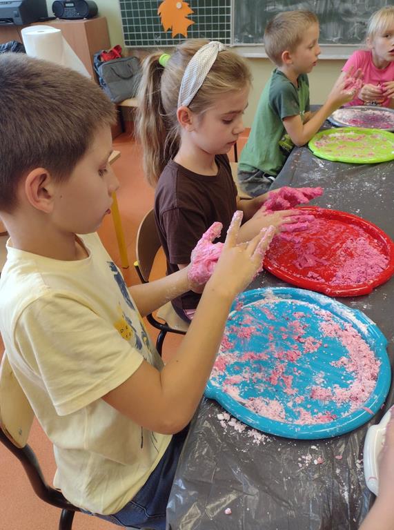 Na zajęciach z plastyki sensorycznej, które są prowadzone przez p. Bernadetę Kucharską i p. Magdalenę Lewartowską dzieci łączą świetną zabawę z wszechstronnym rozwojem, ponieważ całym ciałem doświadczają aktywności: brudzą się, tworzą rozmaite masy plastyczne, piasek kinetyczny, smakują, dotykają i wąchają, a przede wszystkim mają niebywałą okazję poznać niekonwencjonalne środki wyrazu. Mogą eksperymentować, a co najważniejsze: dobrze się bawić i relaksować.